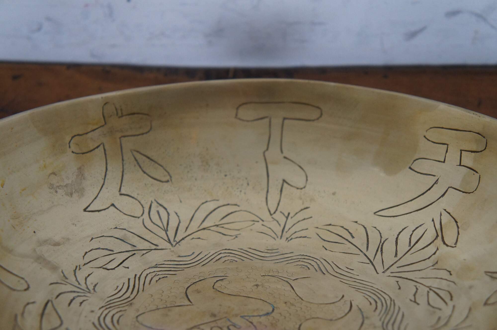 Vintage brass Chinese centerpiece bowl or compote etched on the interior with Chinese calligraphy and around the outside with two dragons / phoenix.