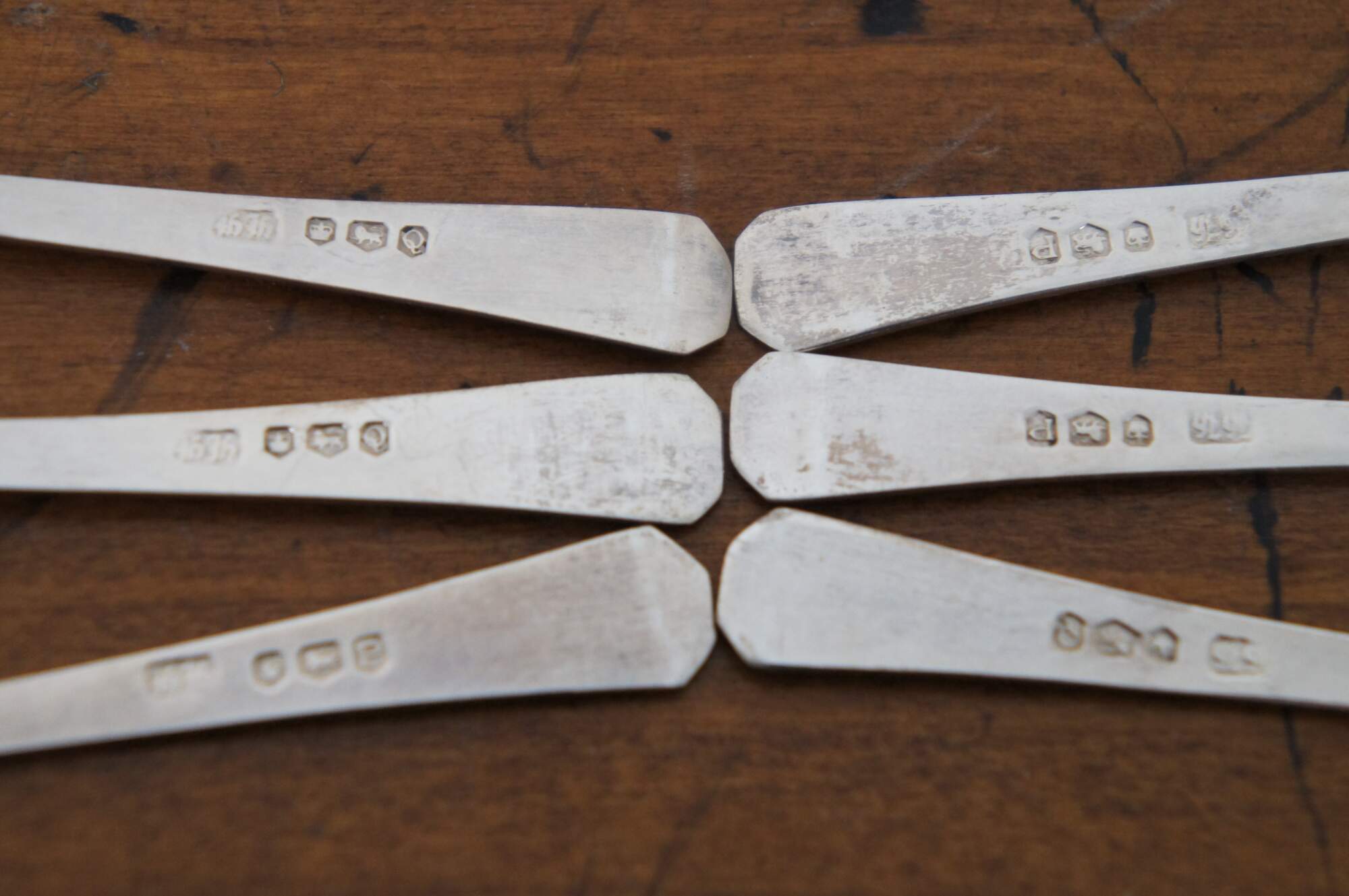 Vintage 1957 - 1958 boxed set of six sterling silver coffee / demitasse spoons. Made in England and marked with Gothic letters HH in rectangular cartouche.