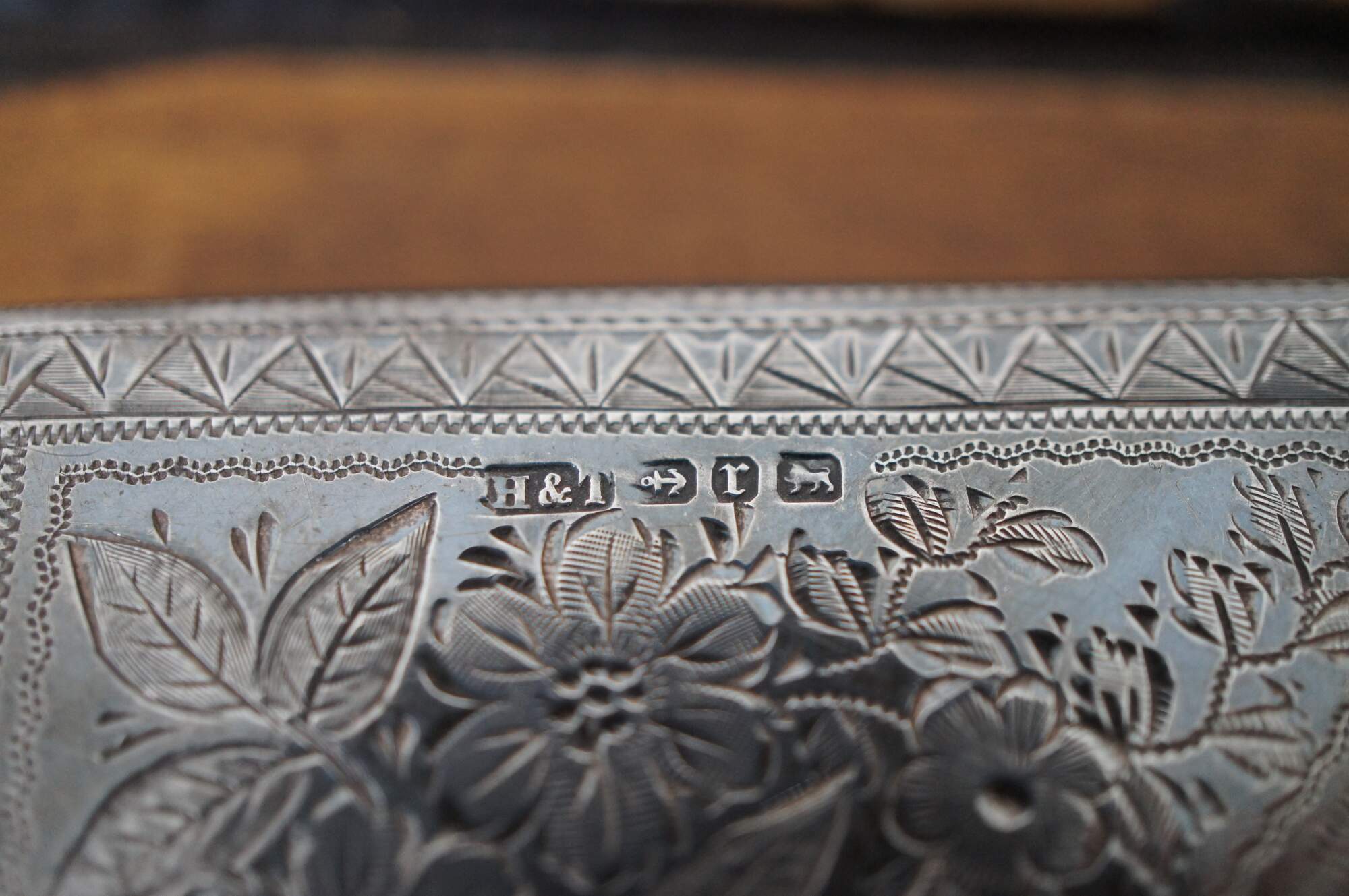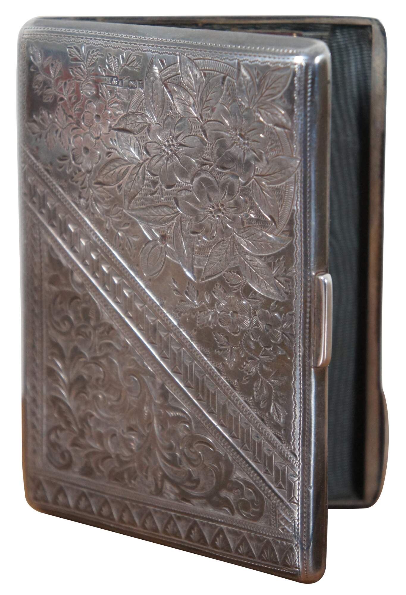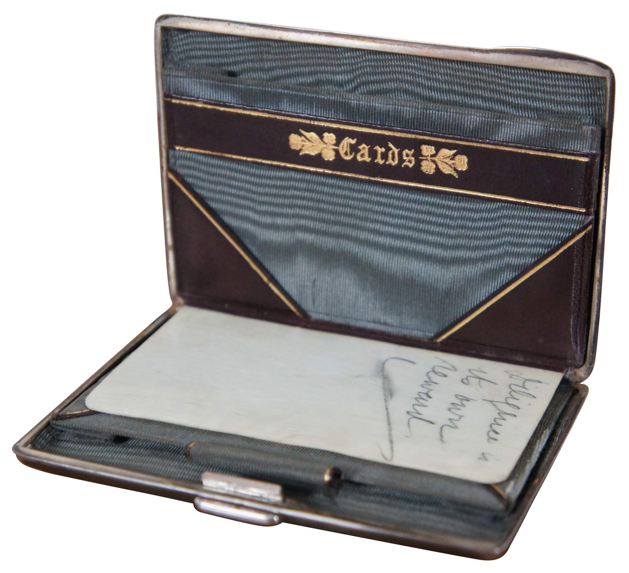 Antique 1891 sterling silver notebook / calling card / business card case / aide memoire with etched floral pattern exterior, cadet blue silk lining sporting two card holding compartments, a loop for a small pencil, gold stamped leather details, and a thin bone note pad (use demonstrated by affirmation left by previous owner (Diligence? is its own reward) and residue from other erased notes). Crafted in Birmingham, England by Hilliard & Thomason.