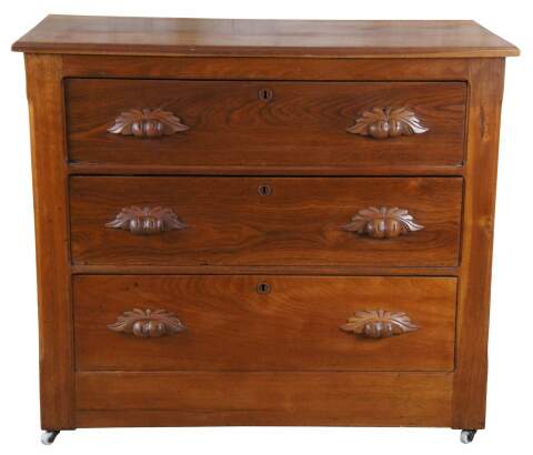 A beautiful American Victorian era dresser. Made from walnut with three dovetailed drawers and chamfered corners. The drawers are dovetailed via the Knapp Joint. Features carved fruit and nut pulls and porcelain casters.
