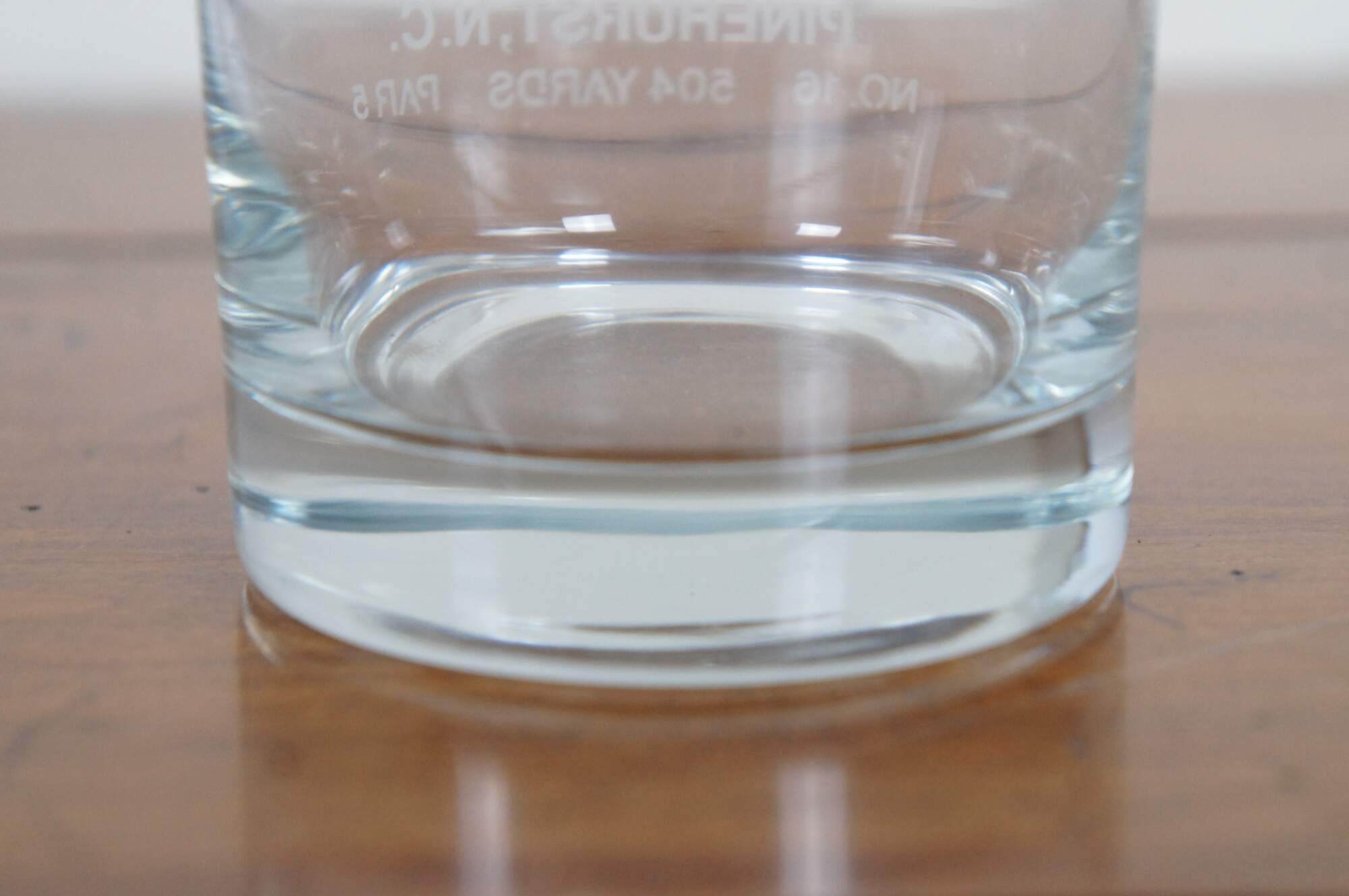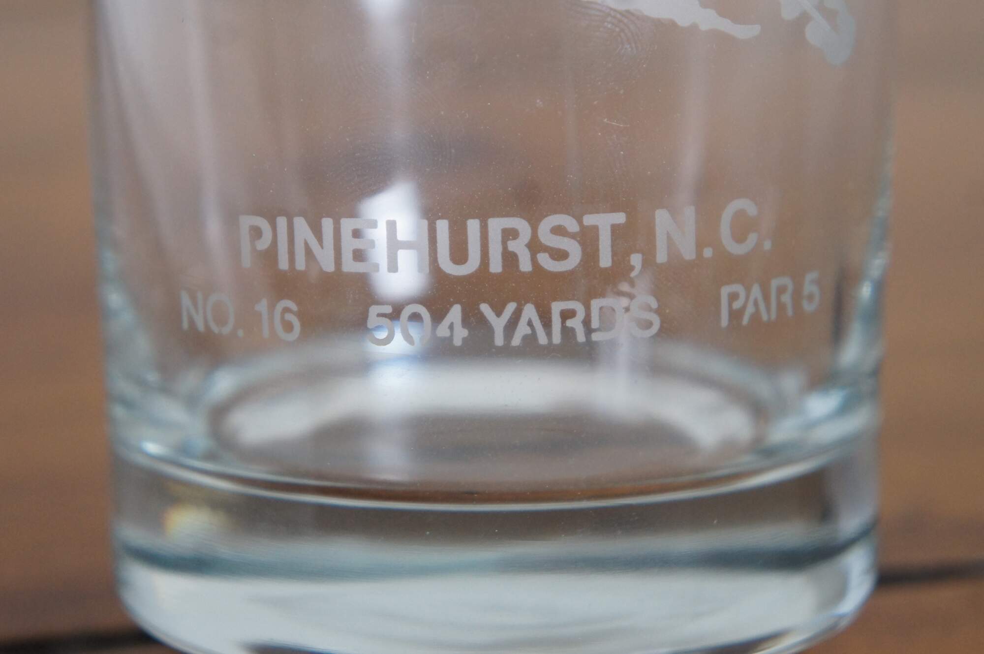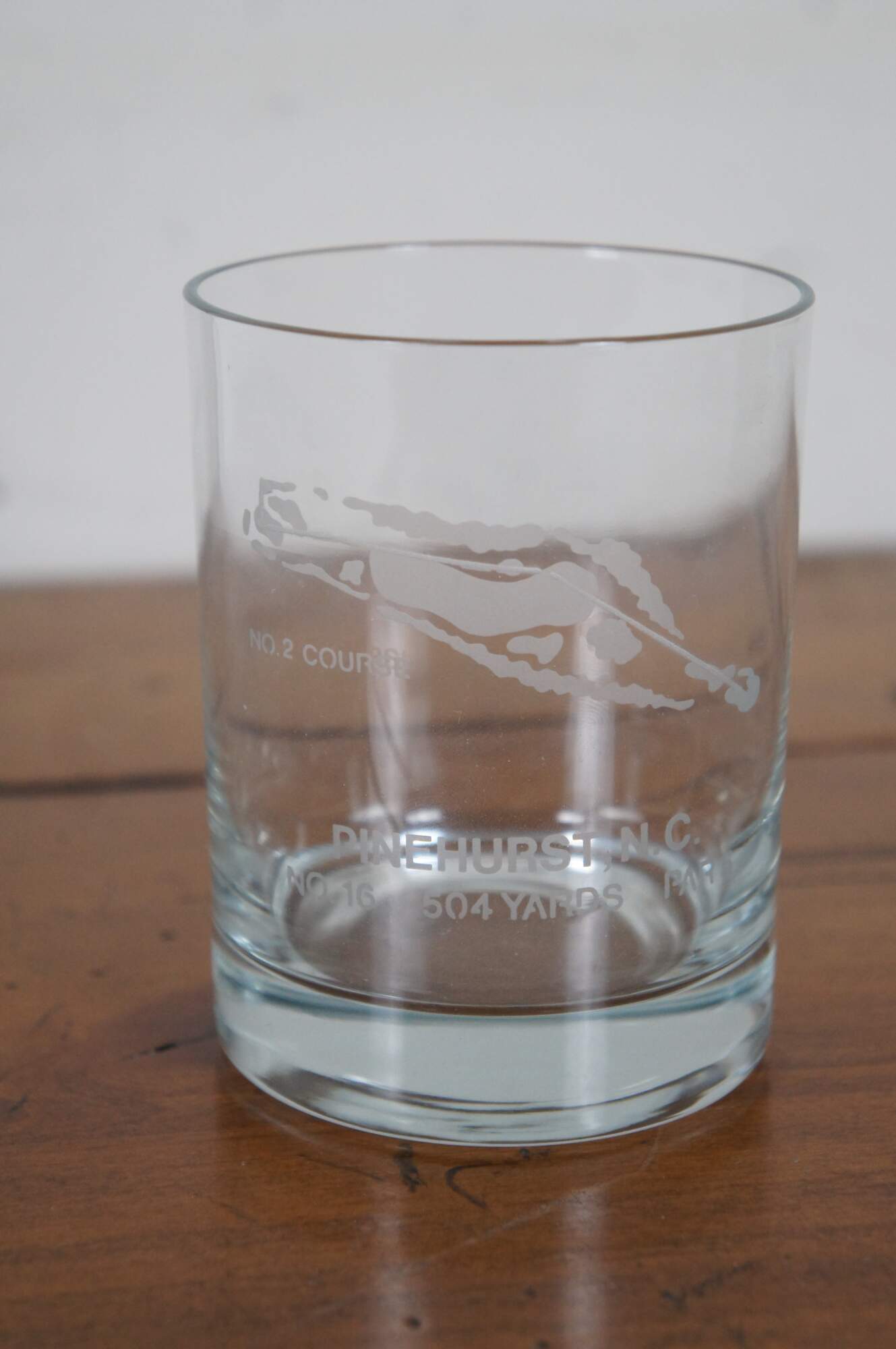 Souvenir rocks glass with frosted design showing the landscape of hole Number 16 at the Pinehurst Golf Course No. 2 of Pinehurst, North Carolina.