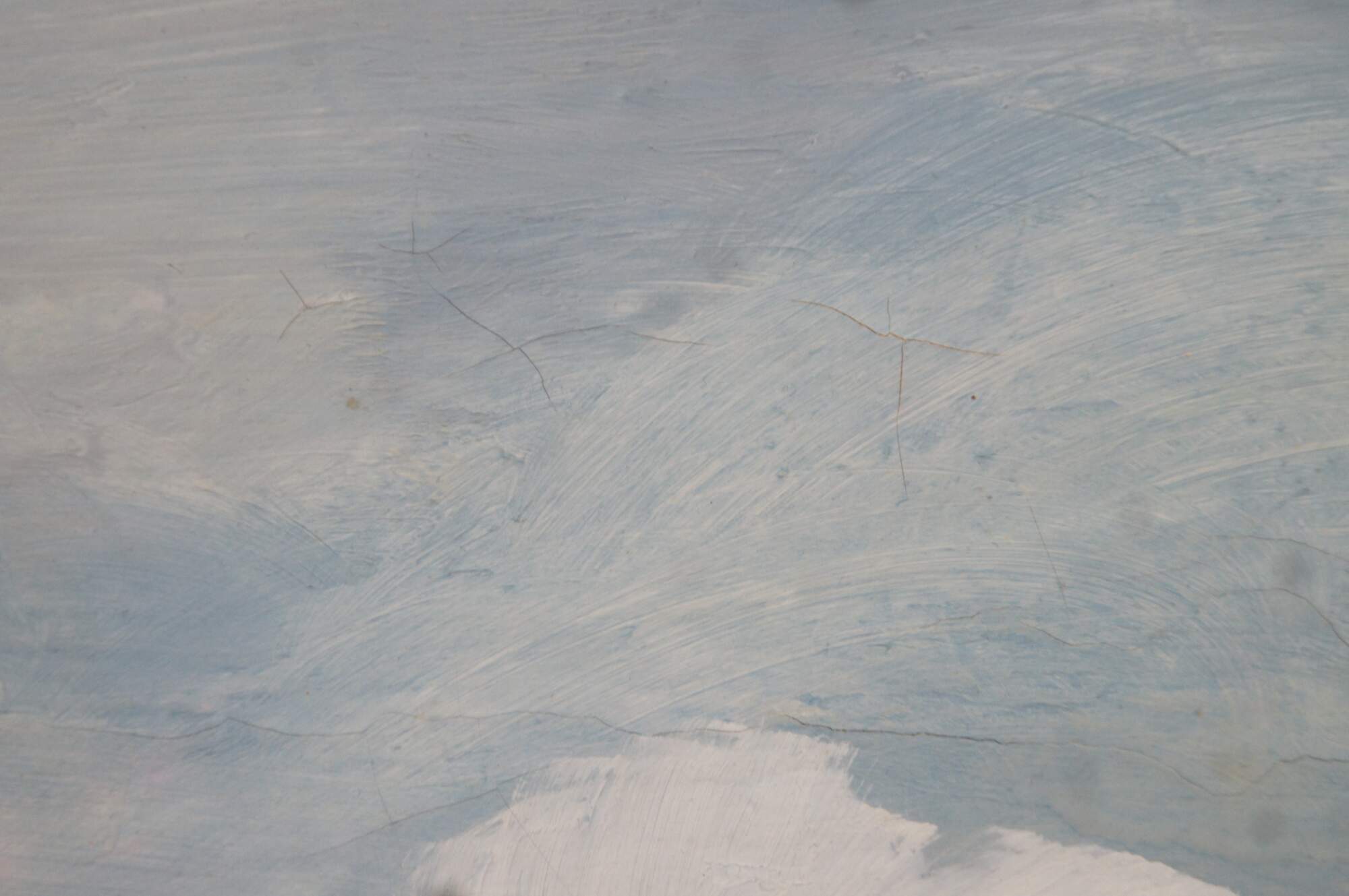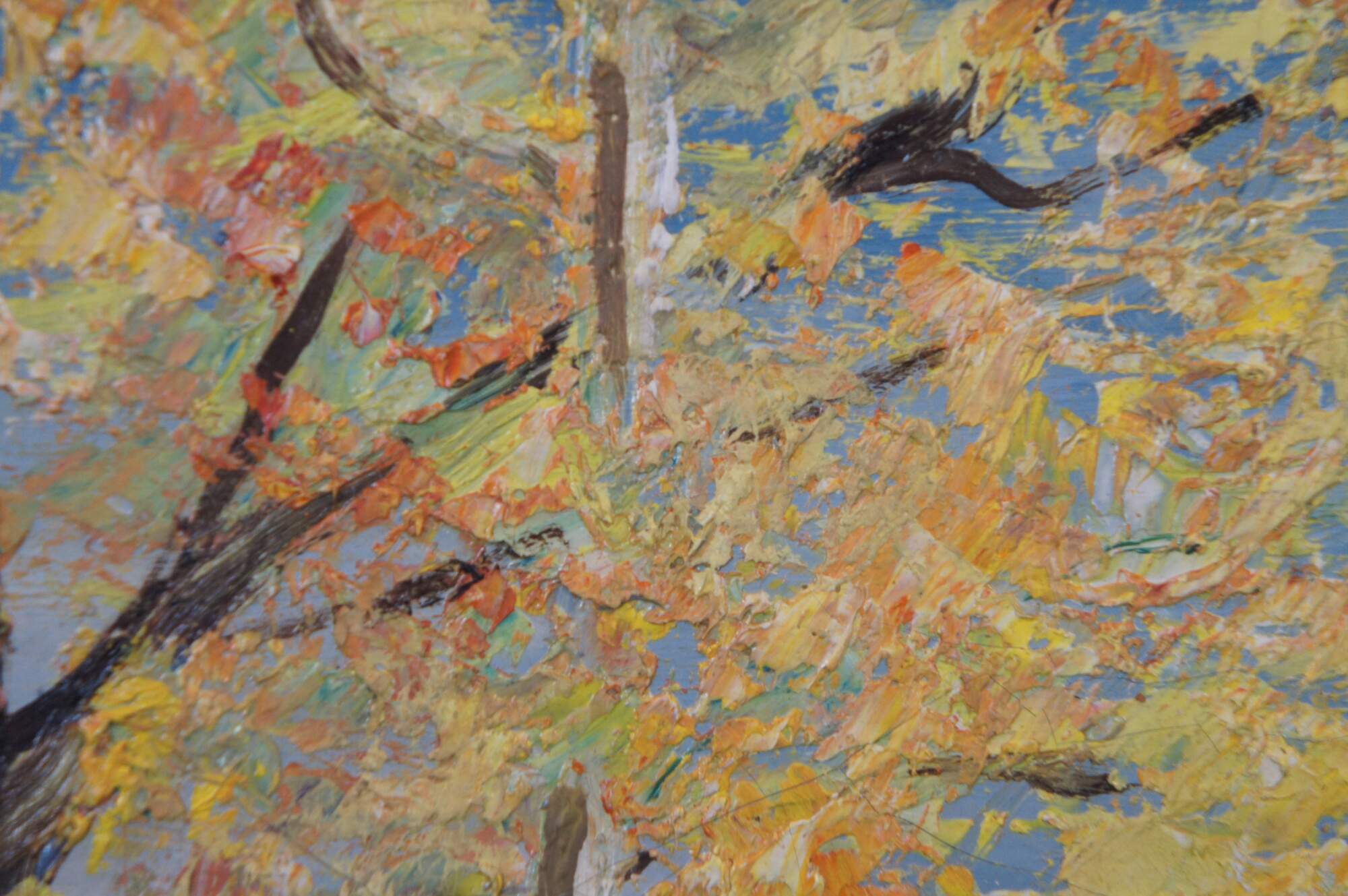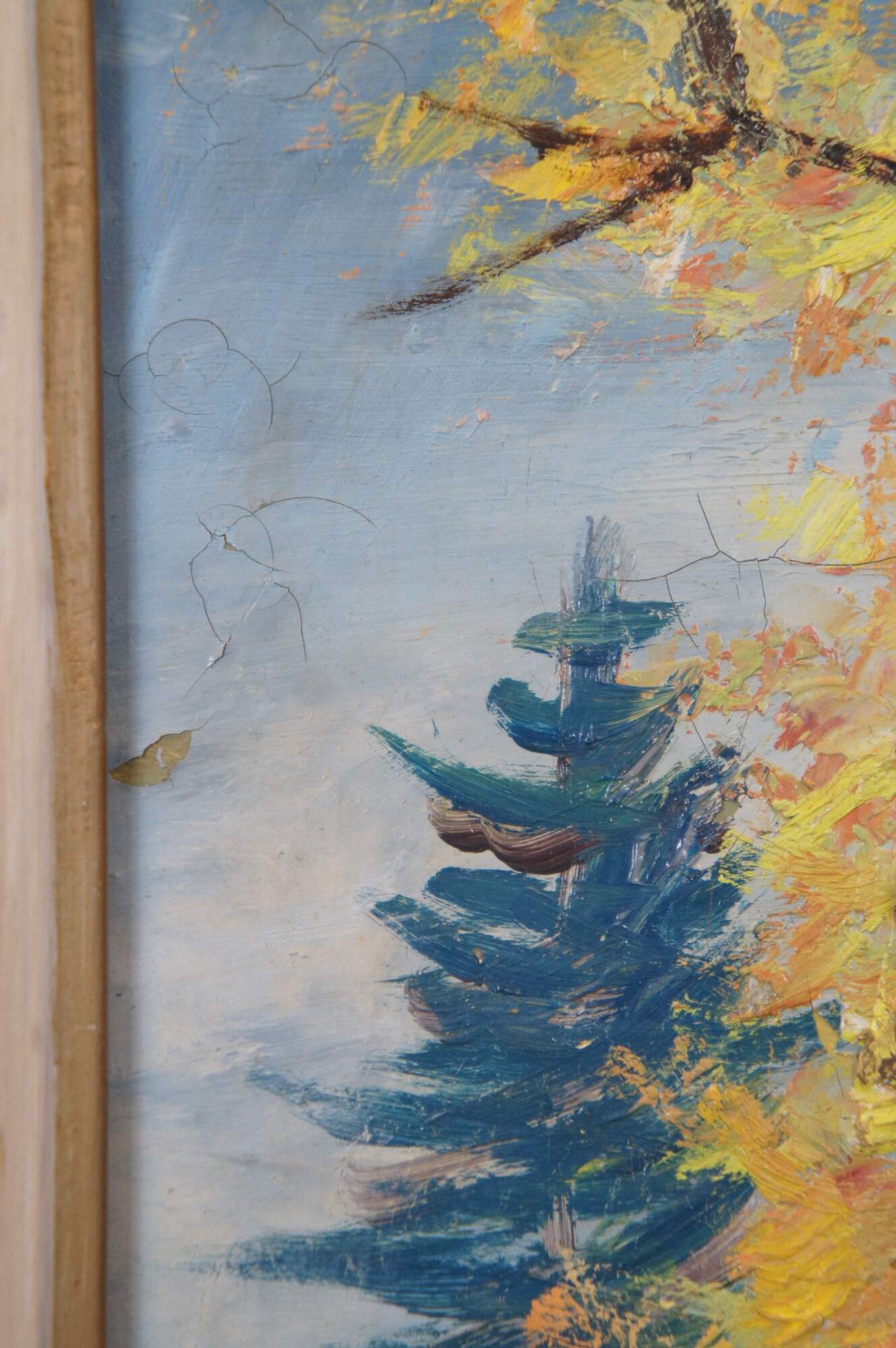 Vintage oil on canvas painting of a lake surrounded by autumn trees with mountains in the background, signed Modena in the lower right.
