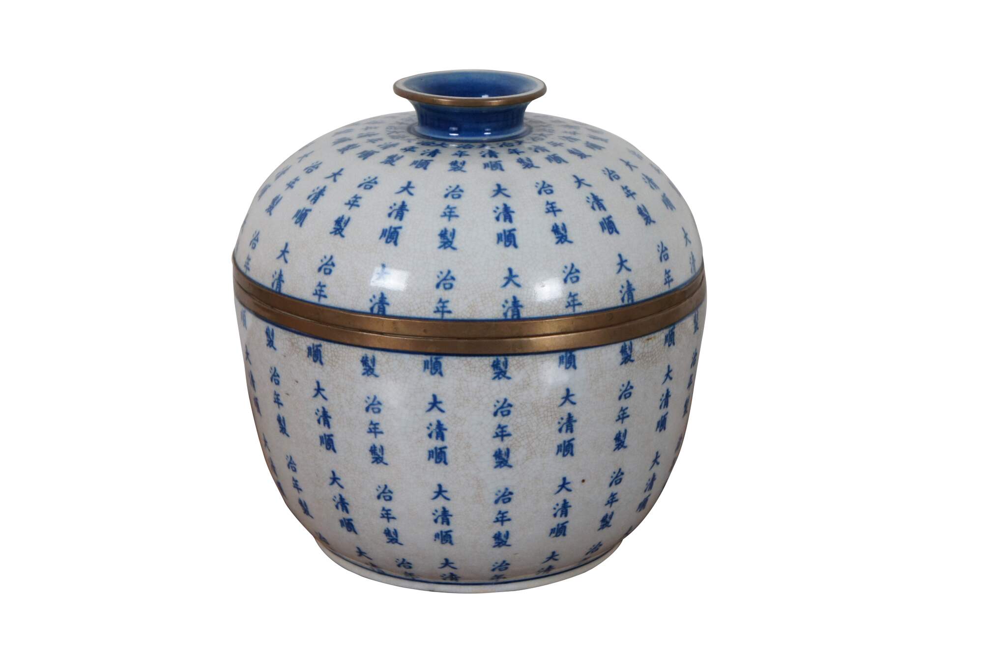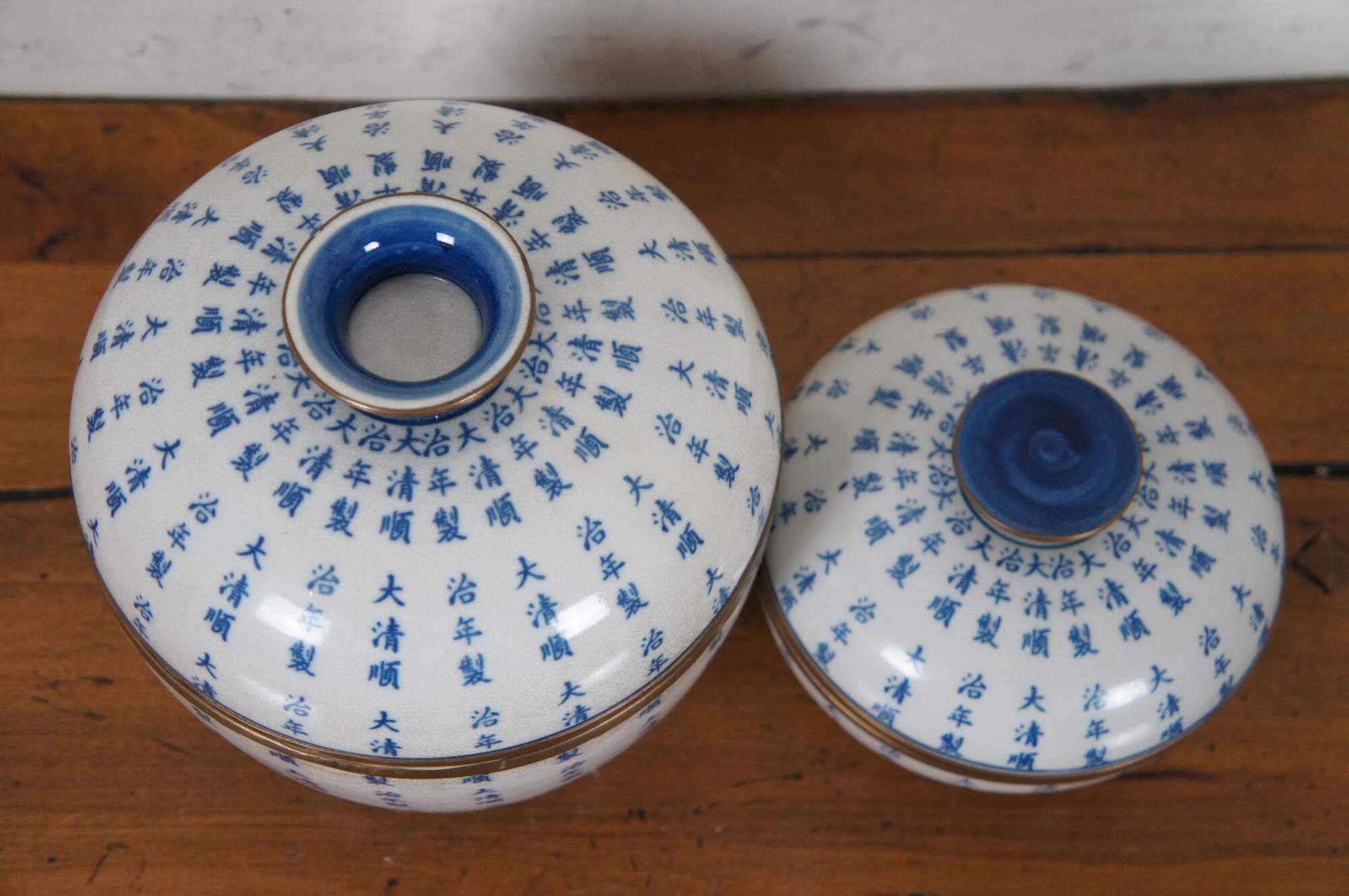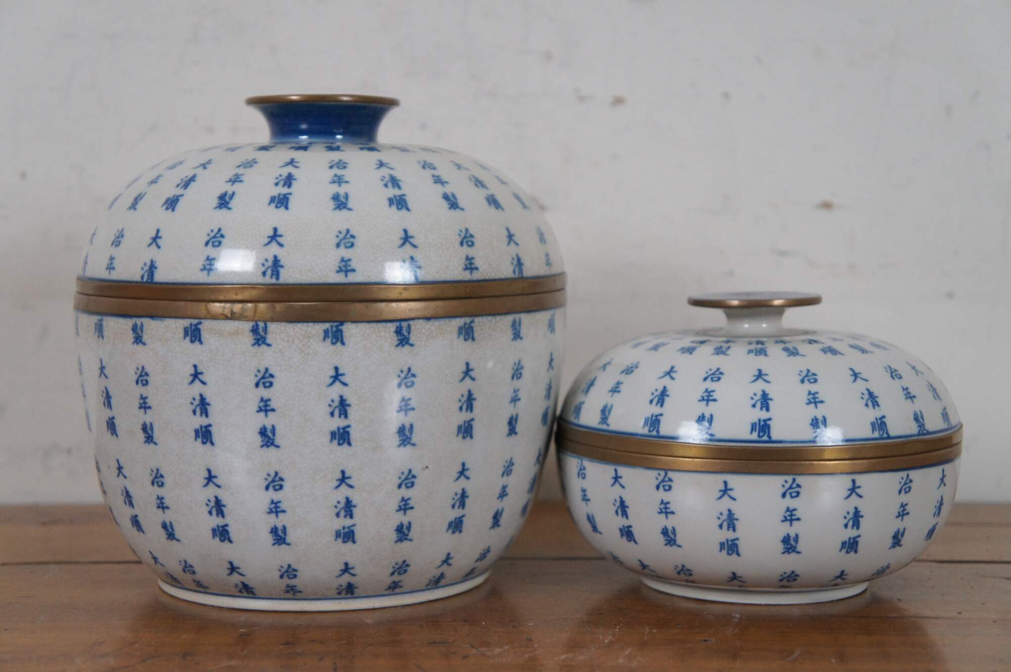 Pair of 20th century blue and white porcelain Chinese export ginger jars. Features a body covered in calligraphy with metal mounts. Each bears a Qing Dynasty mark.