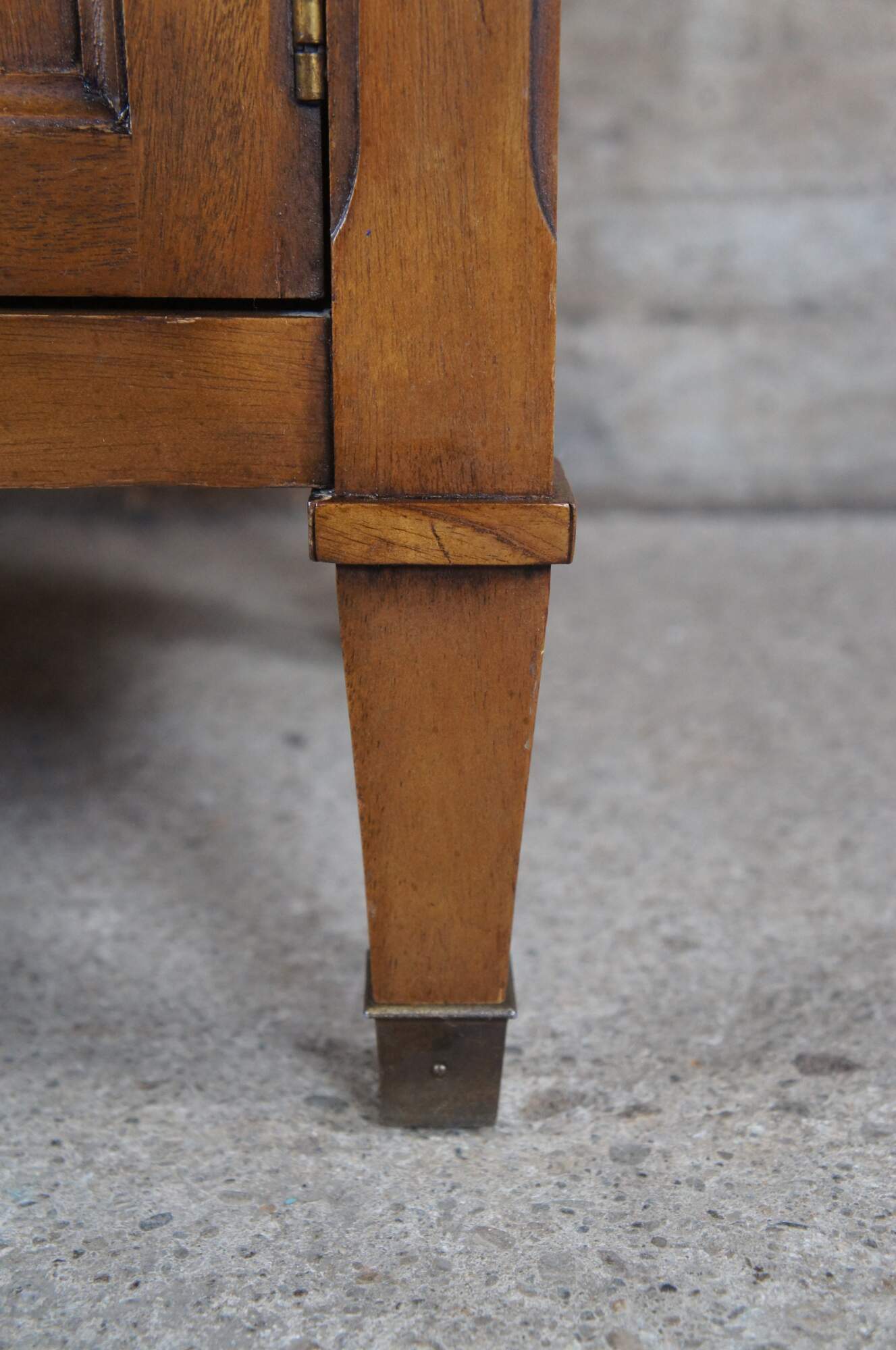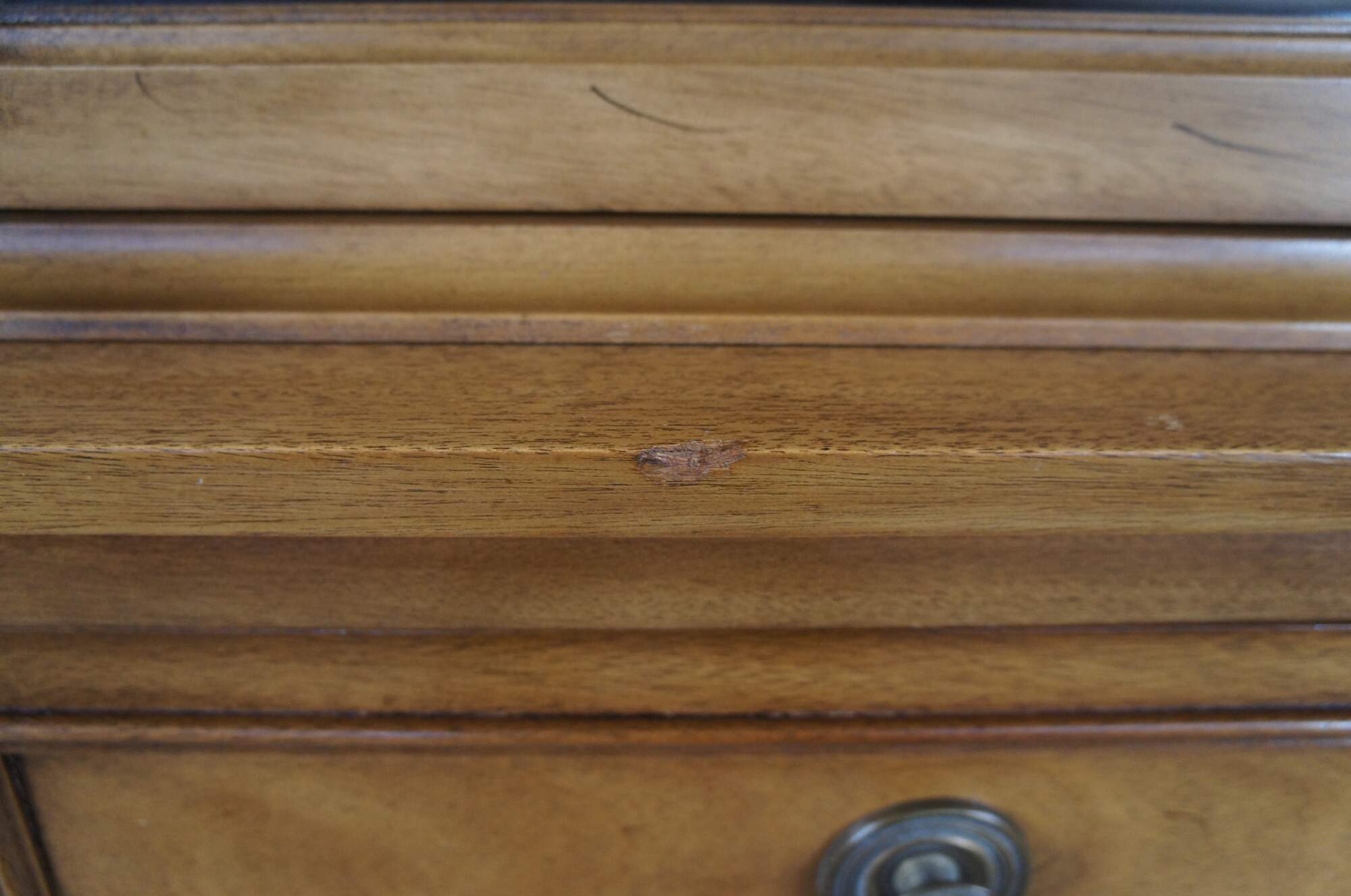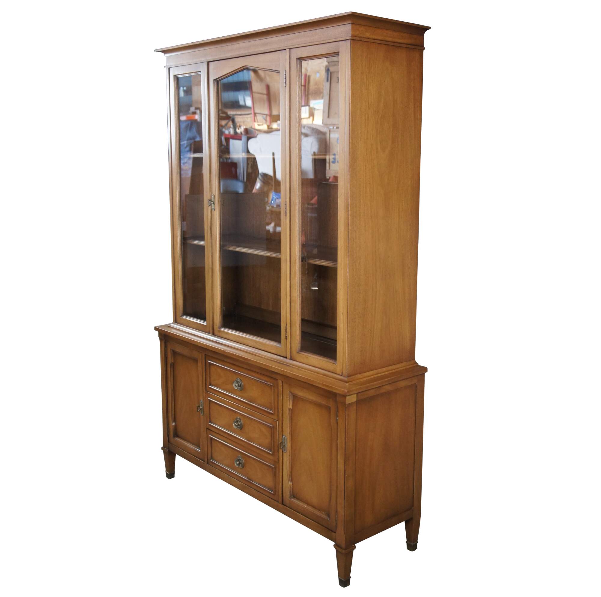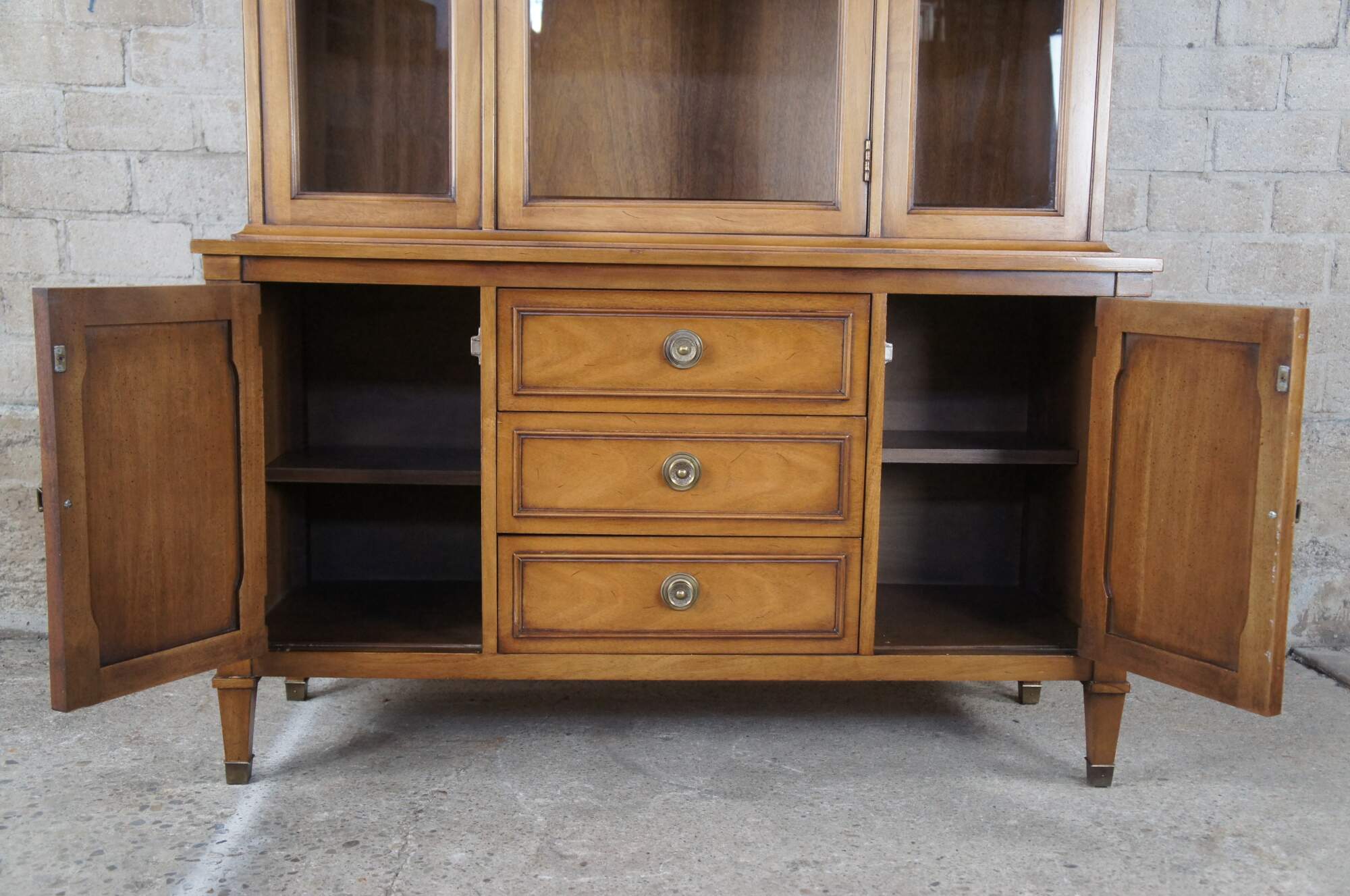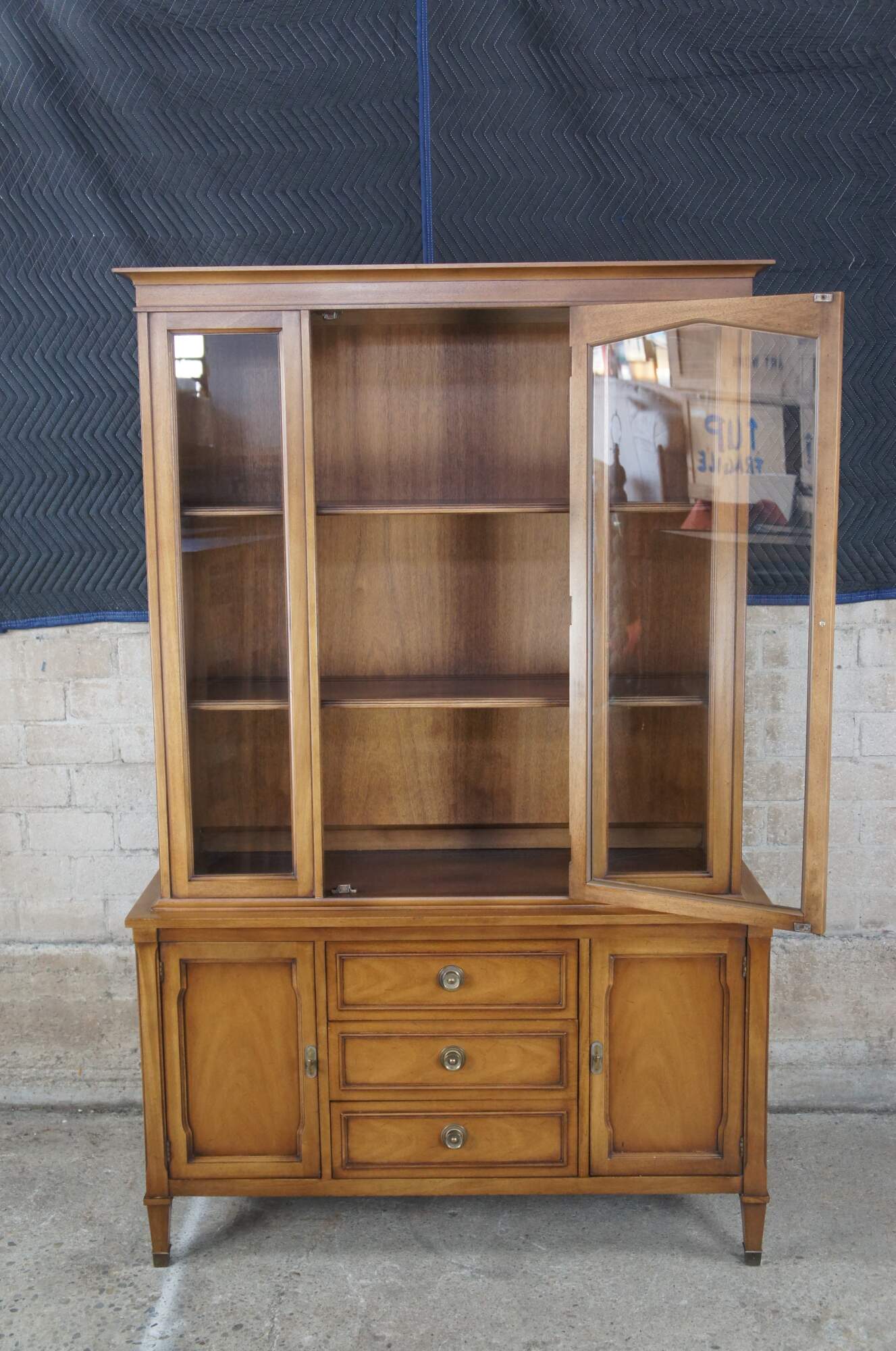 Vintage Drexel Triune china cabinet. Made of mahogany featuring upper curio with two shelves and plate grooves, and a lower cupboard with two doors and three drawers. Circa 1967. 555-420-2.