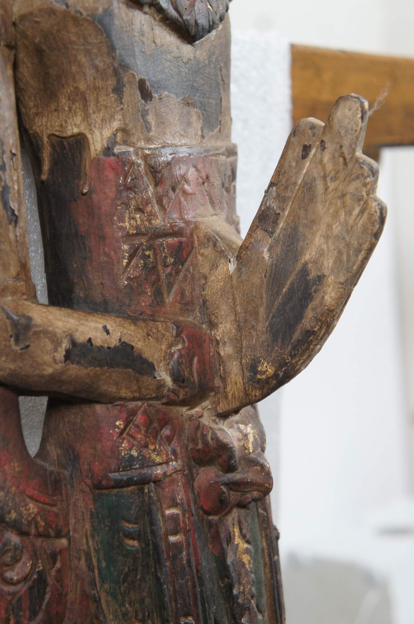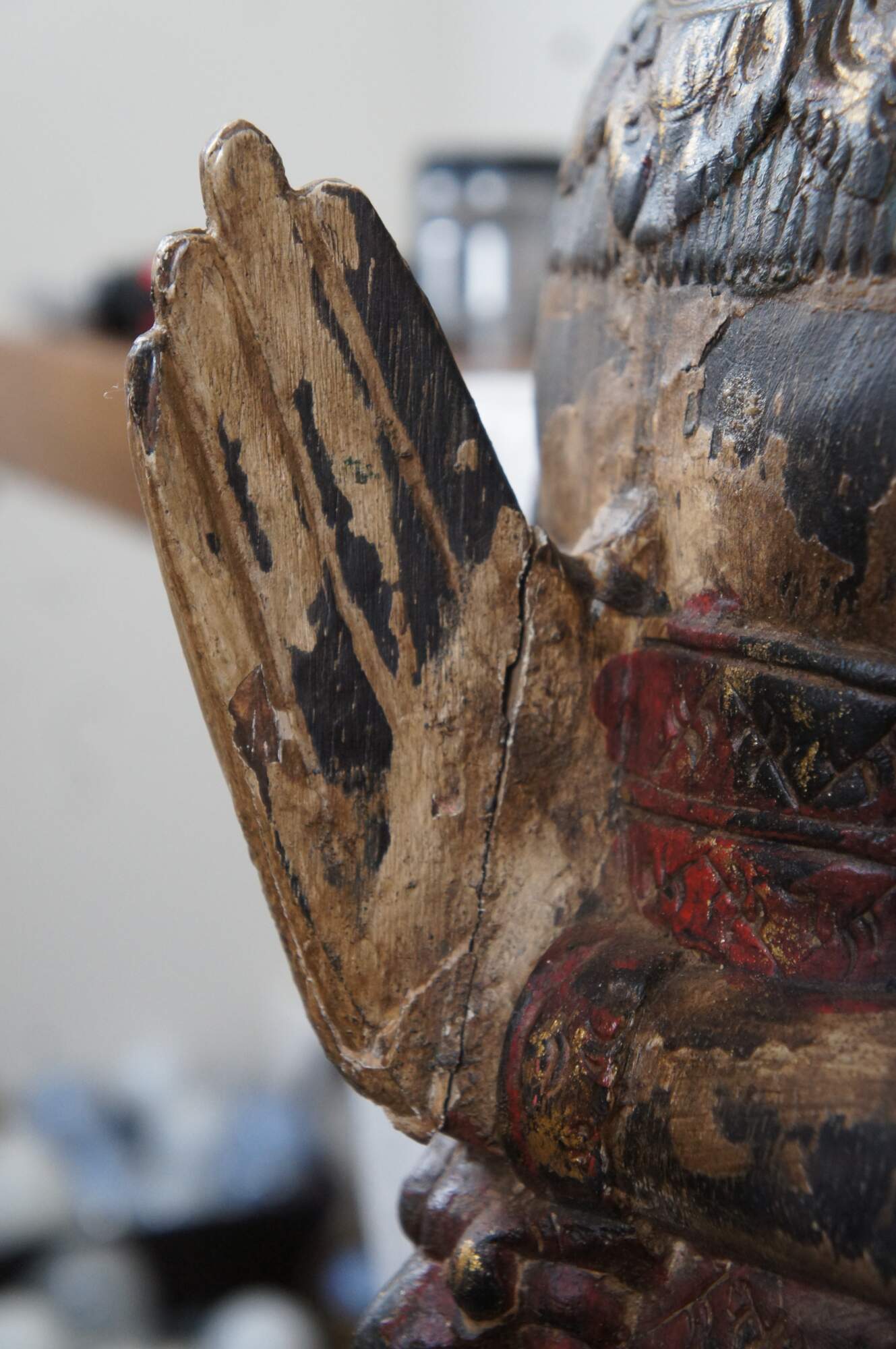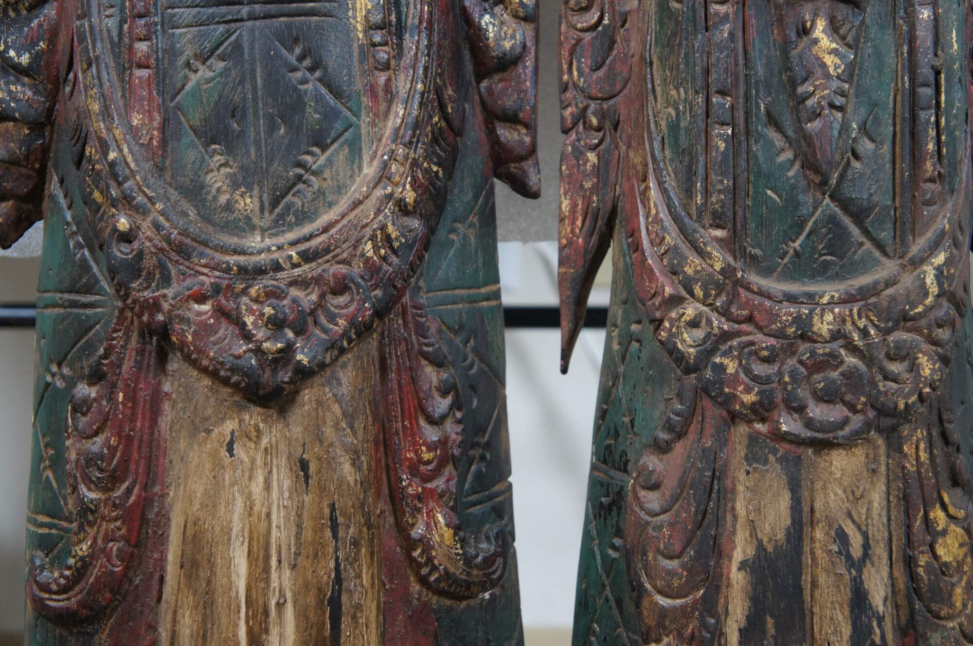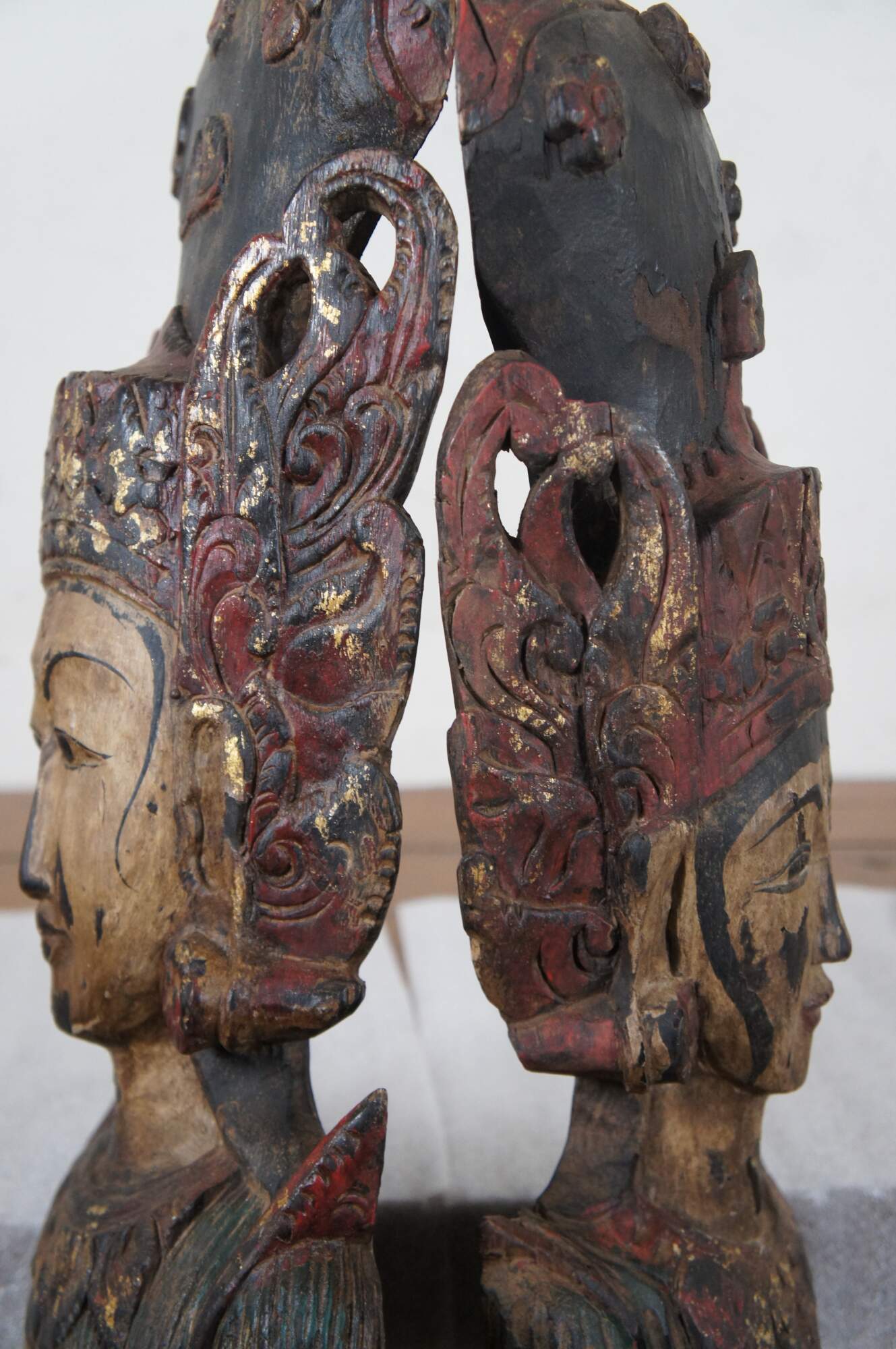 Pair of vintage 20th century carved wall hanging Thai religious deity / angel figures, one male and one female. Hand carved and painted featuring traditional thepphanom / thephanom pose, which is a Thai term referring to a devata performing the Añjali Mudrā praying hand gesture.