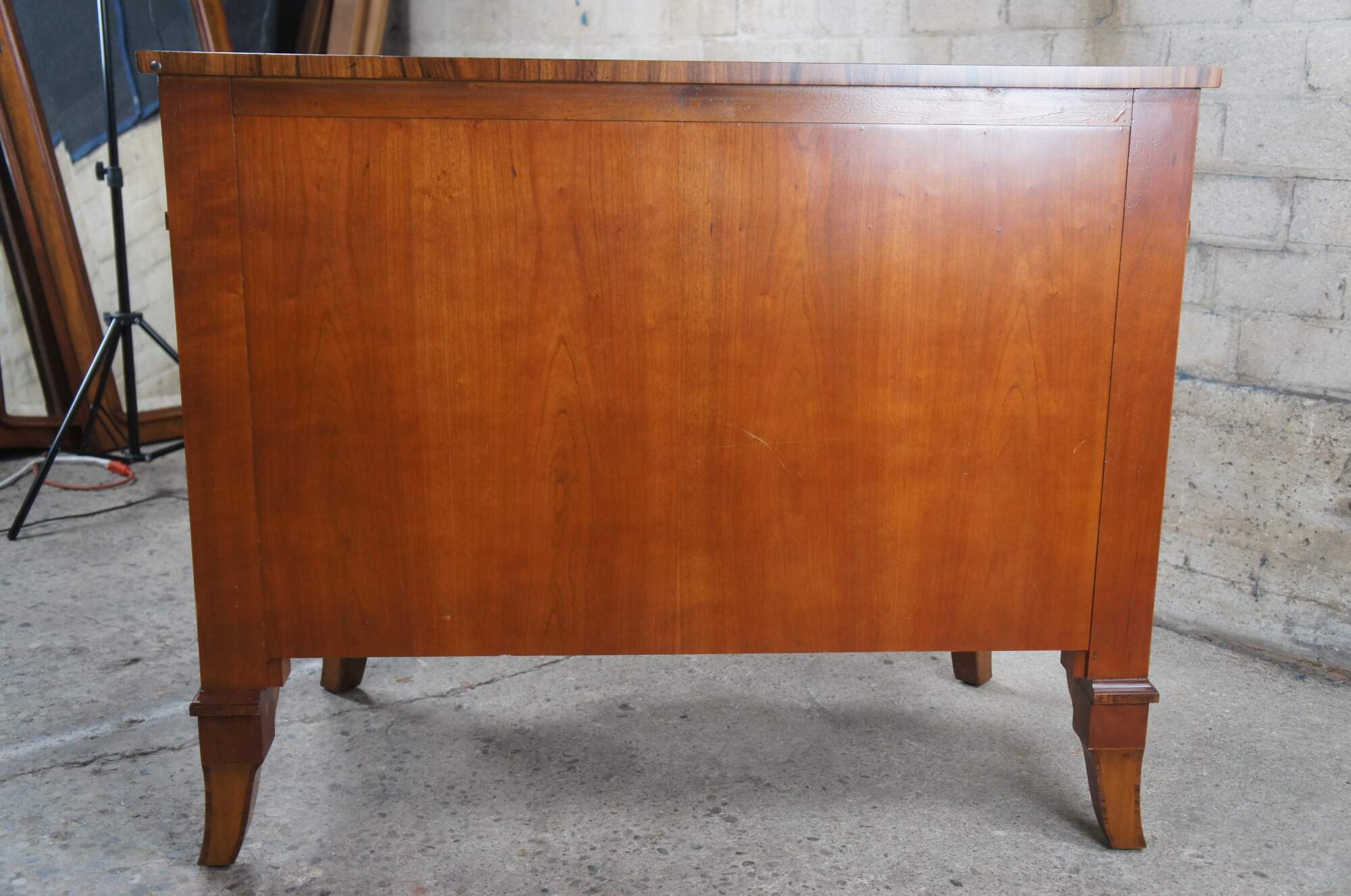 A spectacular English George III style chest of drawers by Baker Furniture. Part of the Stately Homes Collection, circa last quarter 20th century. The Stately Homes Collection encompasses recreations from furniture in palaces and castles of England, Russia and beyond. Made from Satinwood with crossbanded mahogany over a serpentine frame with canted angles. Features three graduated dovetailed drawers. Drawer fronts are centered by a ribboned floral marquetry inlay and flanked by pierced brass drawer pulls. The shapely top has impressive marquetry inlay with medallions and continuous tulips making up the shape of a flower. The case is raised over splayed feet and has a naturally Distressed finish. Marked Baker along the inside of uppermost drawer. Great for use as an entry console or dresser.