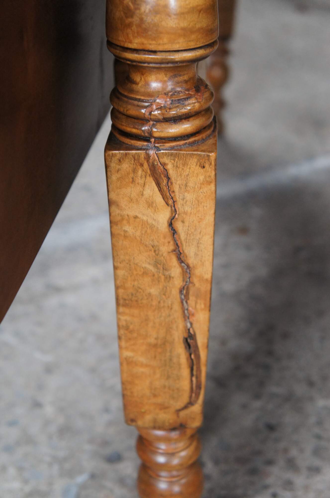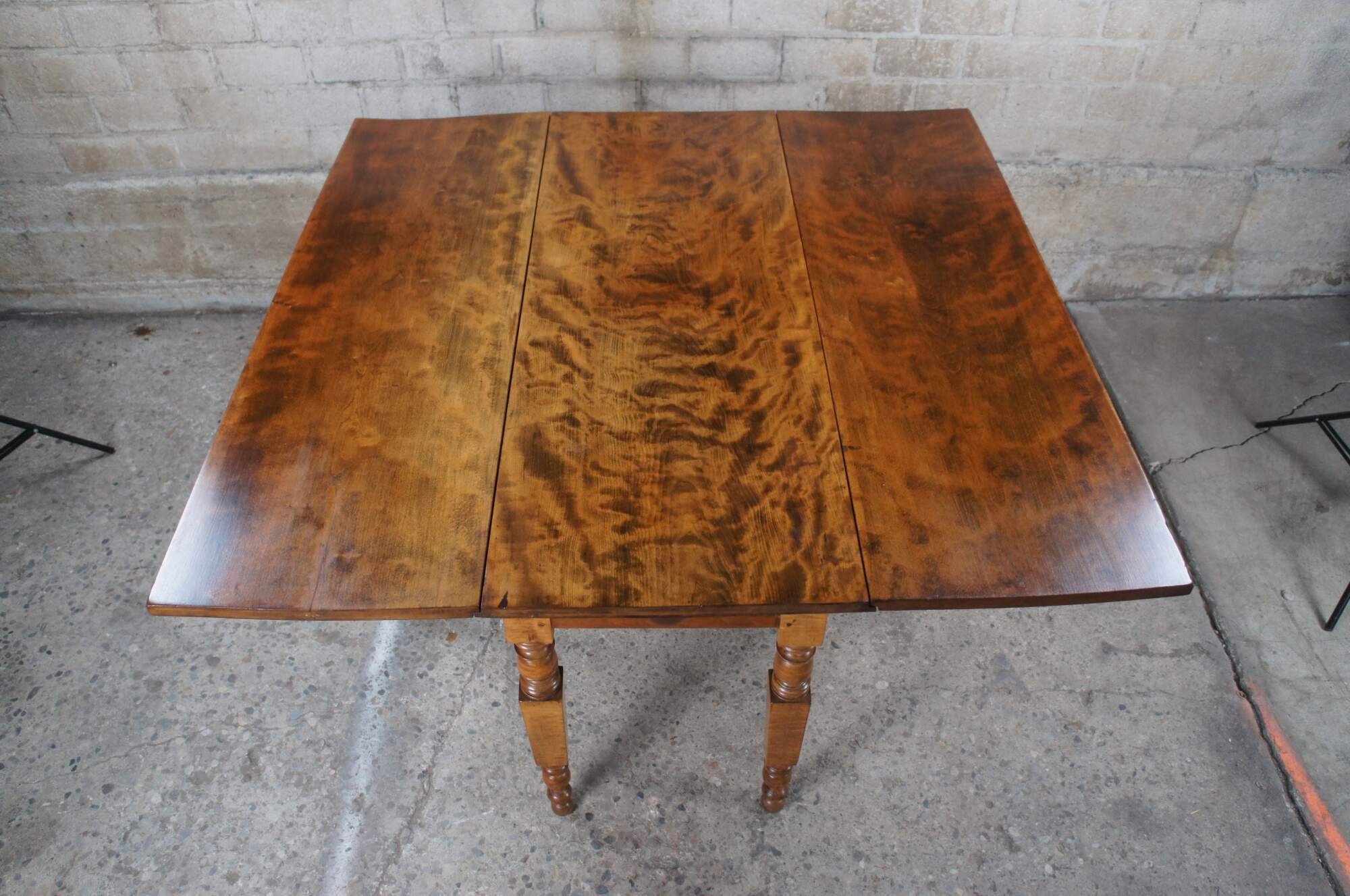 An impressive 19th century American gate leg table. Made from a beautiful curly (tiger) maple with hand turned legs and a drawer along the front. Great for use as a dining table or hallway console.