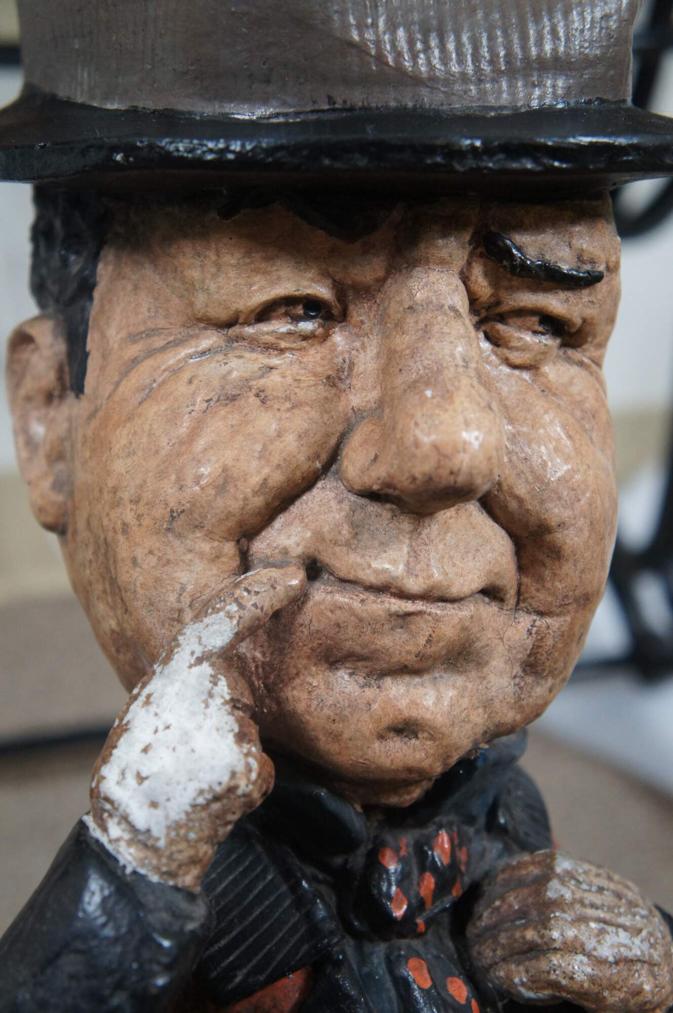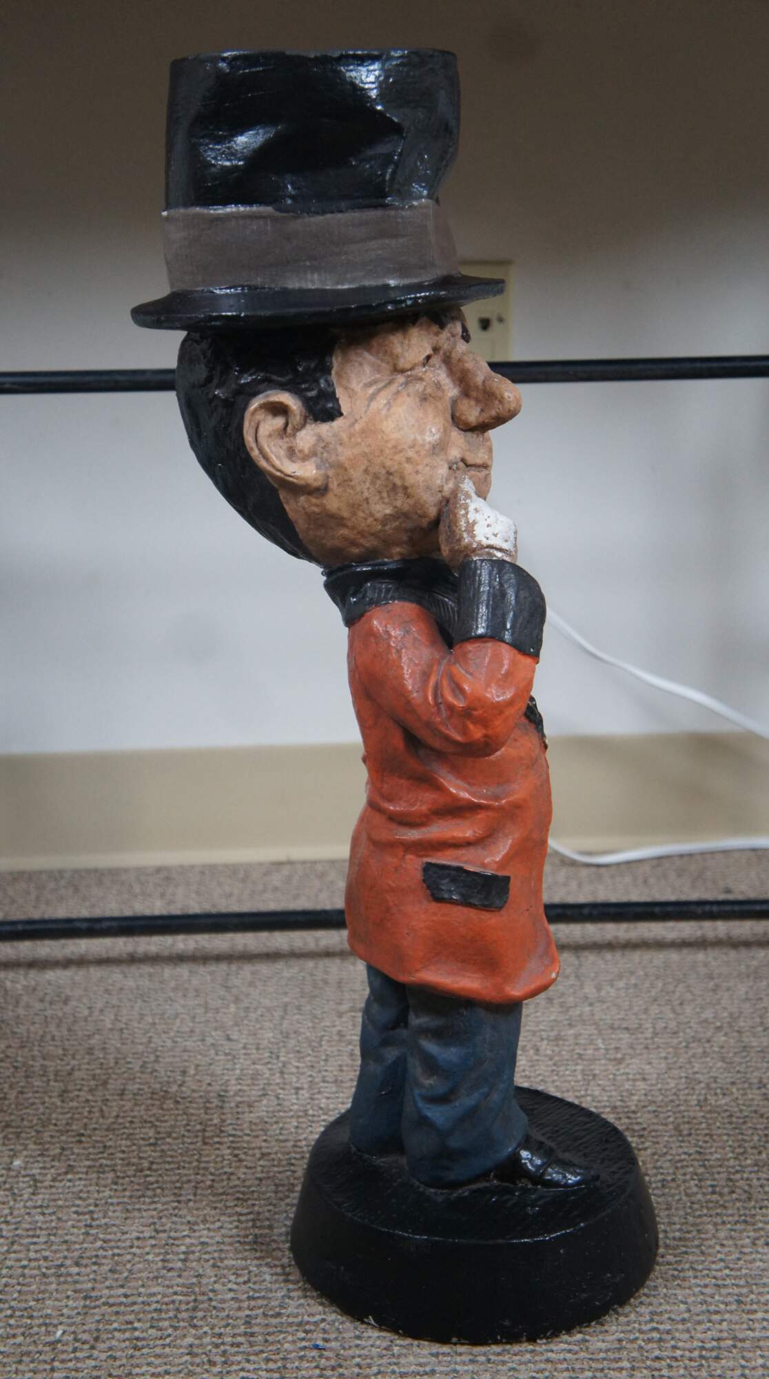 Vintage painted chalkware figurine / statue of W.C. Fields in a red-orange suit with spotted cravat and large top hat.