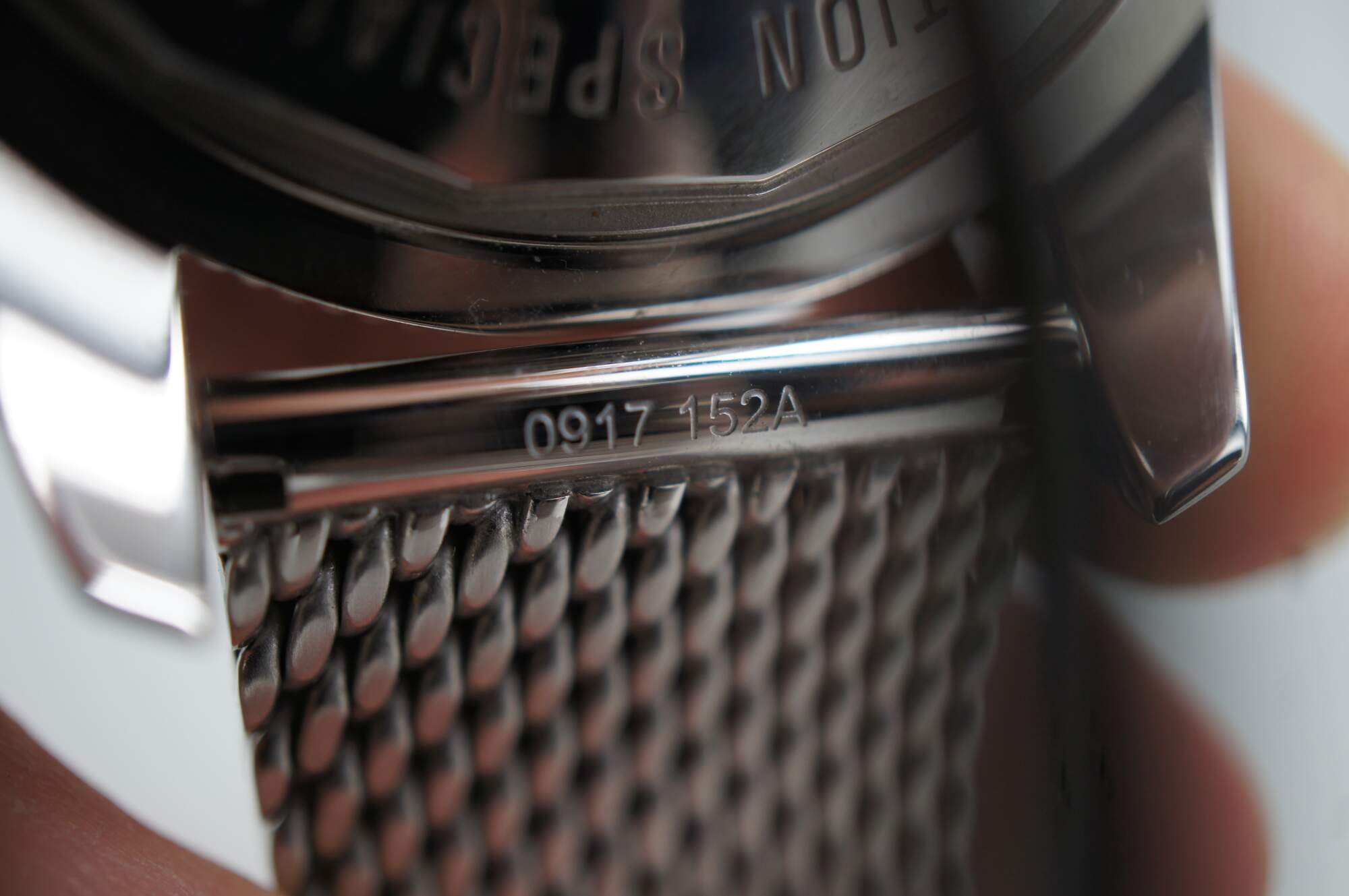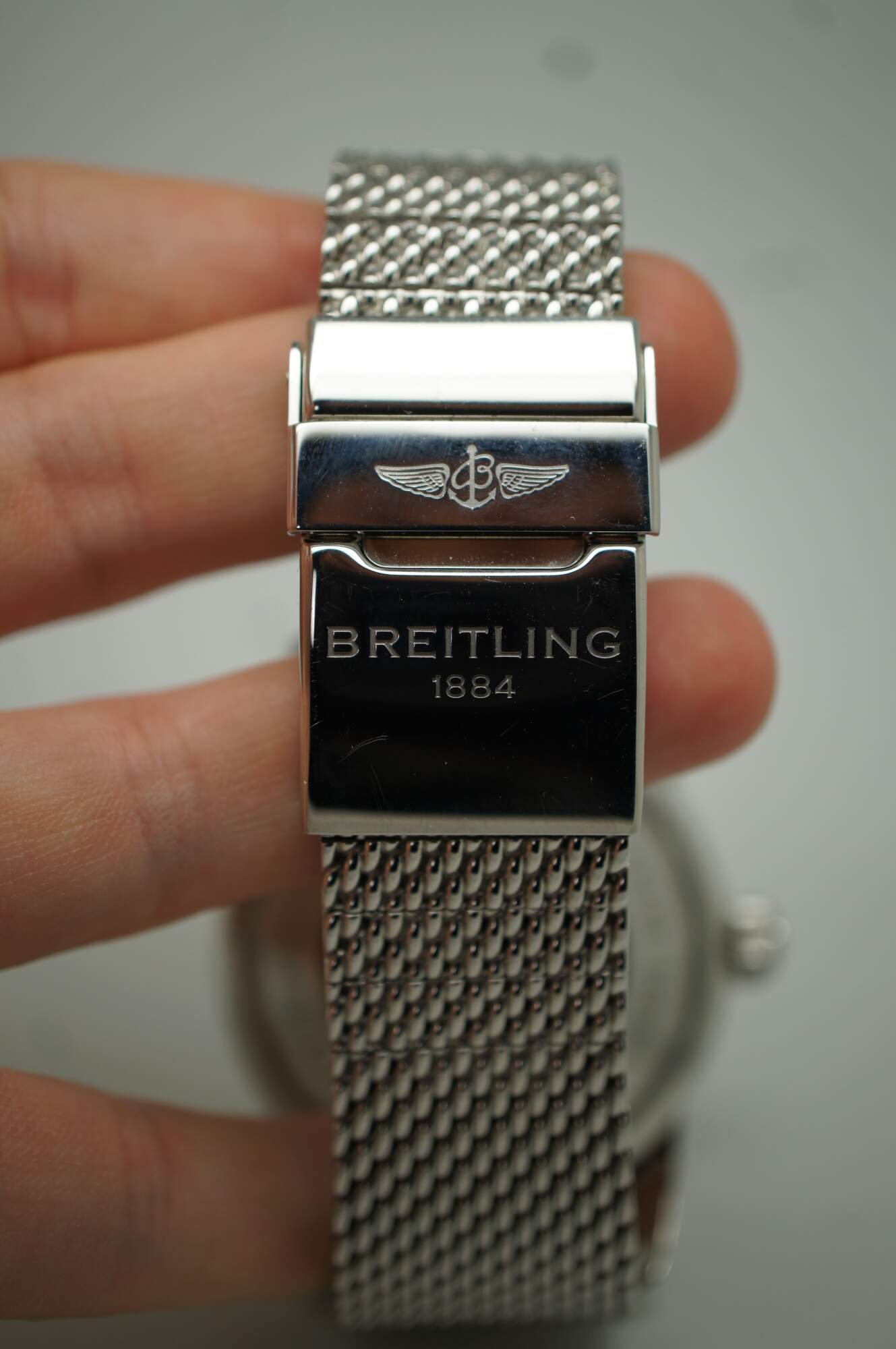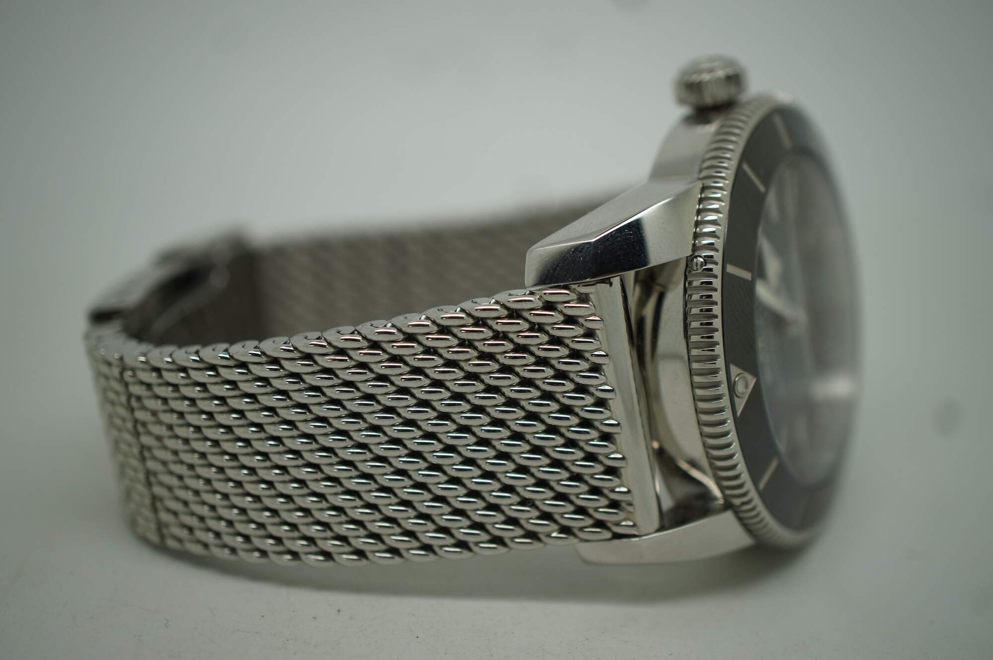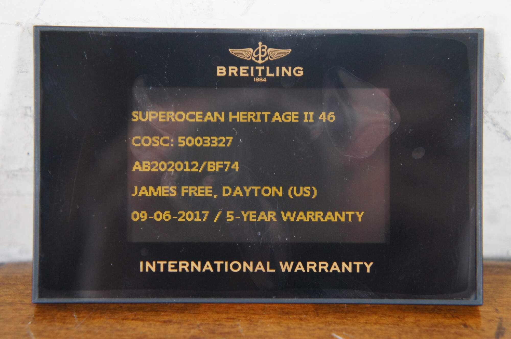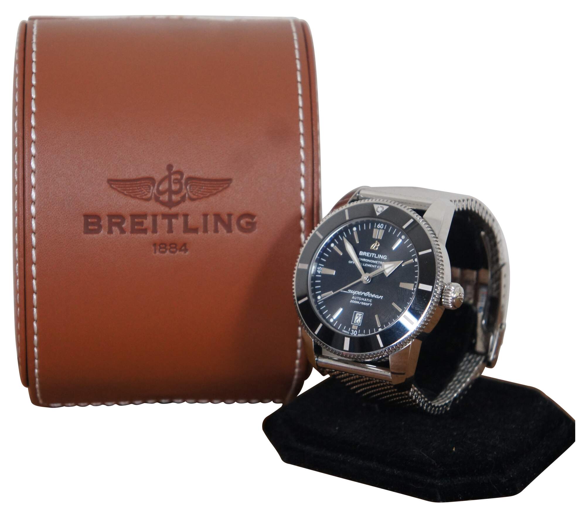 Breitling Superocean Heritage II 46 AB2020 wrist watch with stainless steel mesh band, black ceramic bezel and black sunburst dial, with anti reflective coating on both sides of the sapphire crystal, and Superluminova on hands, hour markers, and triangle on the bezel for visibility in low light. Includes original interior and exterior boxes, plus original receipt, warranty card, and paperwork.