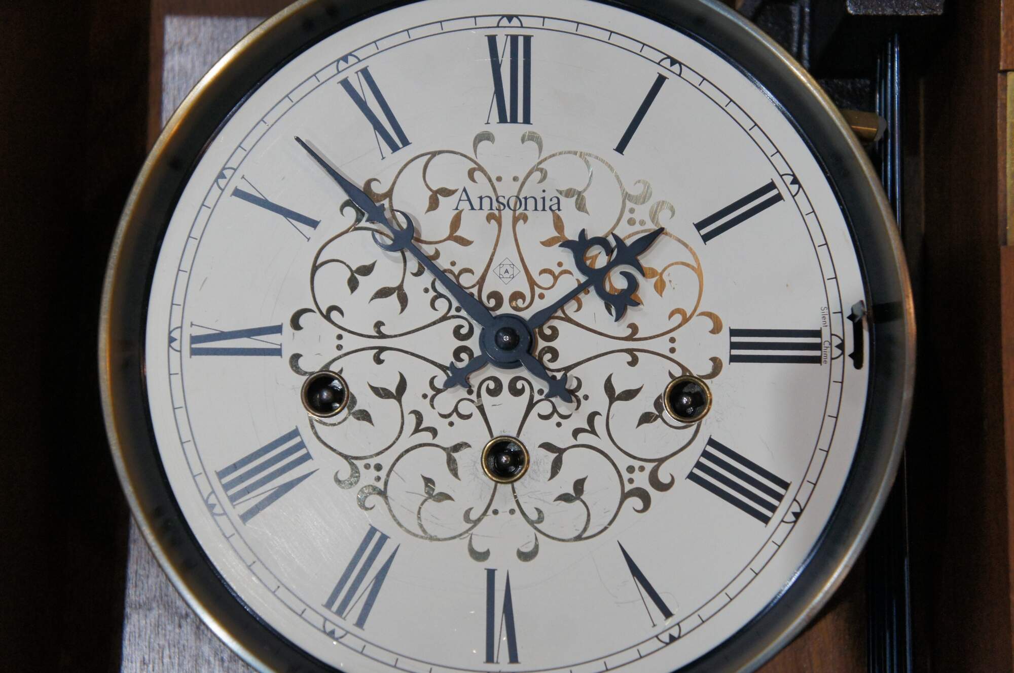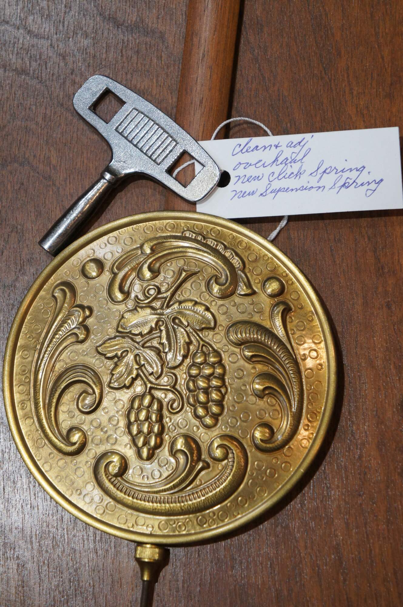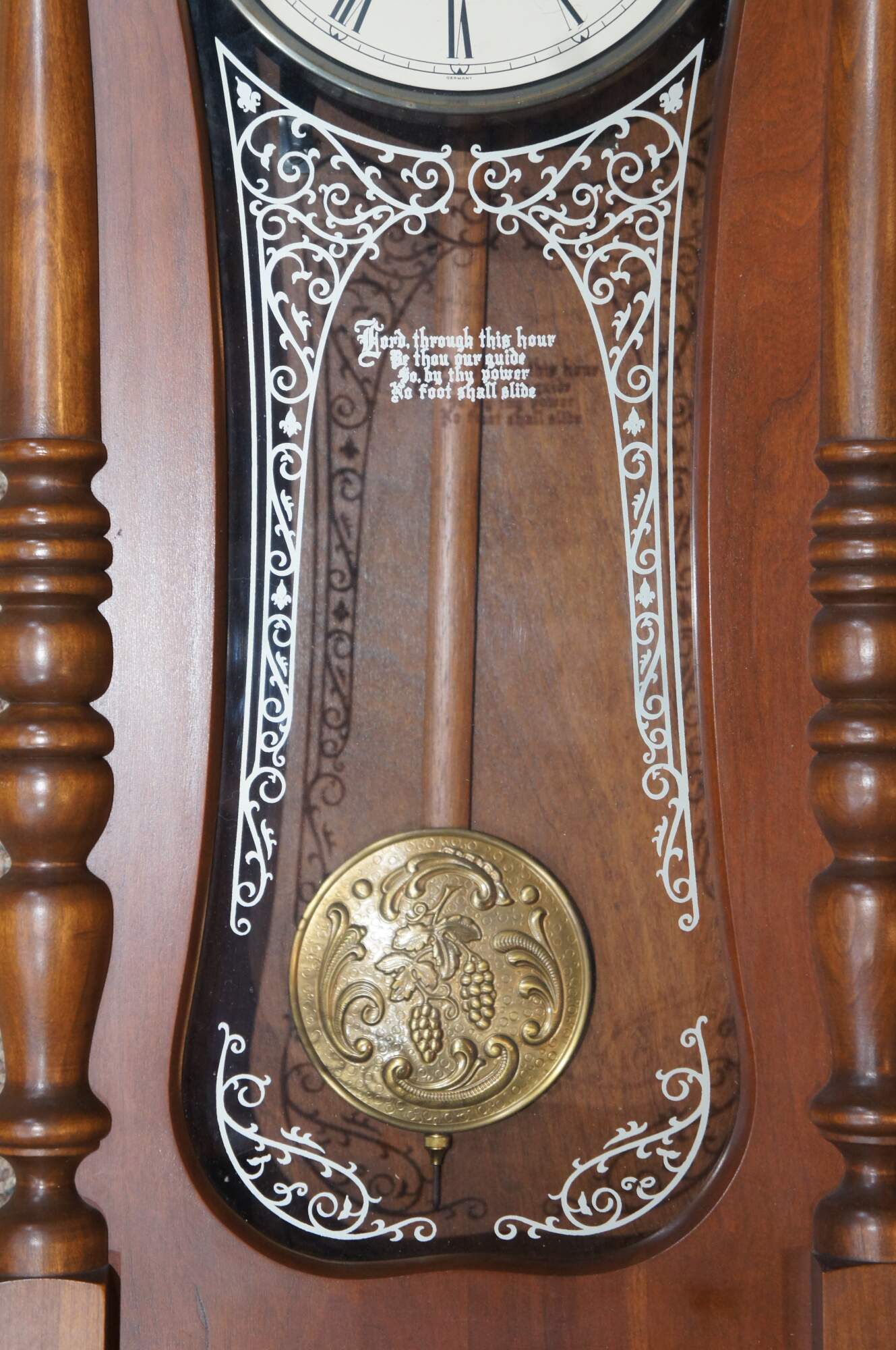 Vintage Ezee-Set #725 wall clock by Ansonia Clock Company. Case features spindle columns and urn shaped finials, carved scallop/floral detail on the pediment, molded grapes on the brass pendulum, and a painted glass front with the words “Lord, through this hour – Be thou our guide – So, by thy power – No foot shall slide.” Cleaned and adjusted, overhauled, new click spring, and new suspension spring – 2015.