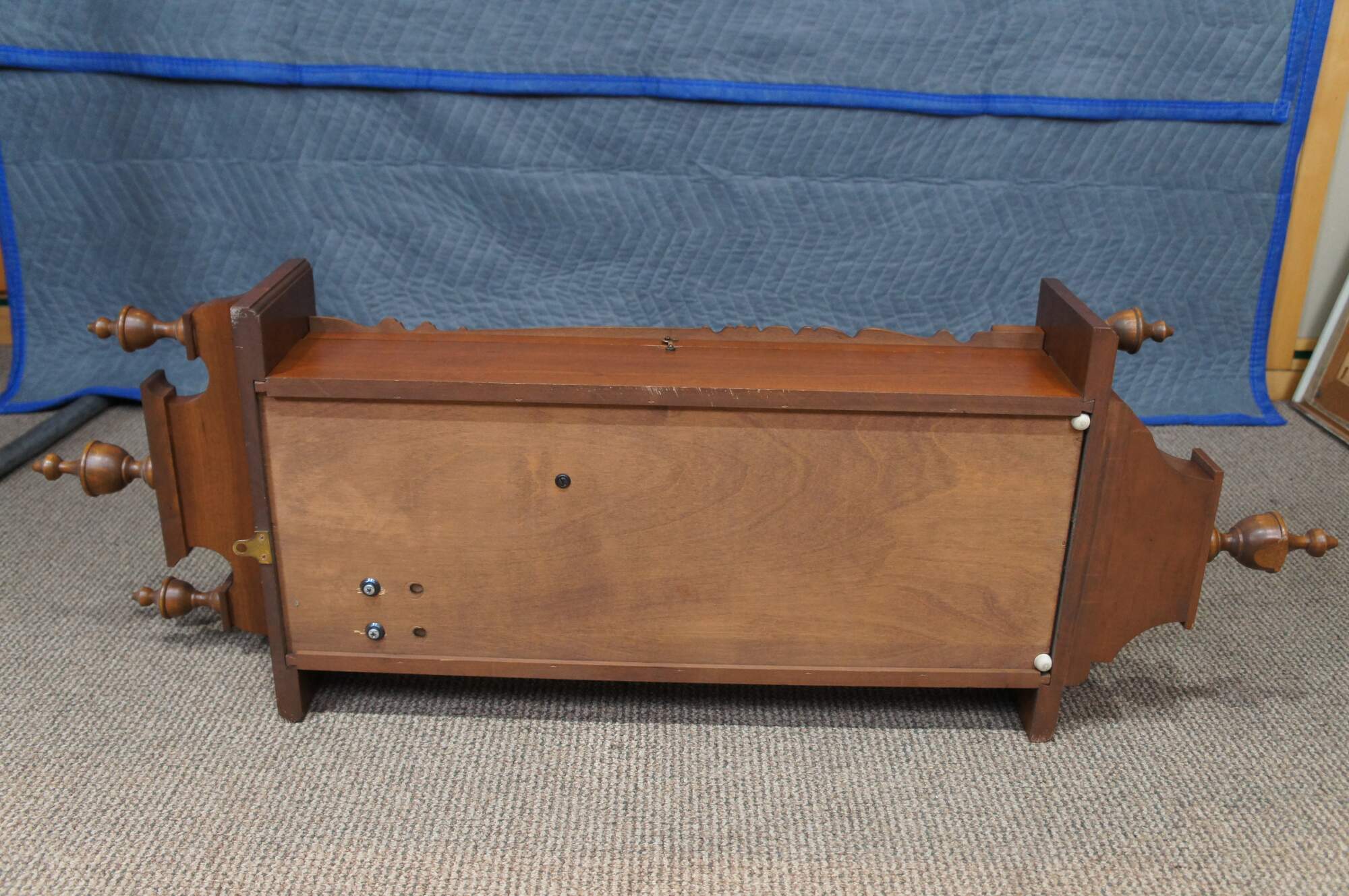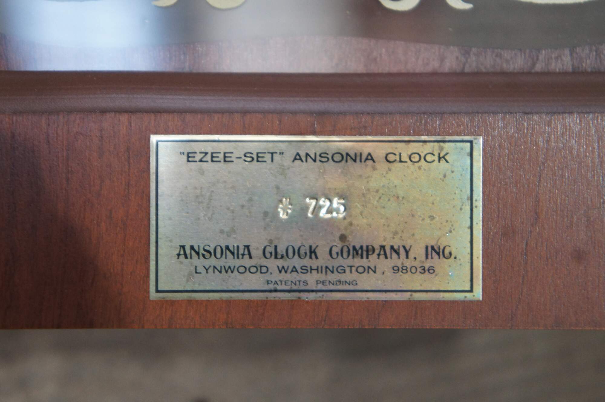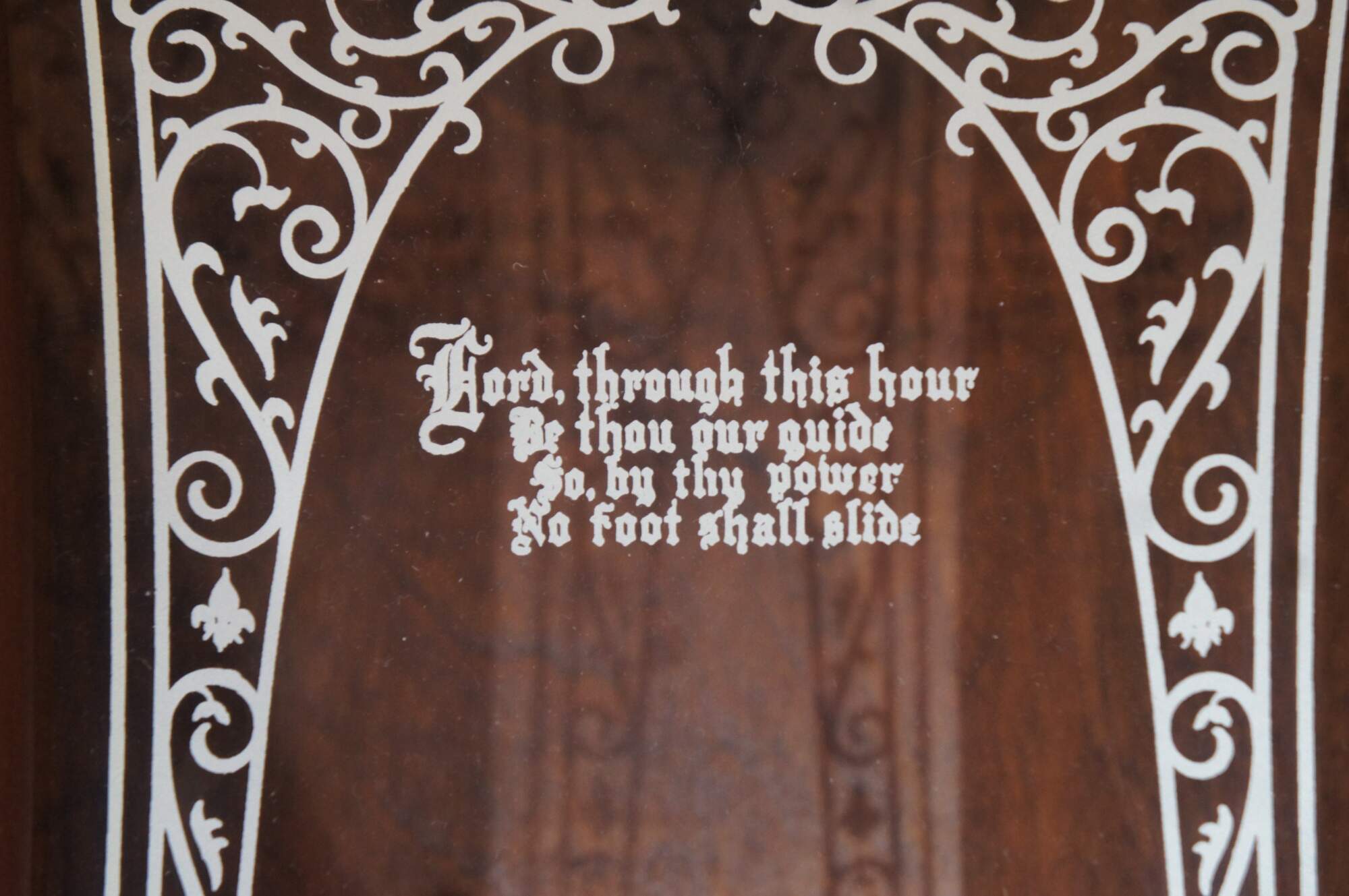 Vintage Ezee-Set #725 wall clock by Ansonia Clock Company. Case features spindle columns and urn shaped finials, carved scallop/floral detail on the pediment, molded grapes on the brass pendulum, and a painted glass front with the words “Lord, through this hour – Be thou our guide – So, by thy power – No foot shall slide.” Cleaned and adjusted, overhauled, new click spring, and new suspension spring – 2015.