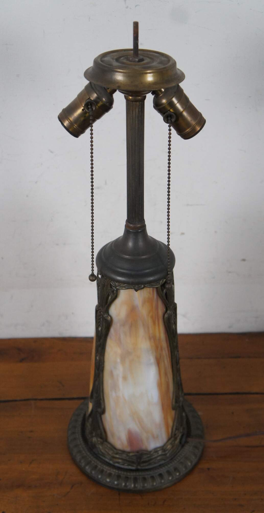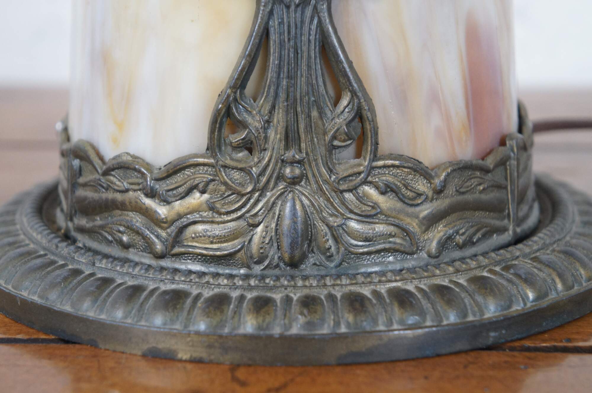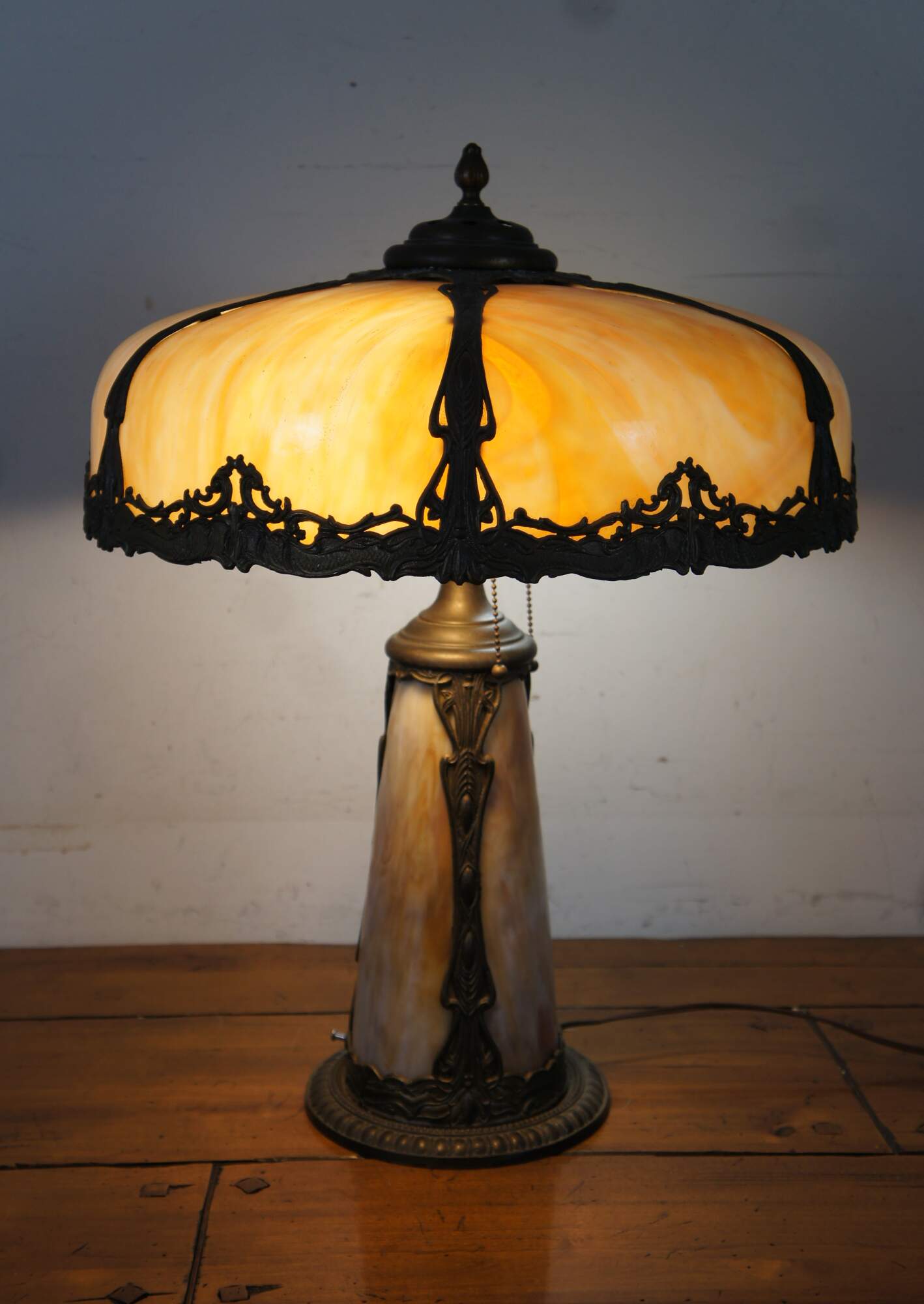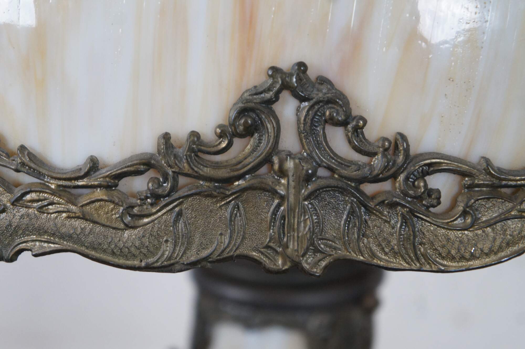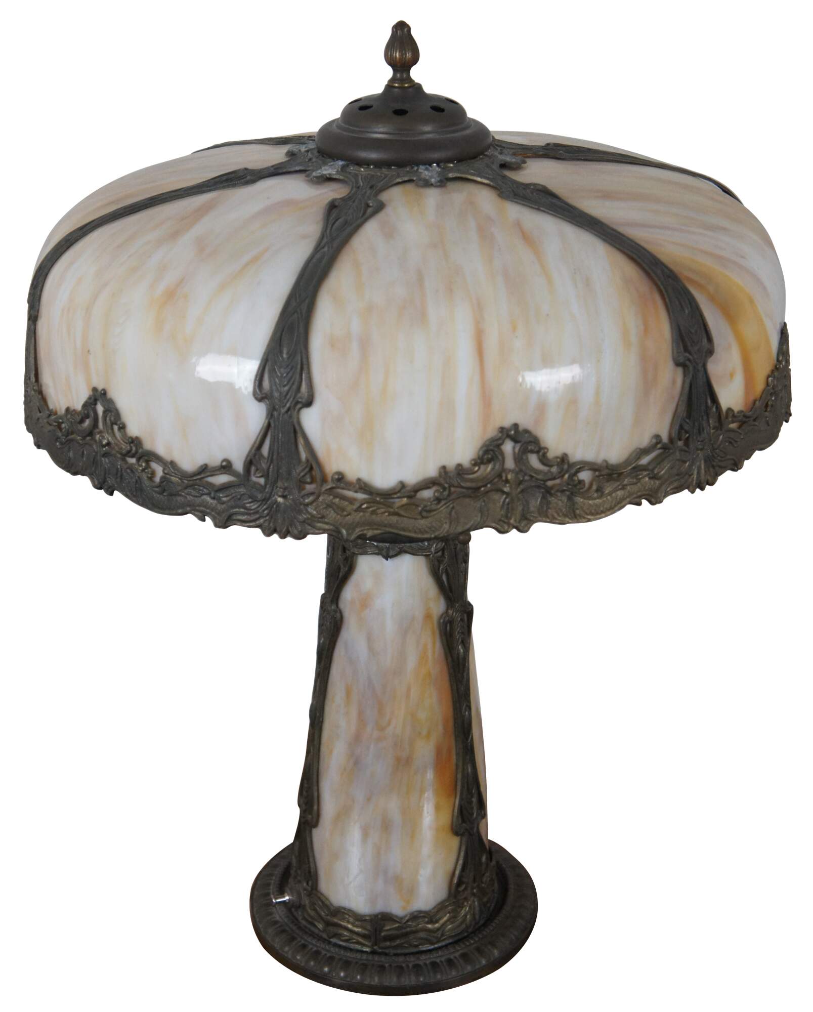 Early 20th century art nouveau style white and salmon slag glass parlor / library / table lamp with illuminating base and two light top under an umbrella / mushroom shaped shade. Separate switches allow upper portion and base to be illuminated independently.