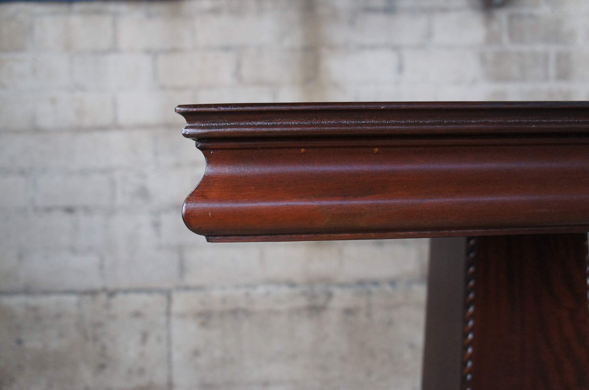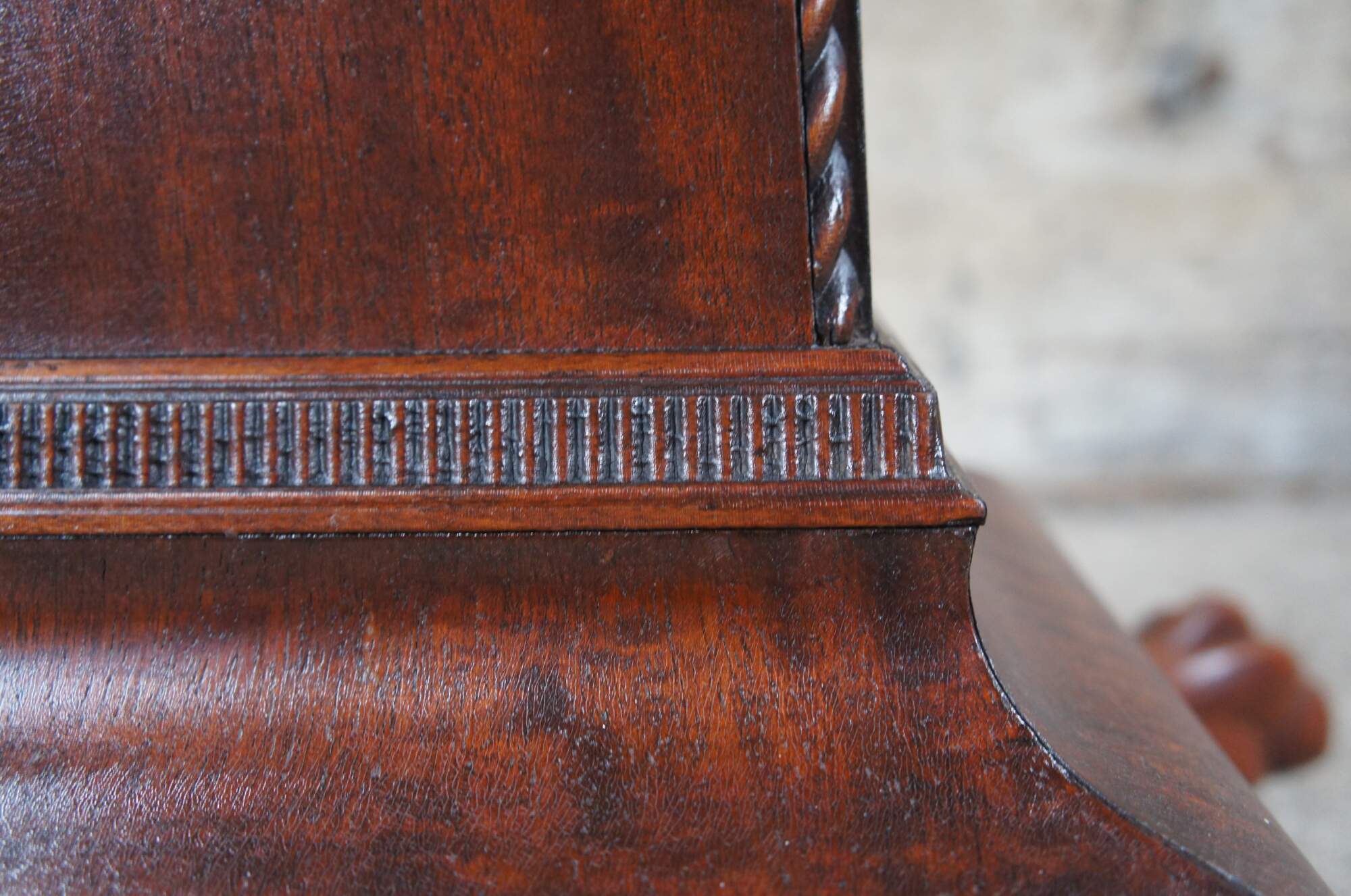 Antique American Empire mahogany game table featuring square form with a tapered pedestal, large carved claw feet, serpentine edge and twisted / fluted accents.