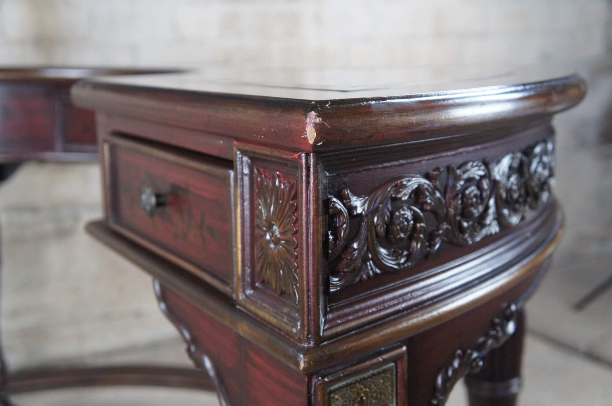 Vintage demilune writing or library desk featuring half round form with scrolled acanthus accents, three inset bevelled glass panels and three drawers.