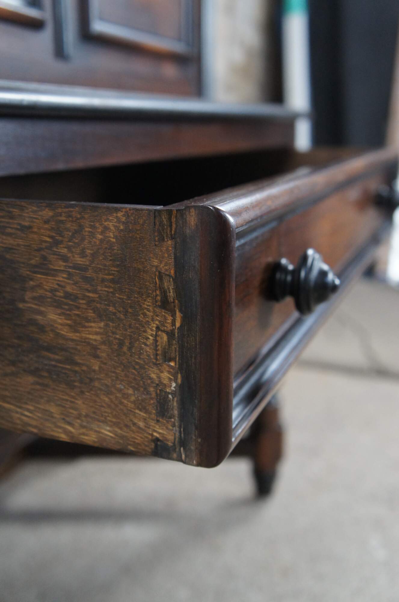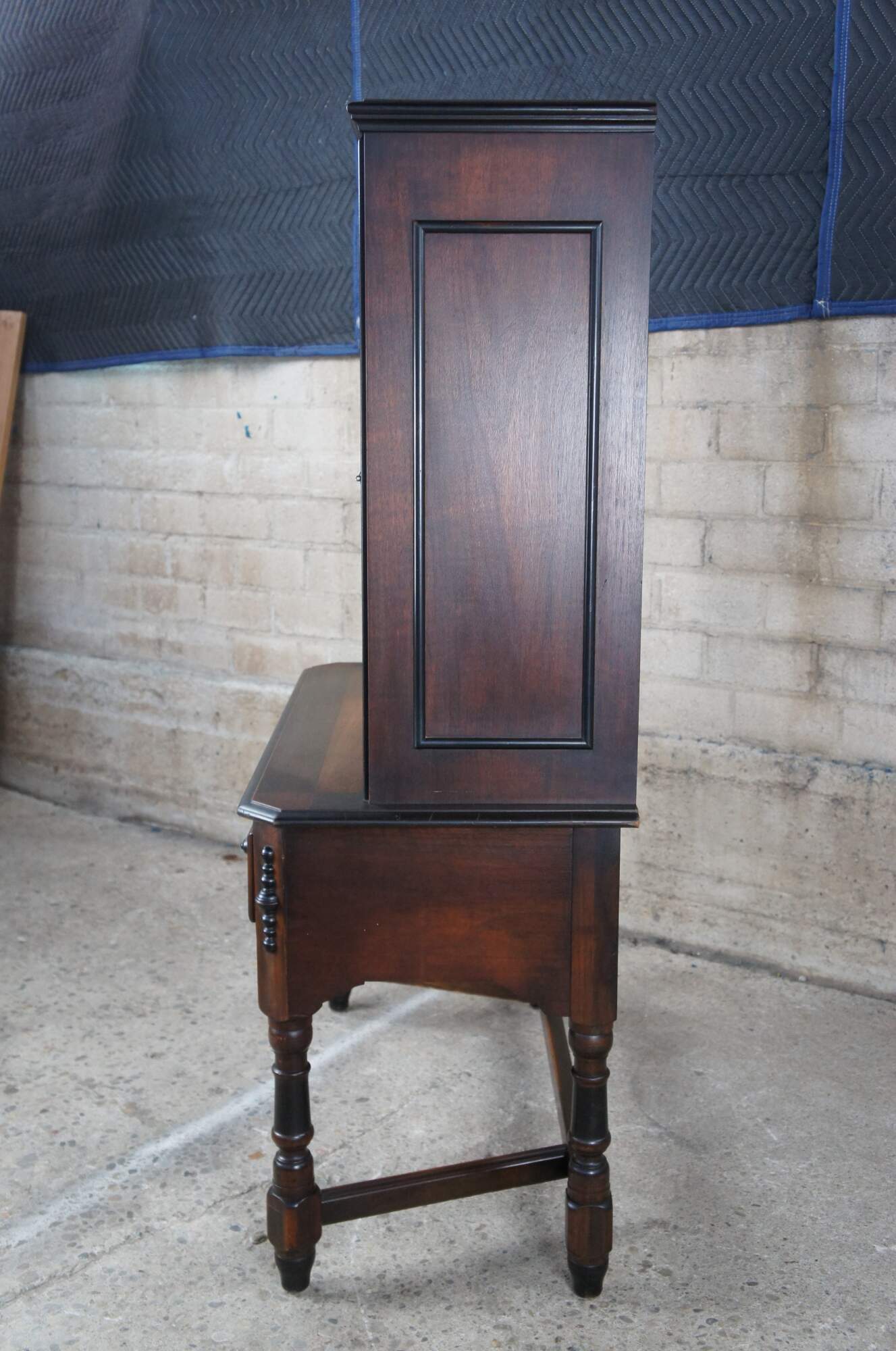 Mid century Paine Furniture Company stepback cupboard cabinet. Made of walnut featuring paneled doors that open to two serpentine shelves with plate grooves, and a lower drawer. Circa 1954.