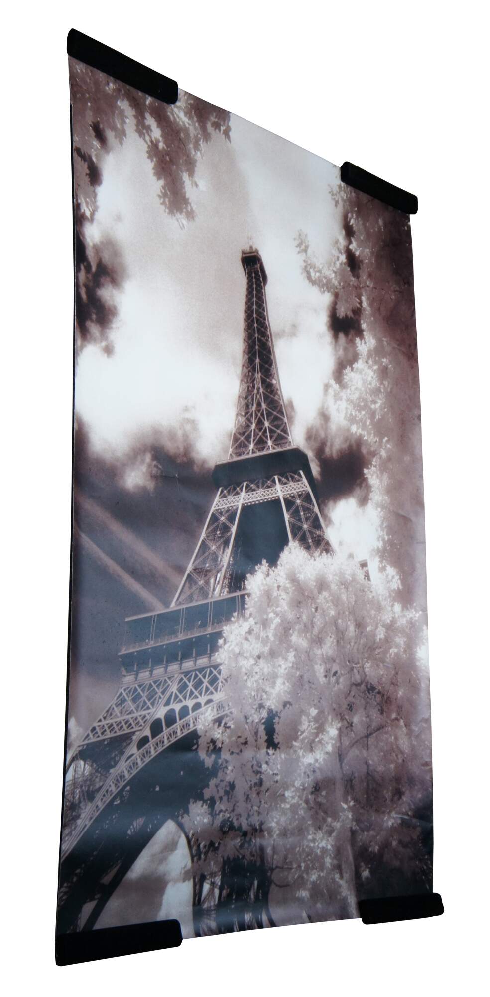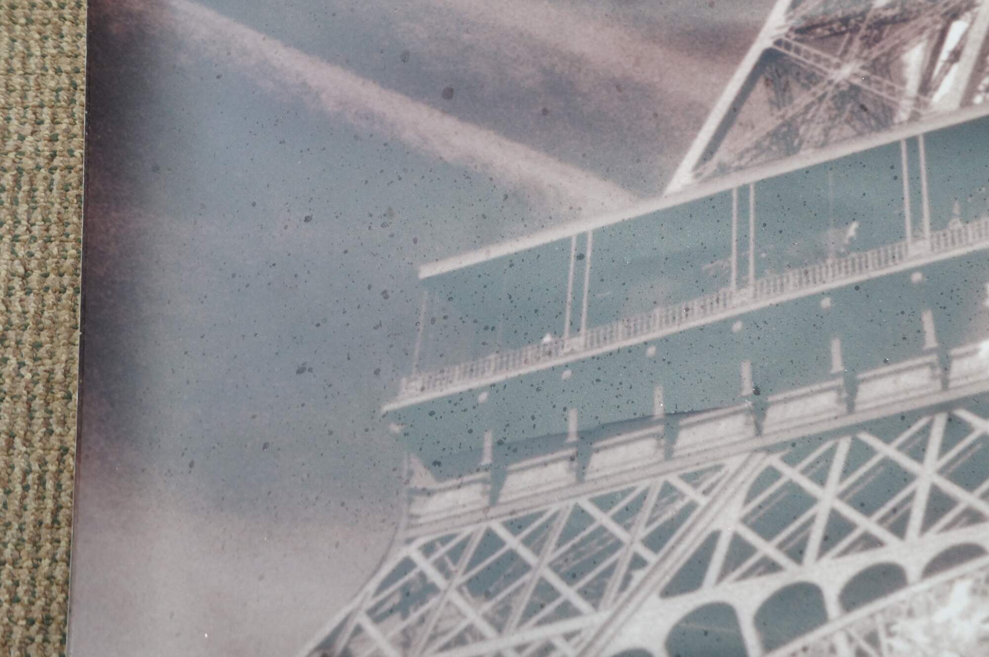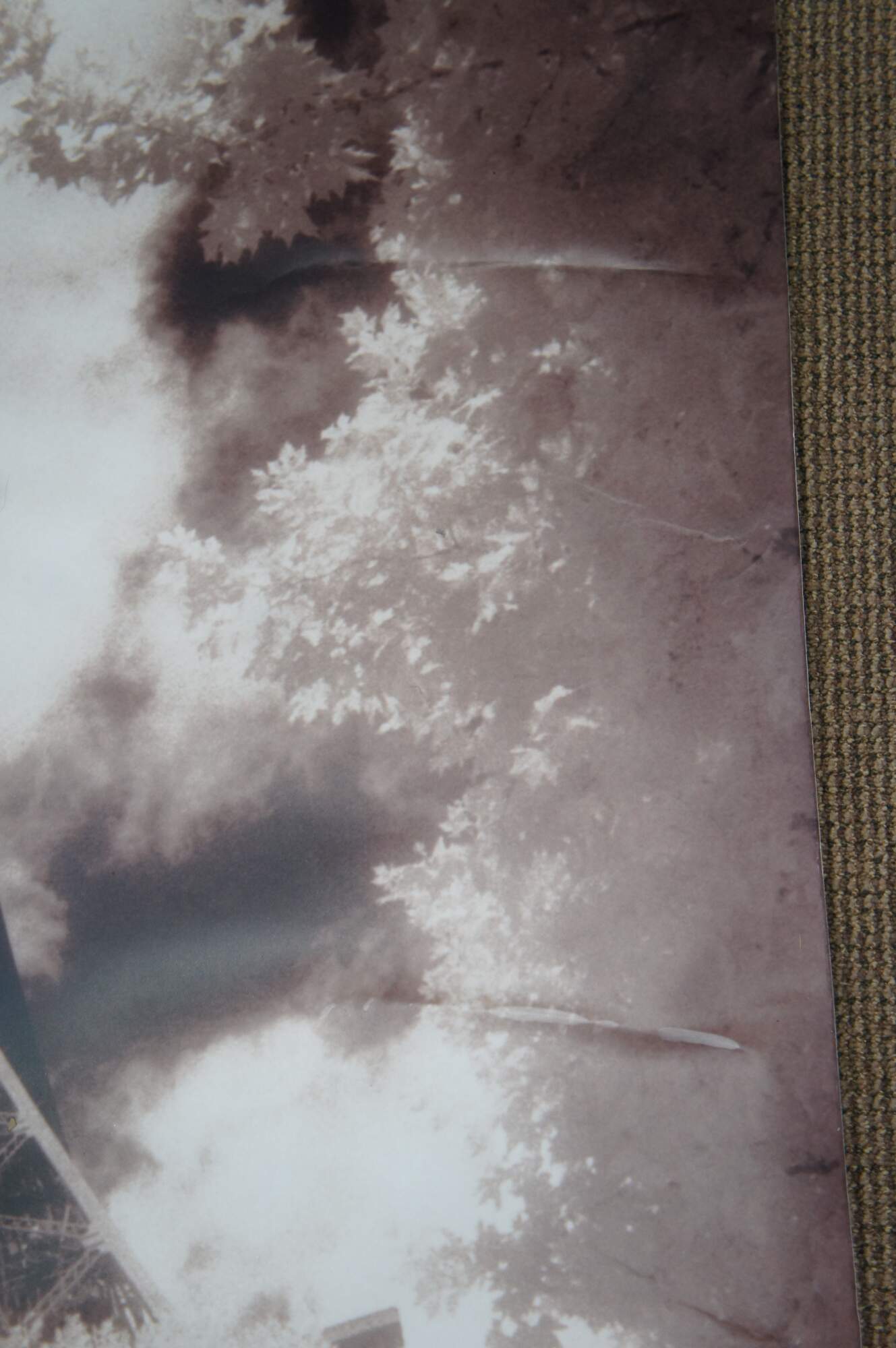 Huge sepia toned poster of the Eiffel Tower, looking up through the trees of the Champ de Mars, By Jon Arnold. Printed on Fujicolor Crystal Archive Paper by Fujifilm.