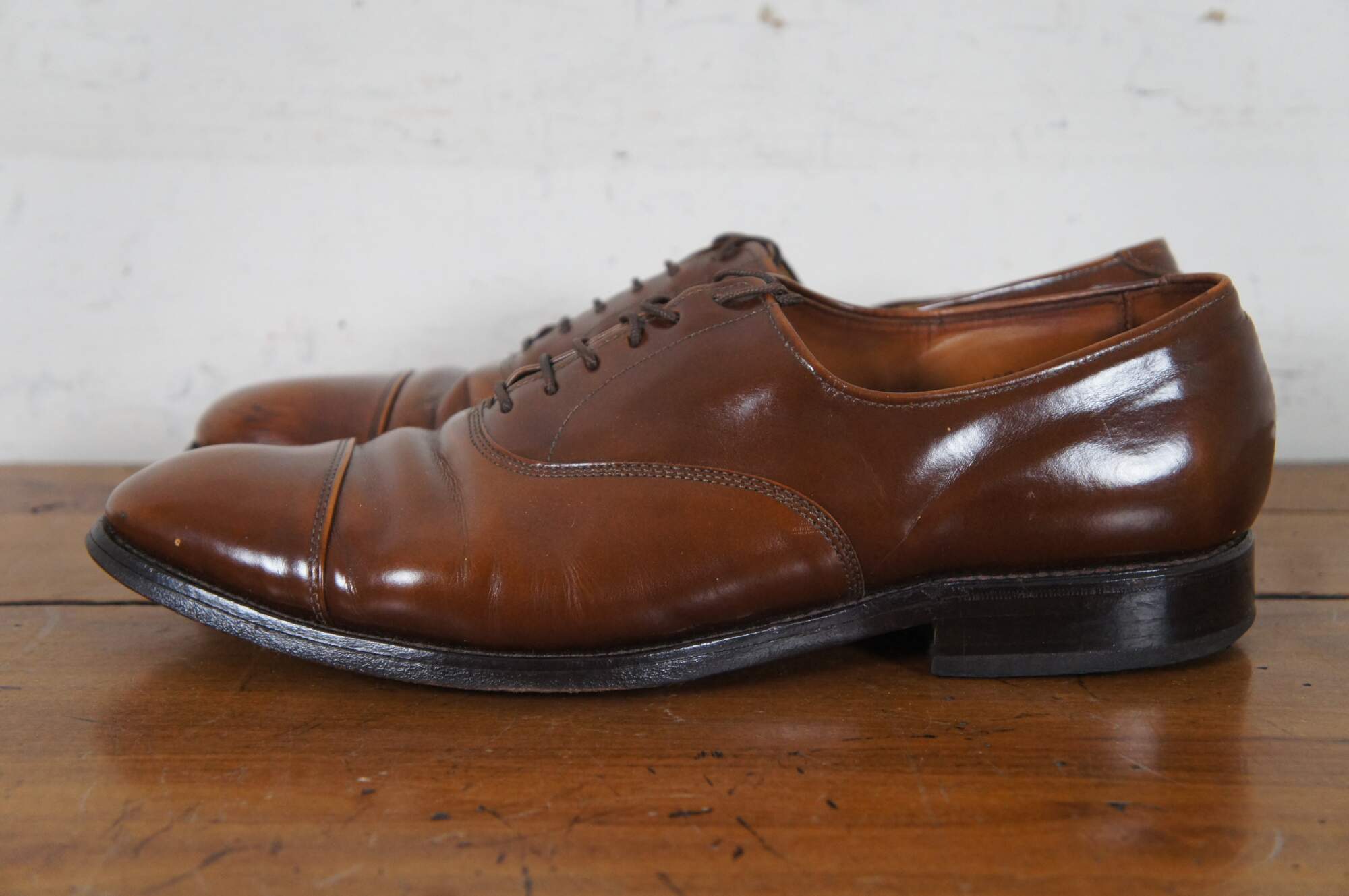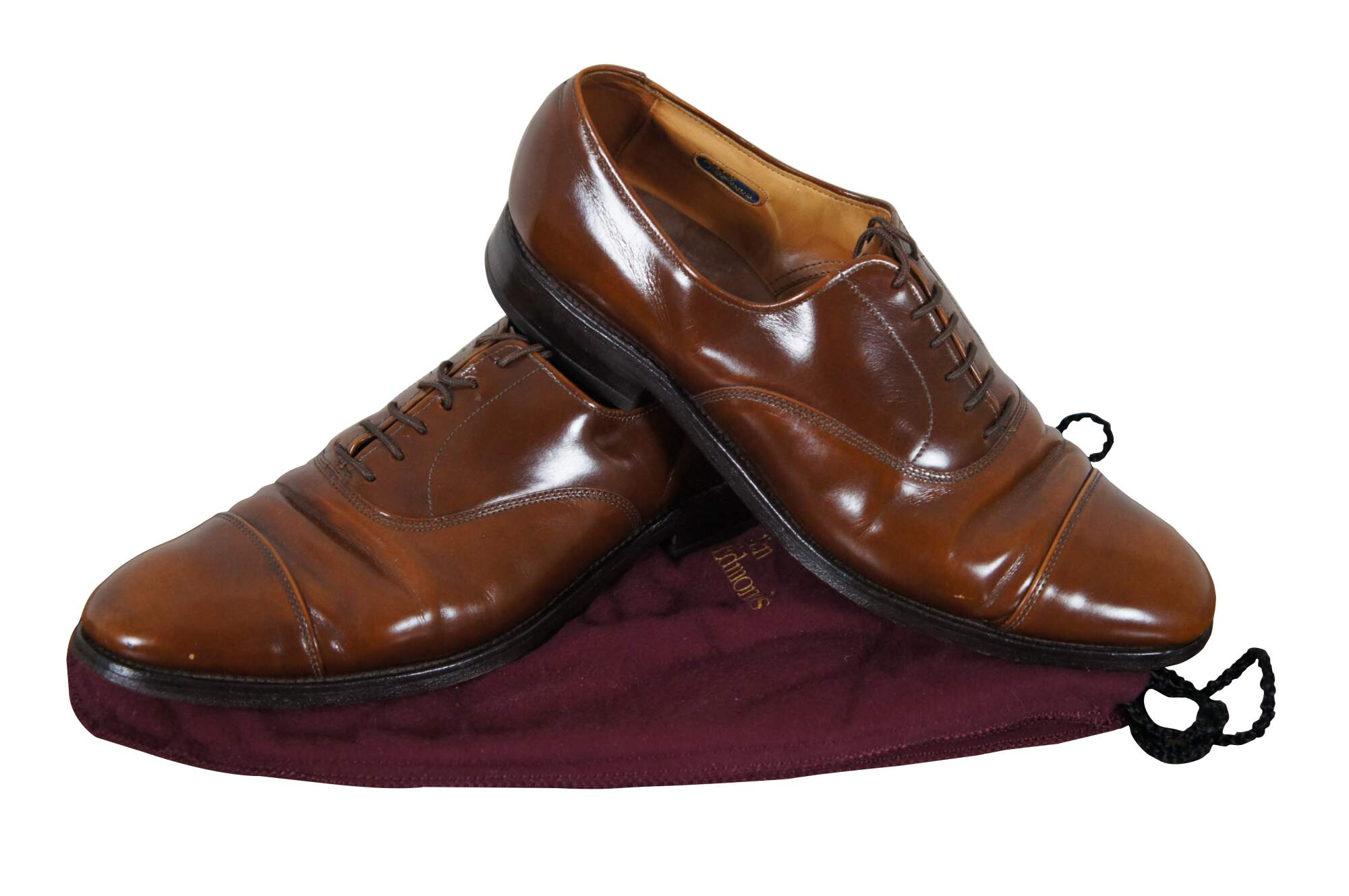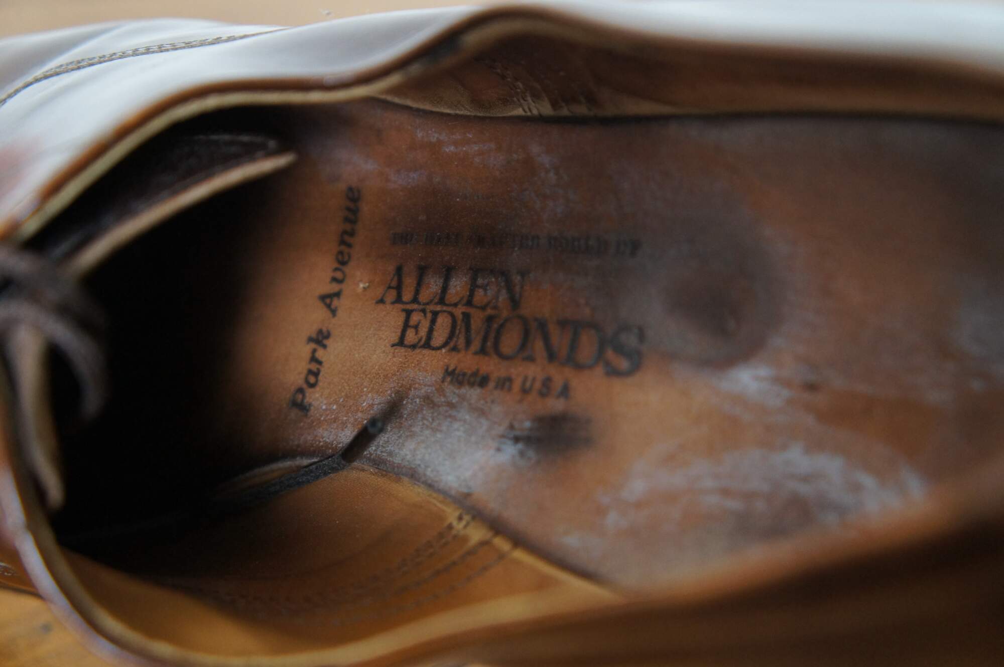 Allen Edmonds “Park Avenue” cap toe leather oxfords in walnut brown. Includes dust bags.
