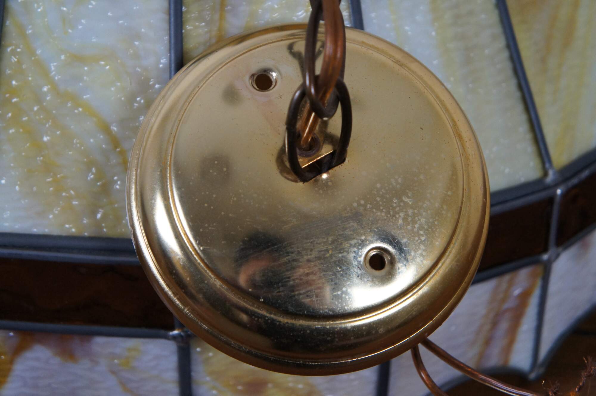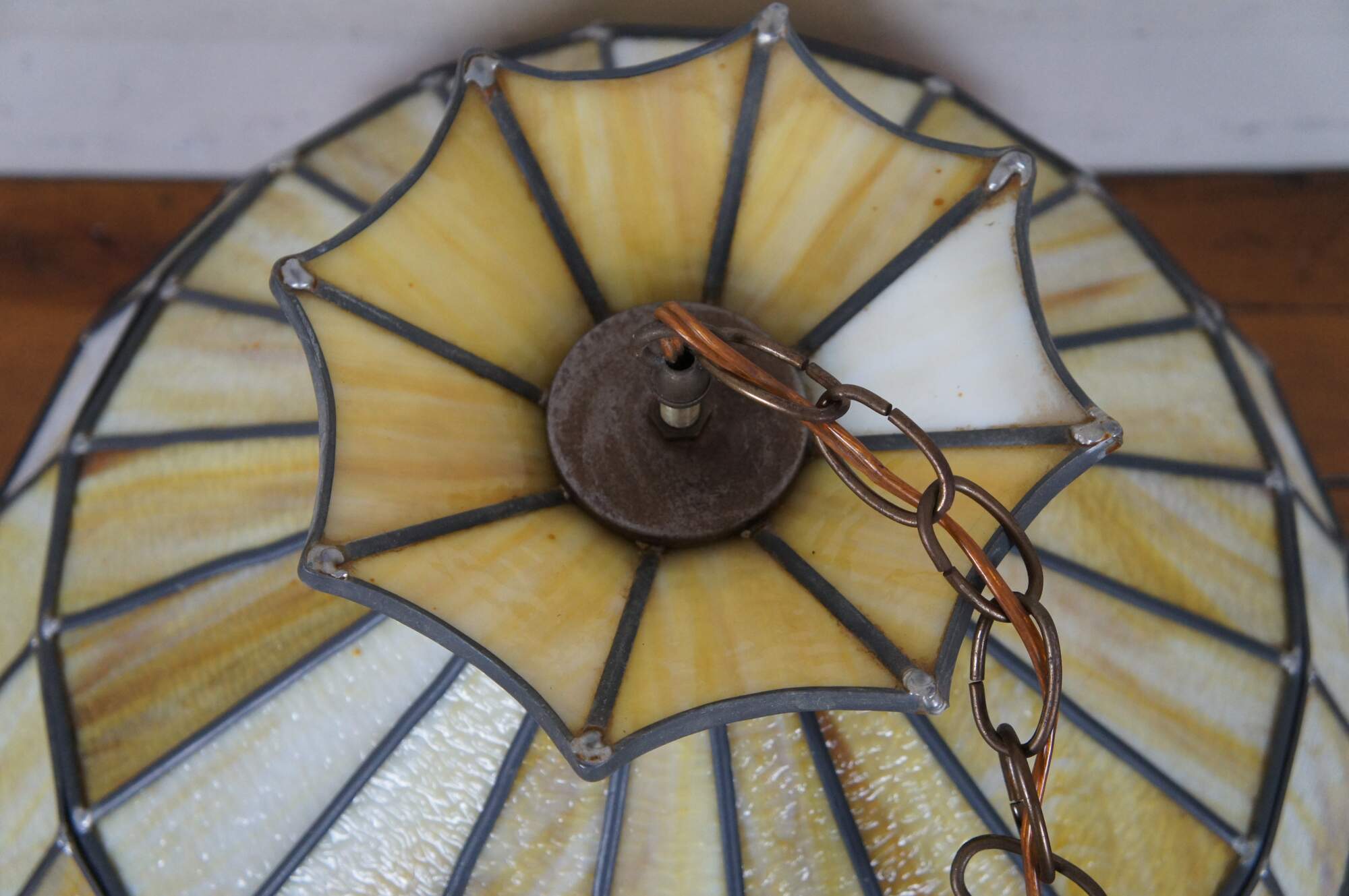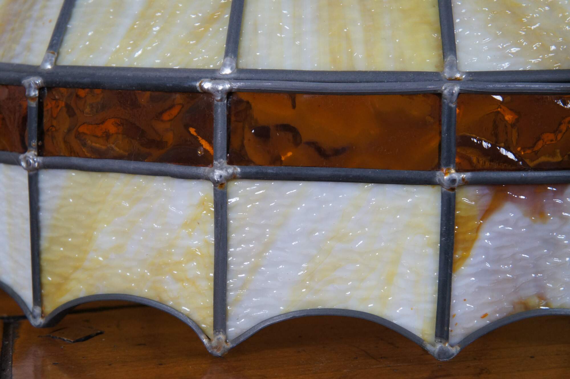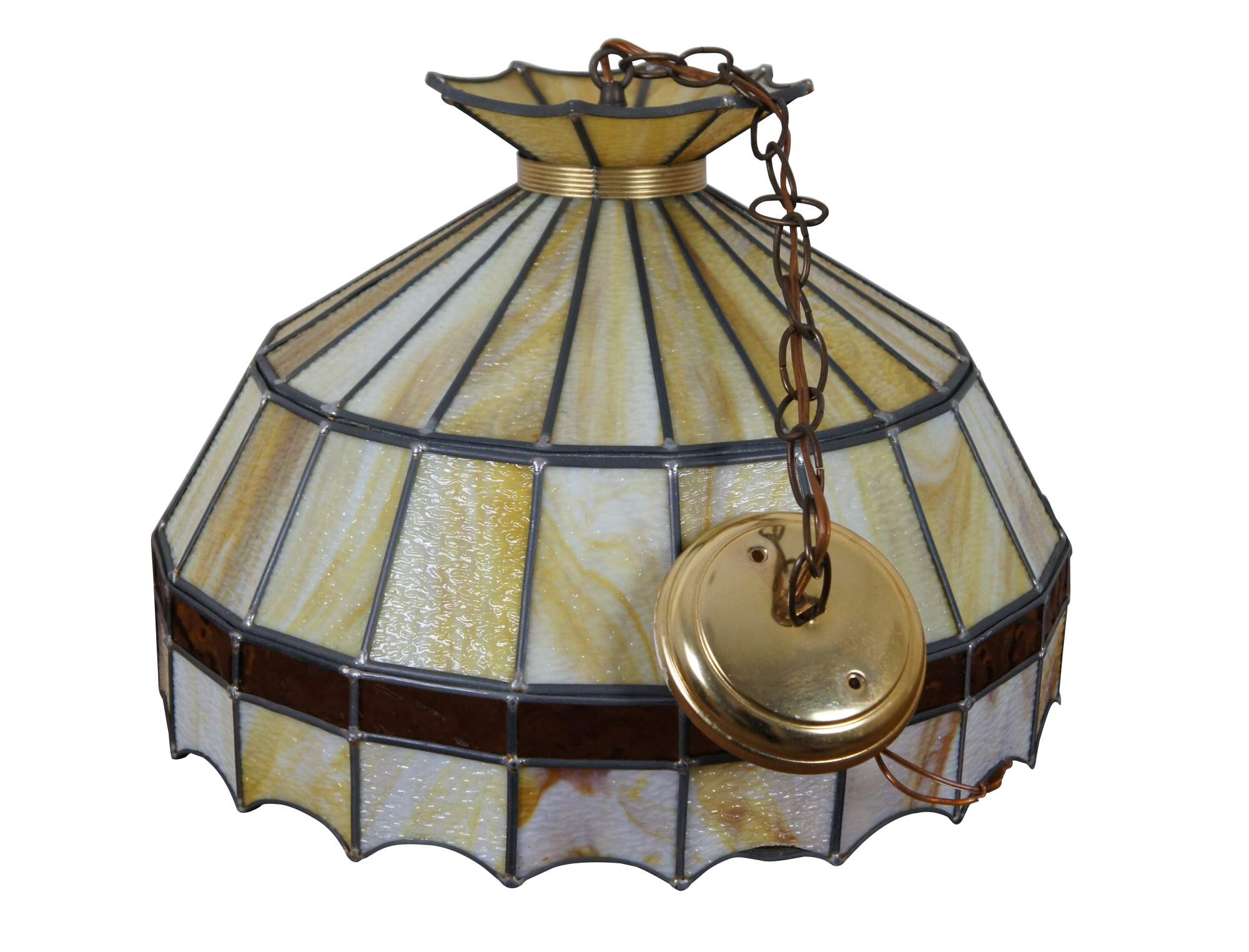 Vintage Tiffany style swag / pendant light / chandelier crafted of leaded yellow and cream slag glass panels with a band of amber stained glass above the scalloped lower edge.