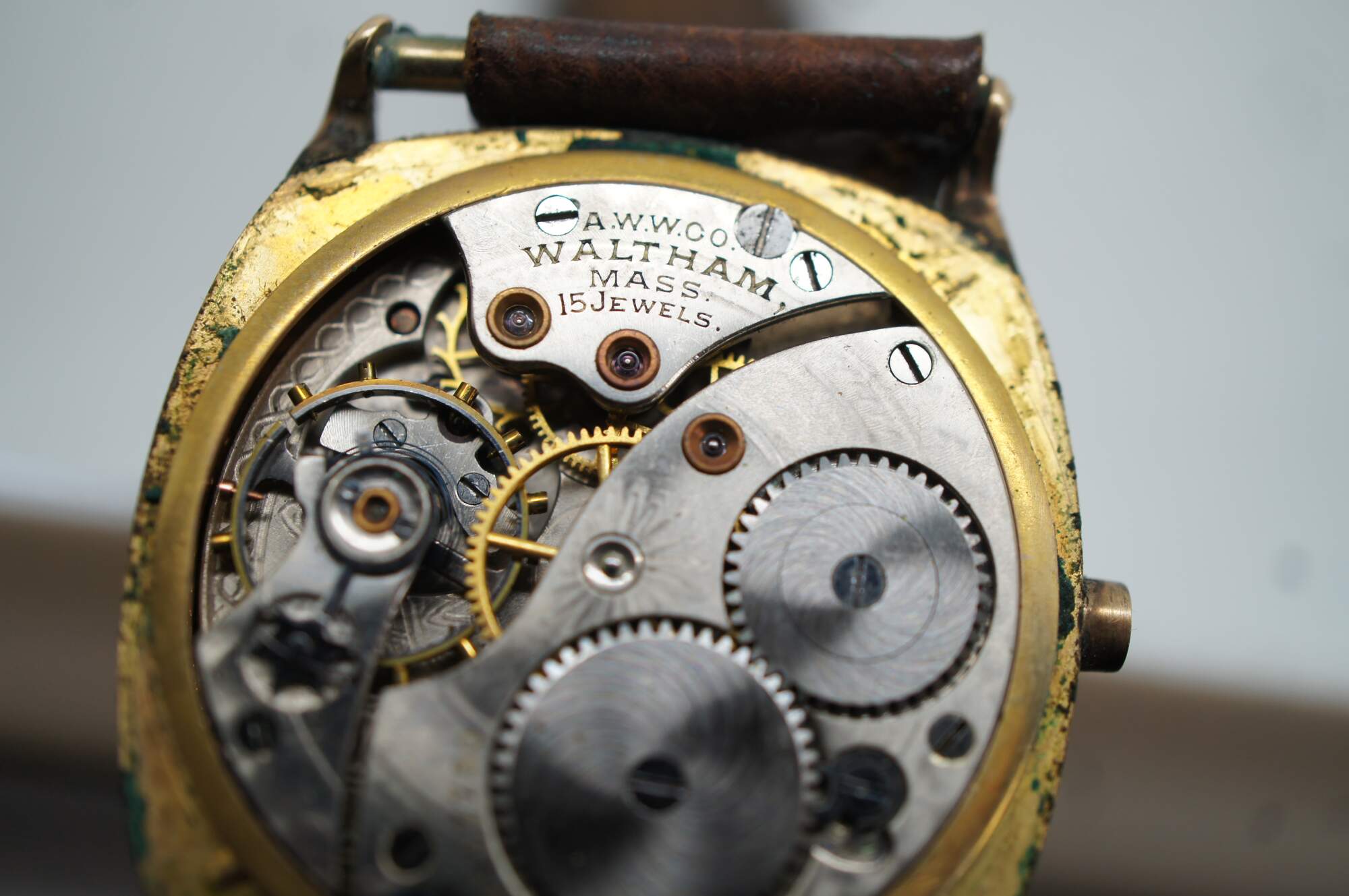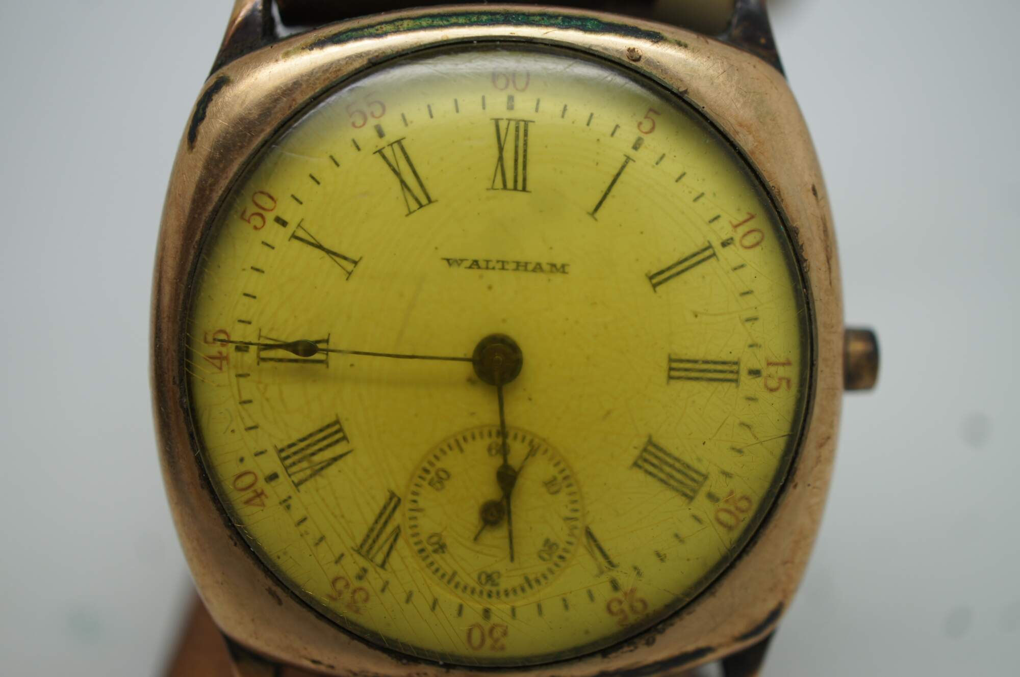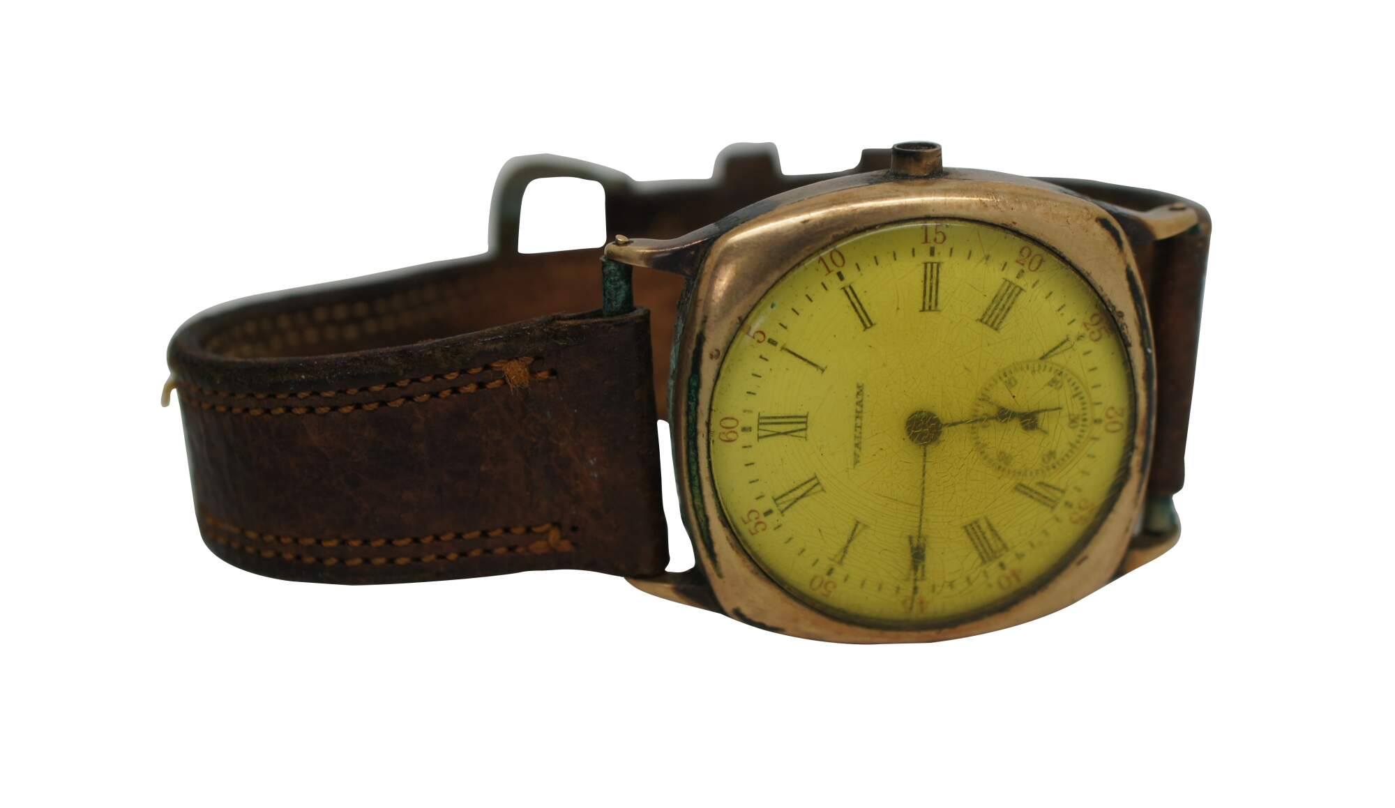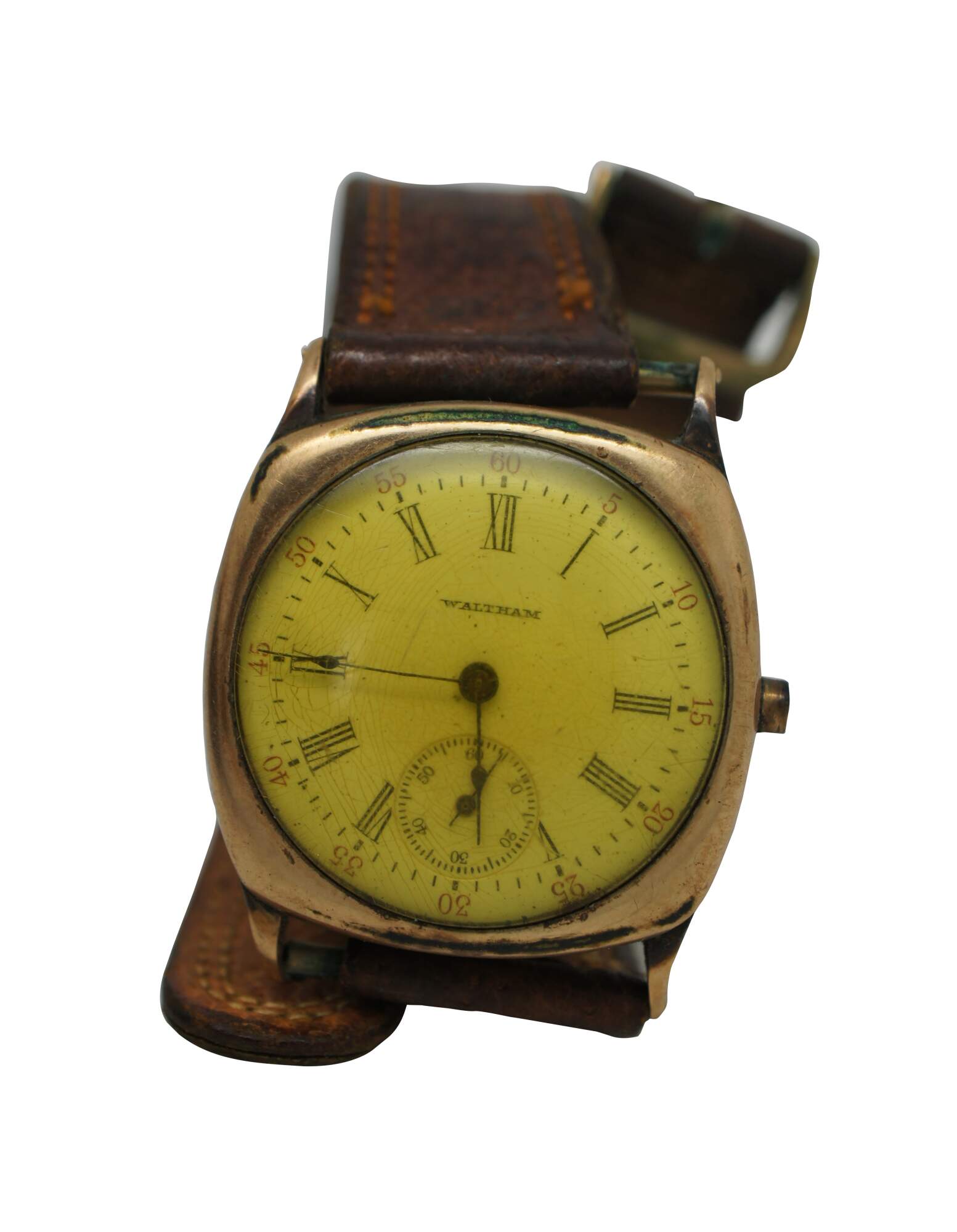 Antique (produced circa 1914) gold toned wrist watch by the American Waltham Watch Co of Waltham, Massachusetts - 15 Jewels, works numbered 19627750. Case by Fahys Montauk, numbered 368998. Grade No. 165, 15 jewels, 0s. Brown leather band.