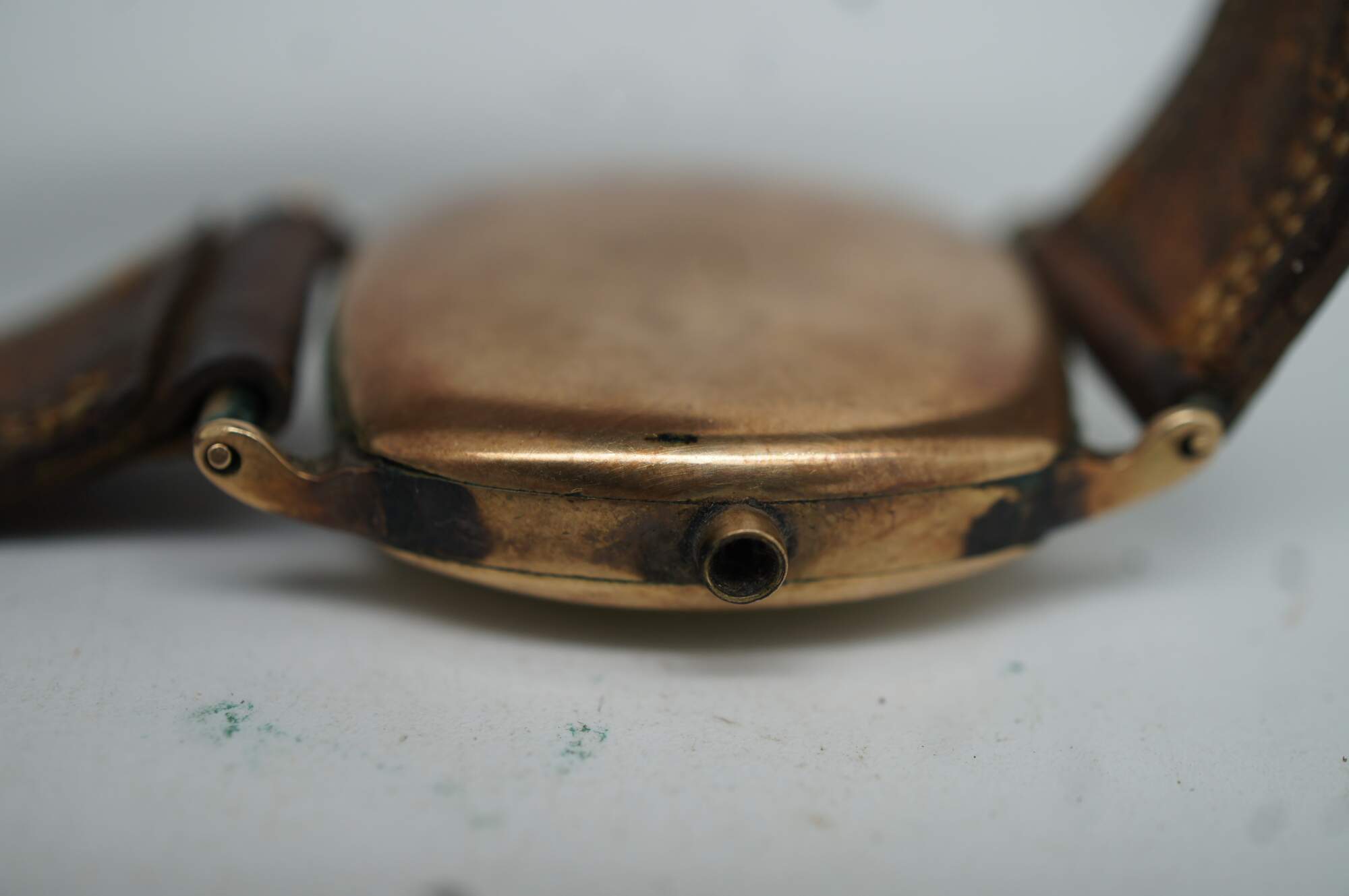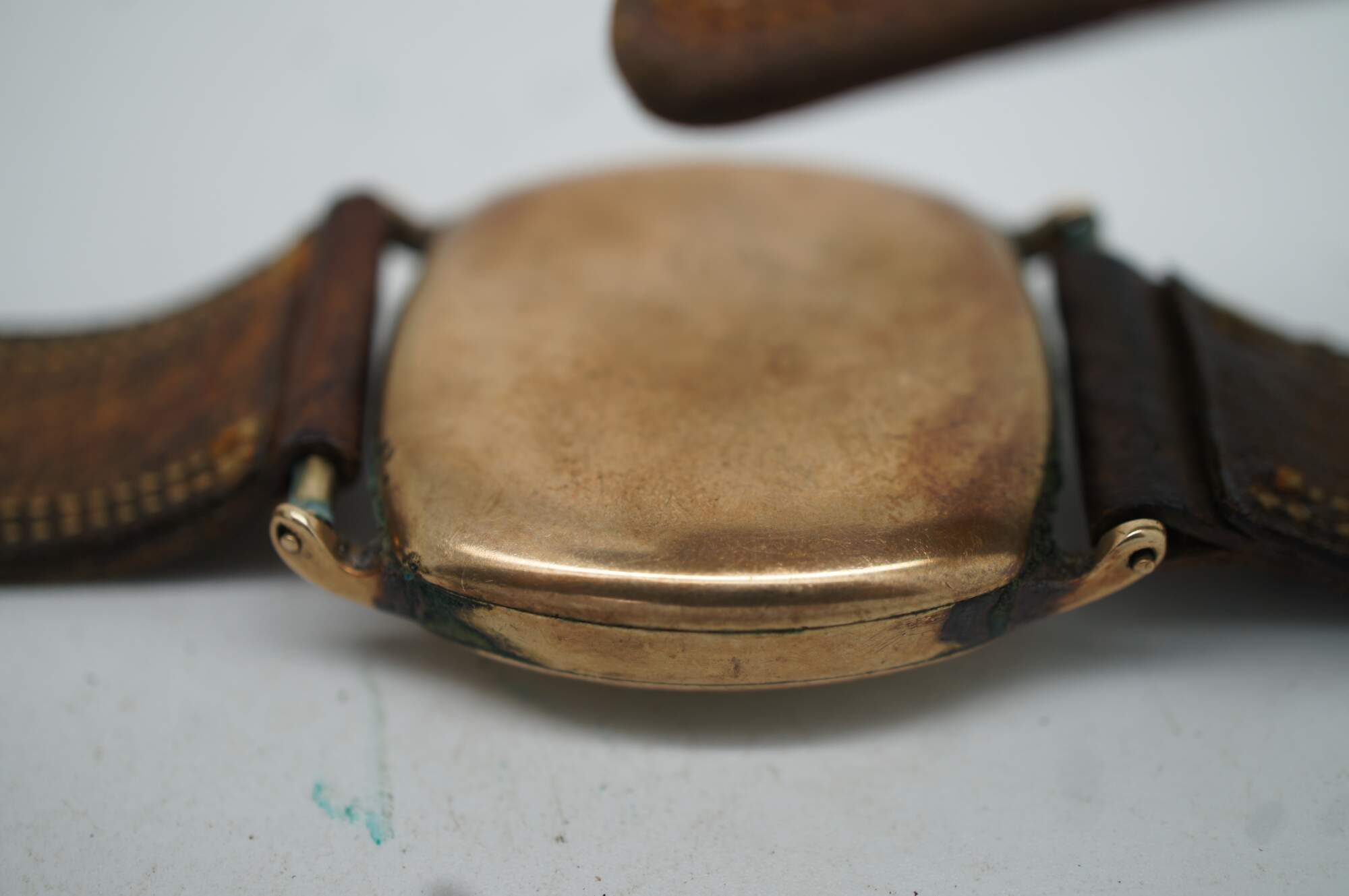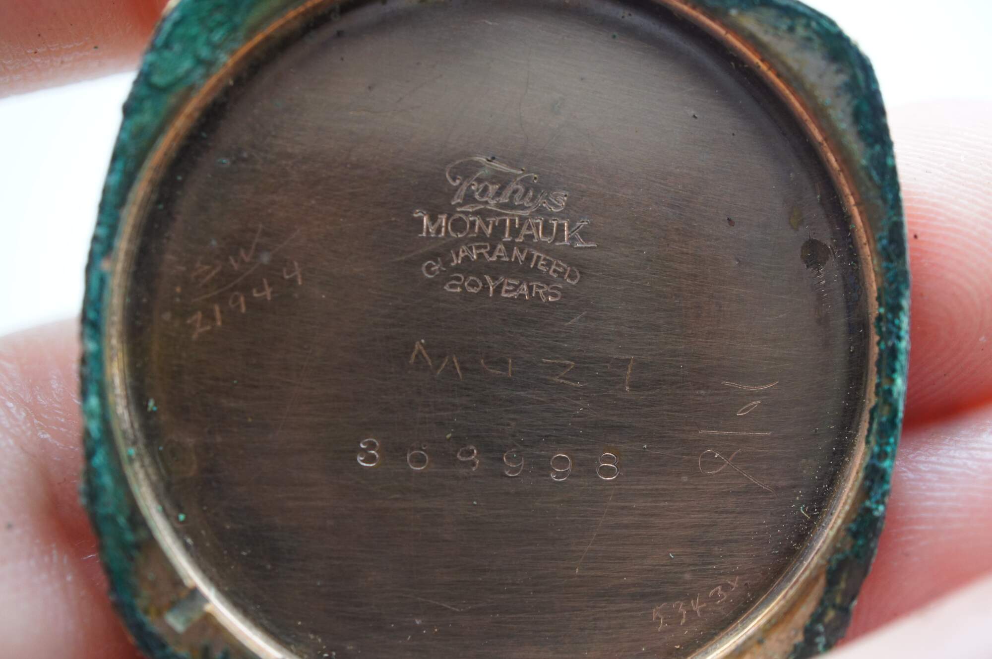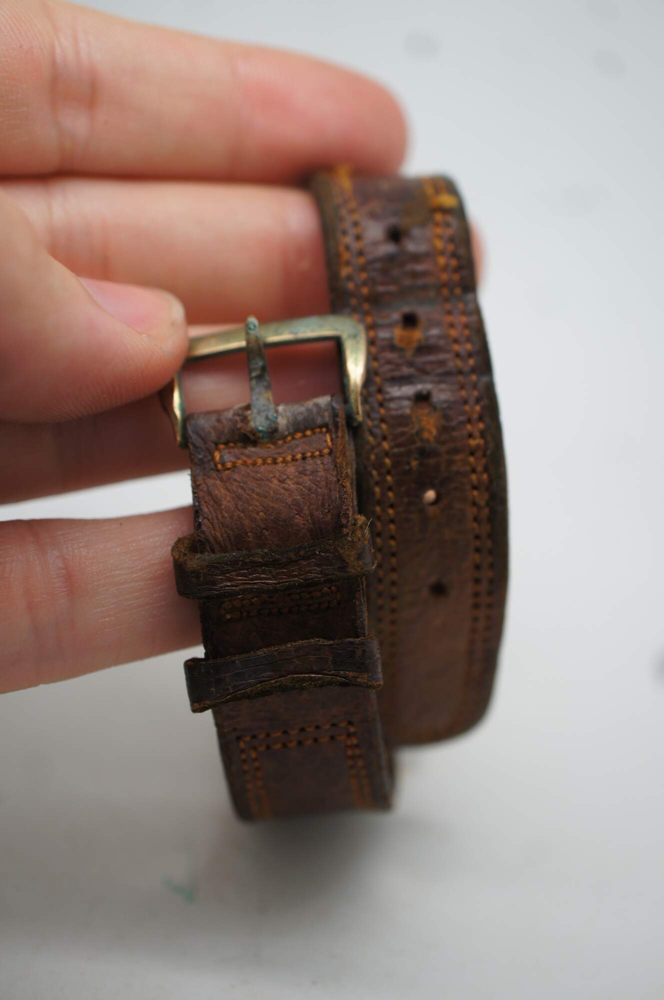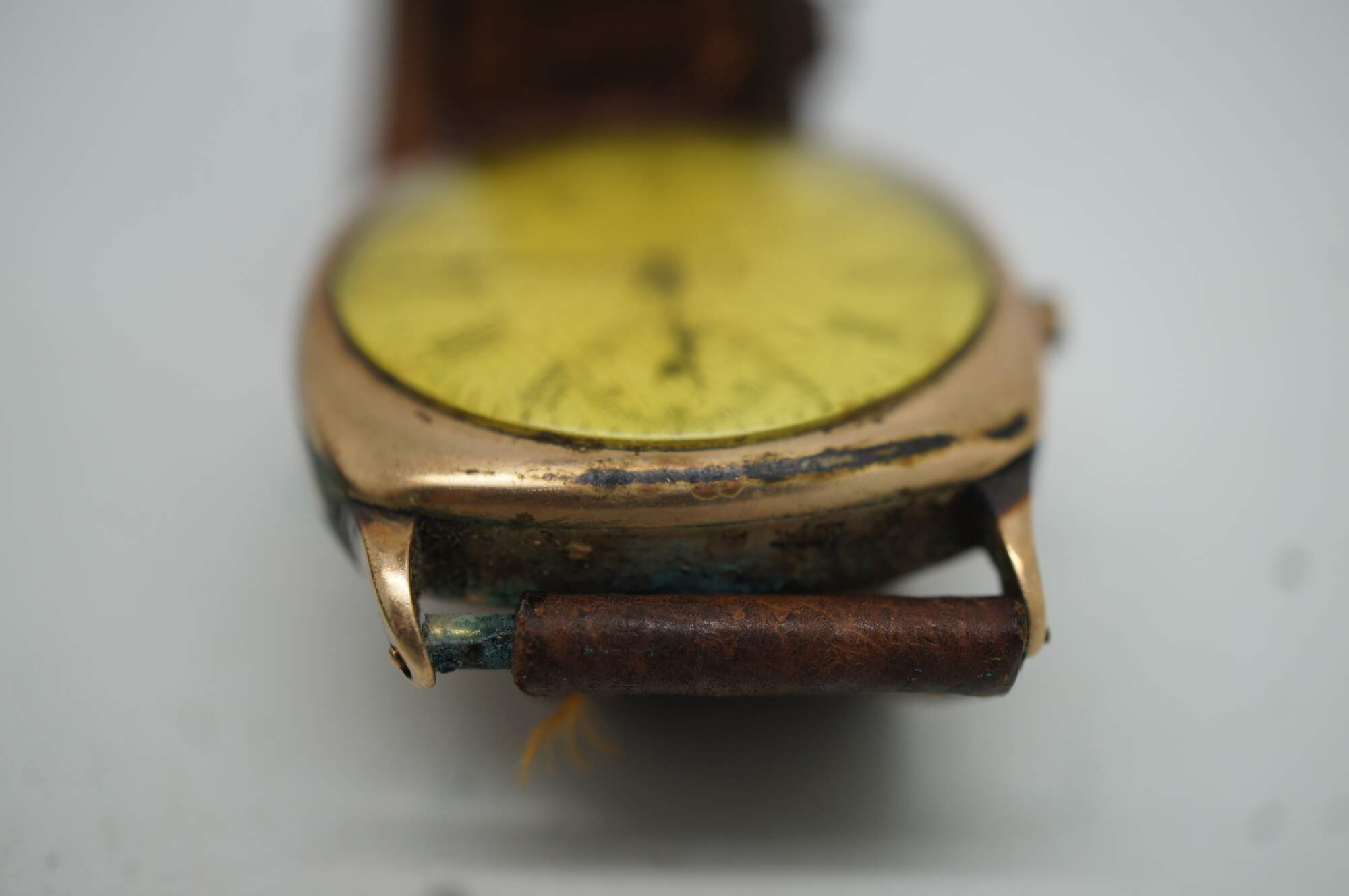 Antique (produced circa 1914) gold toned wrist watch by the American Waltham Watch Co of Waltham, Massachusetts - 15 Jewels, works numbered 19627750. Case by Fahys Montauk, numbered 368998. Grade No. 165, 15 jewels, 0s. Brown leather band.