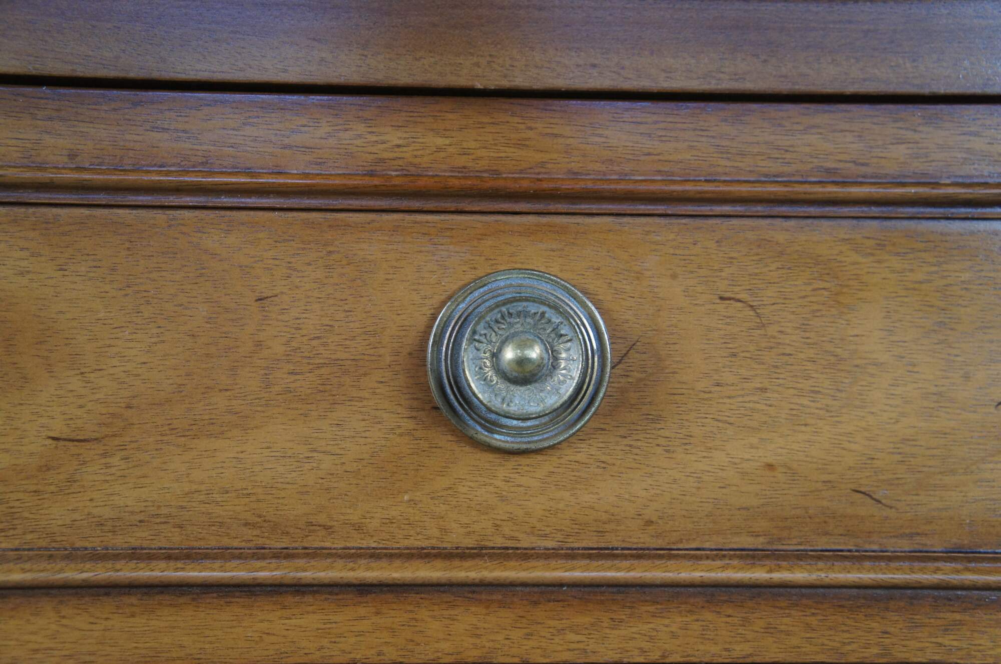 Vintage Drexel Triune china cabinet. Made of mahogany featuring upper curio with two shelves and plate grooves, and a lower cupboard with two doors and three drawers. Circa 1967. 555-420-2.