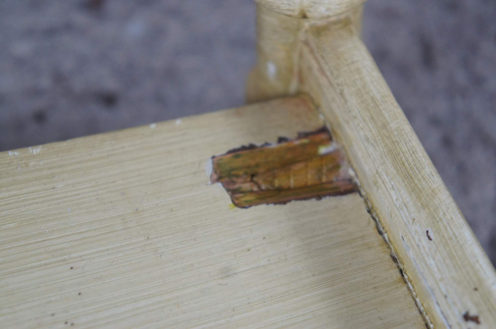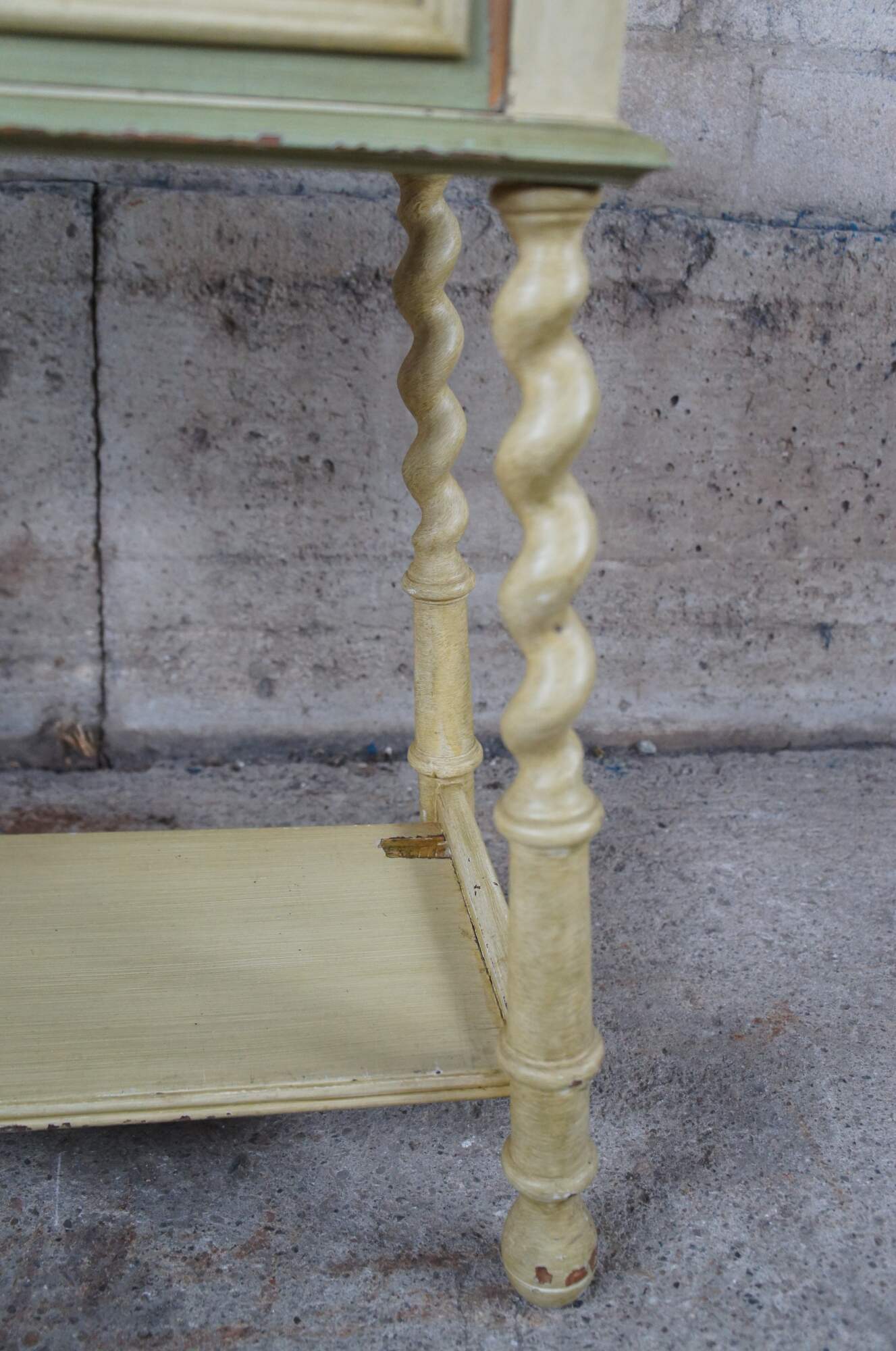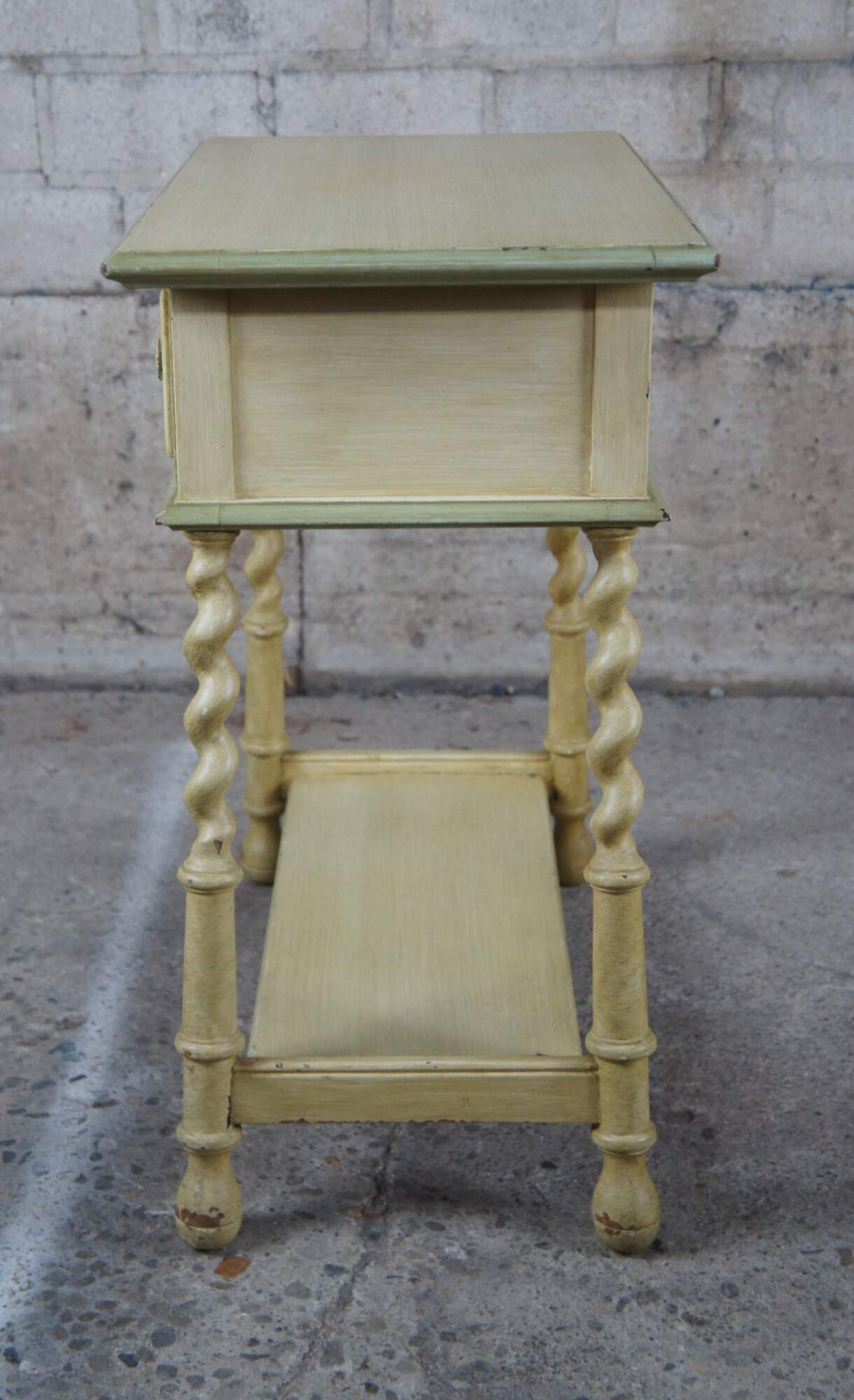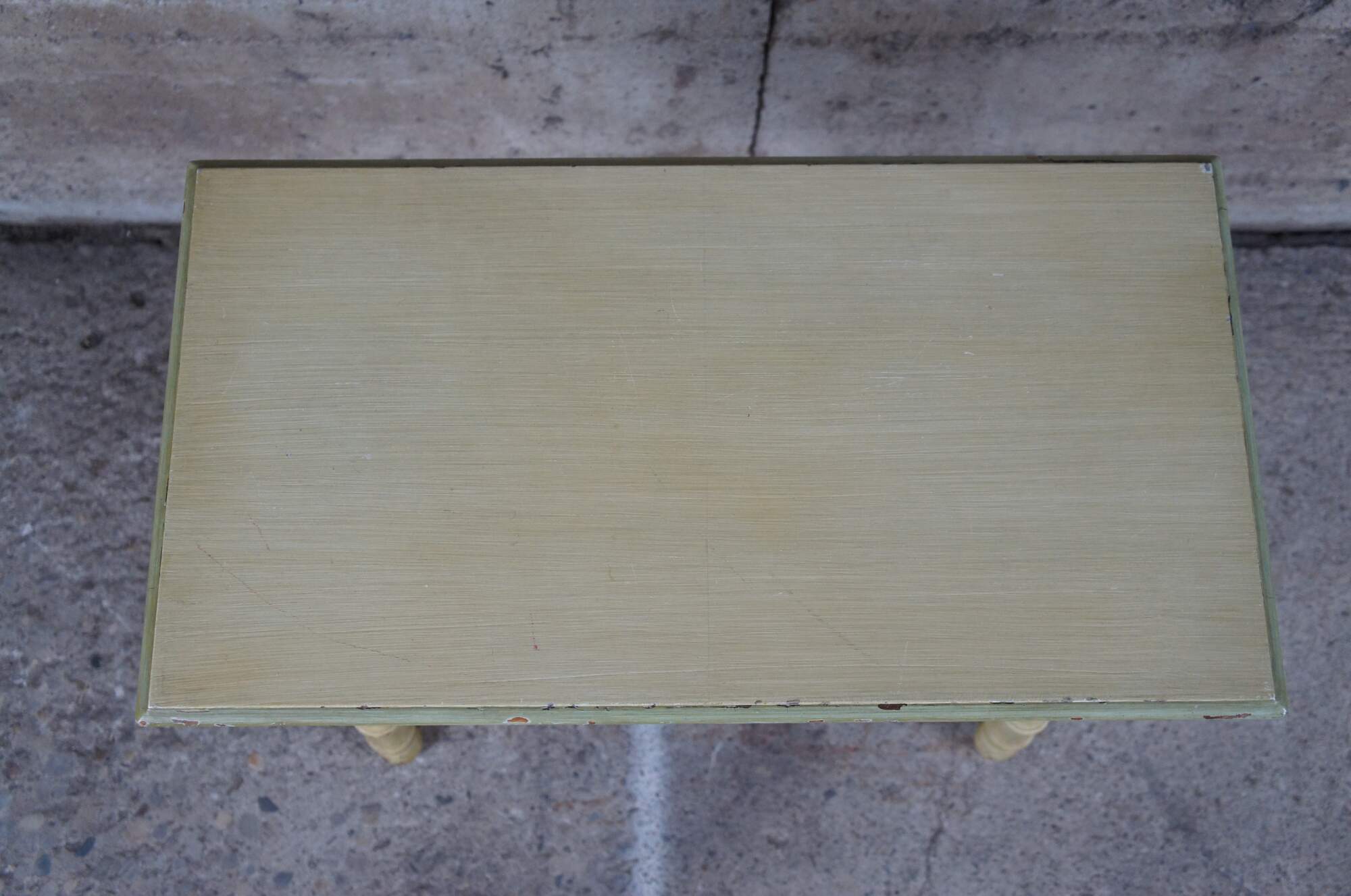 Distressing and wear commensurate with age. Paint chipping throughout. Some missing veneer along drawer front.