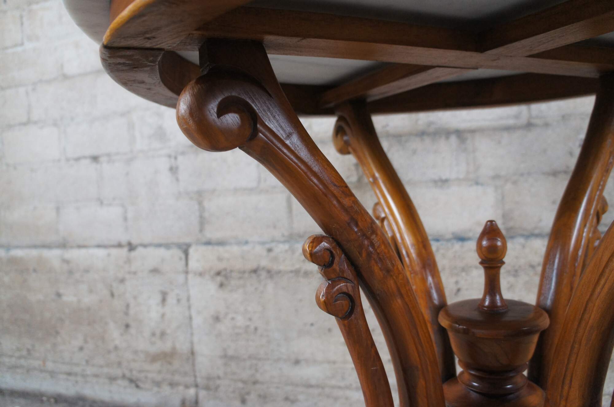 Victorian Revival parlor table. Made from mahogany with long shaped legs, a trophy finial and white marble top.
