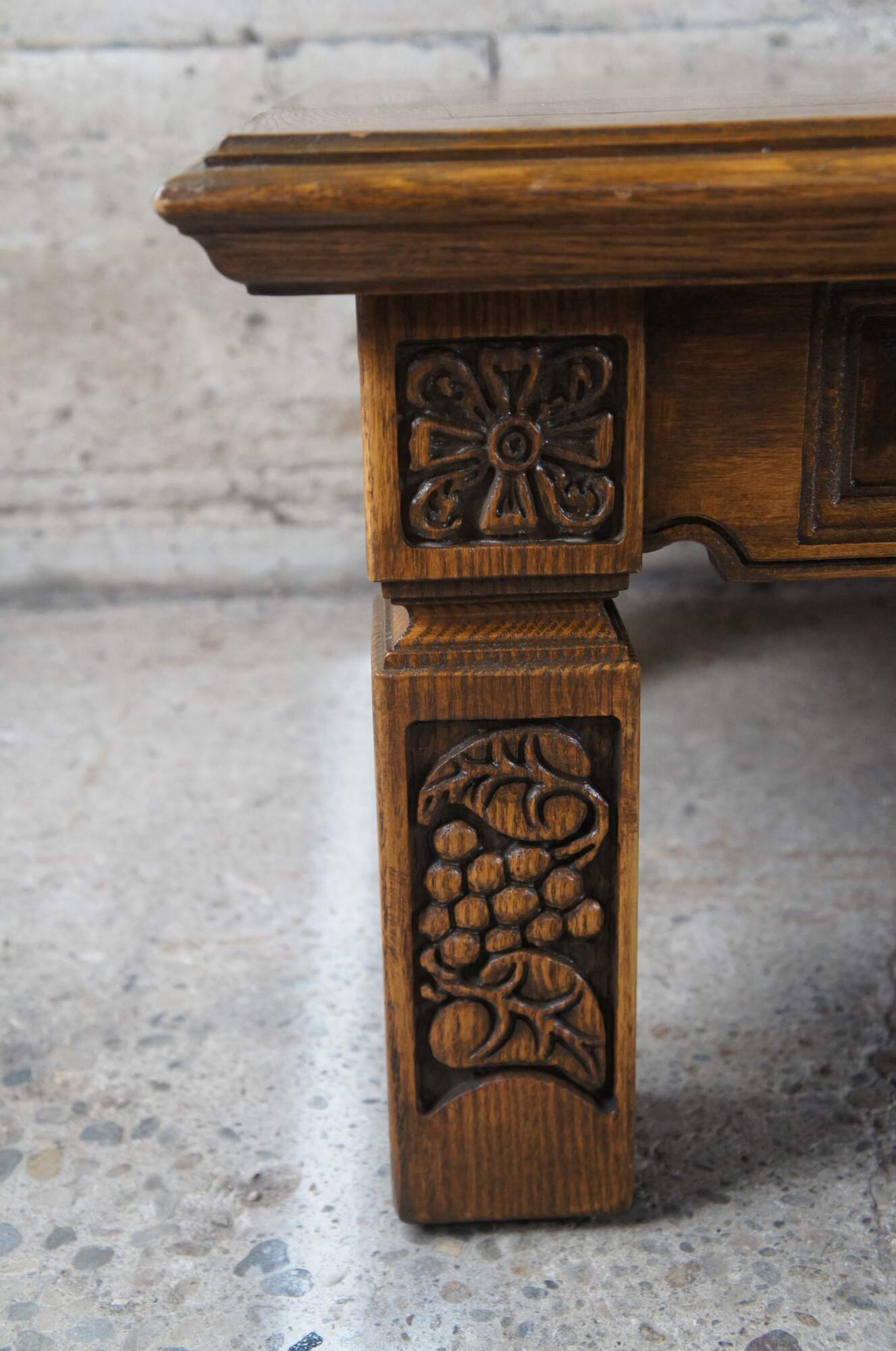 Romweber Viking Oak Coffee Table, circa 1970s. Features a short rectangular carved oak frame with grapevine and Nordic motif over squared legs. Table top has a parquetry design. An iconic piece from the mid century era that is great for office, home or library use.