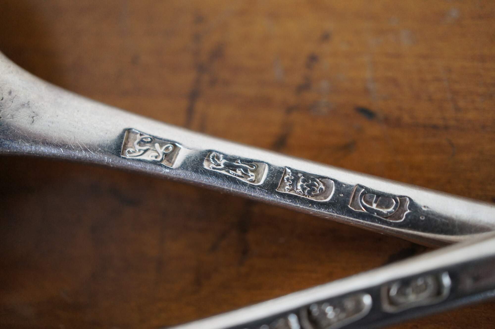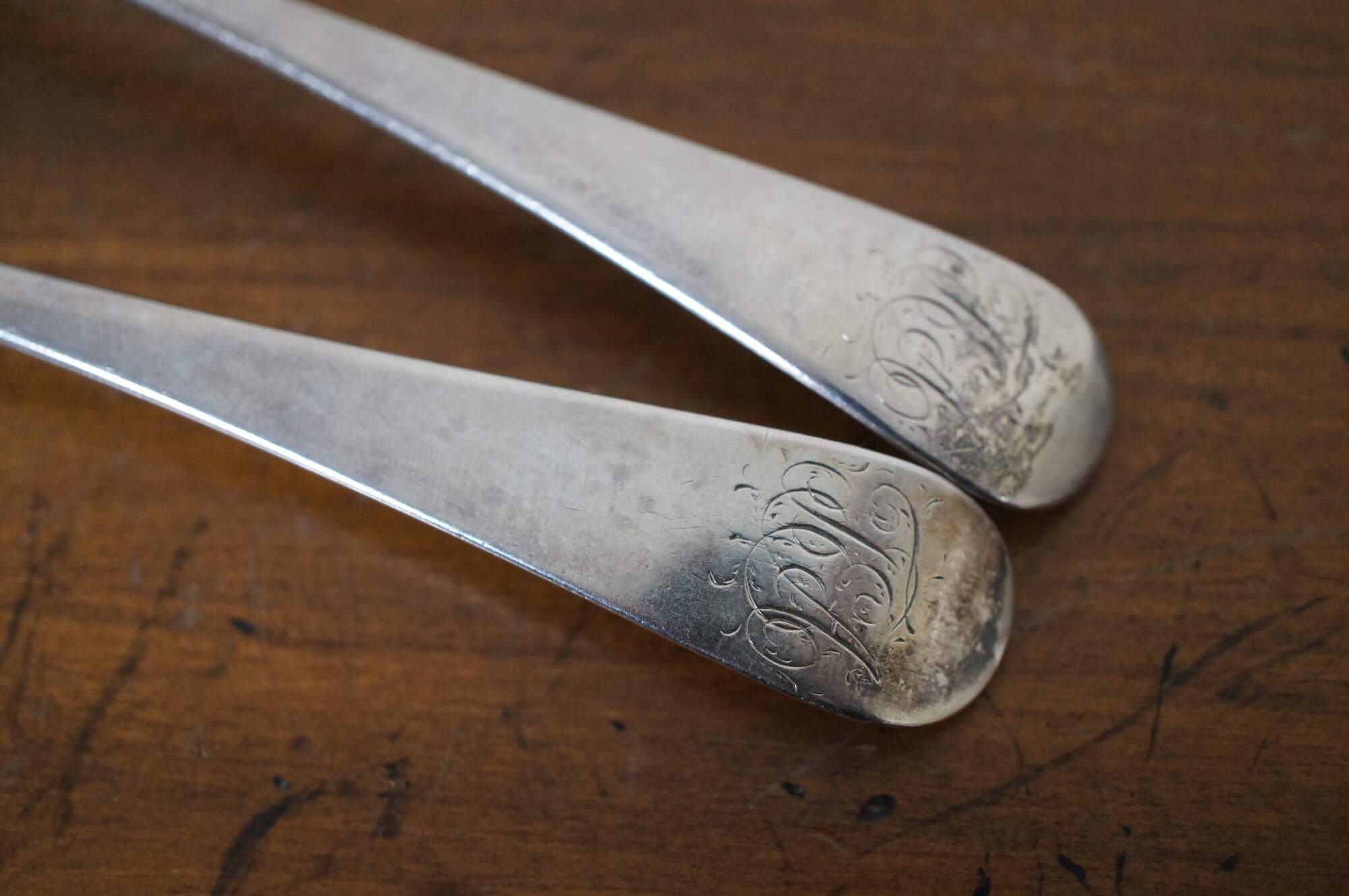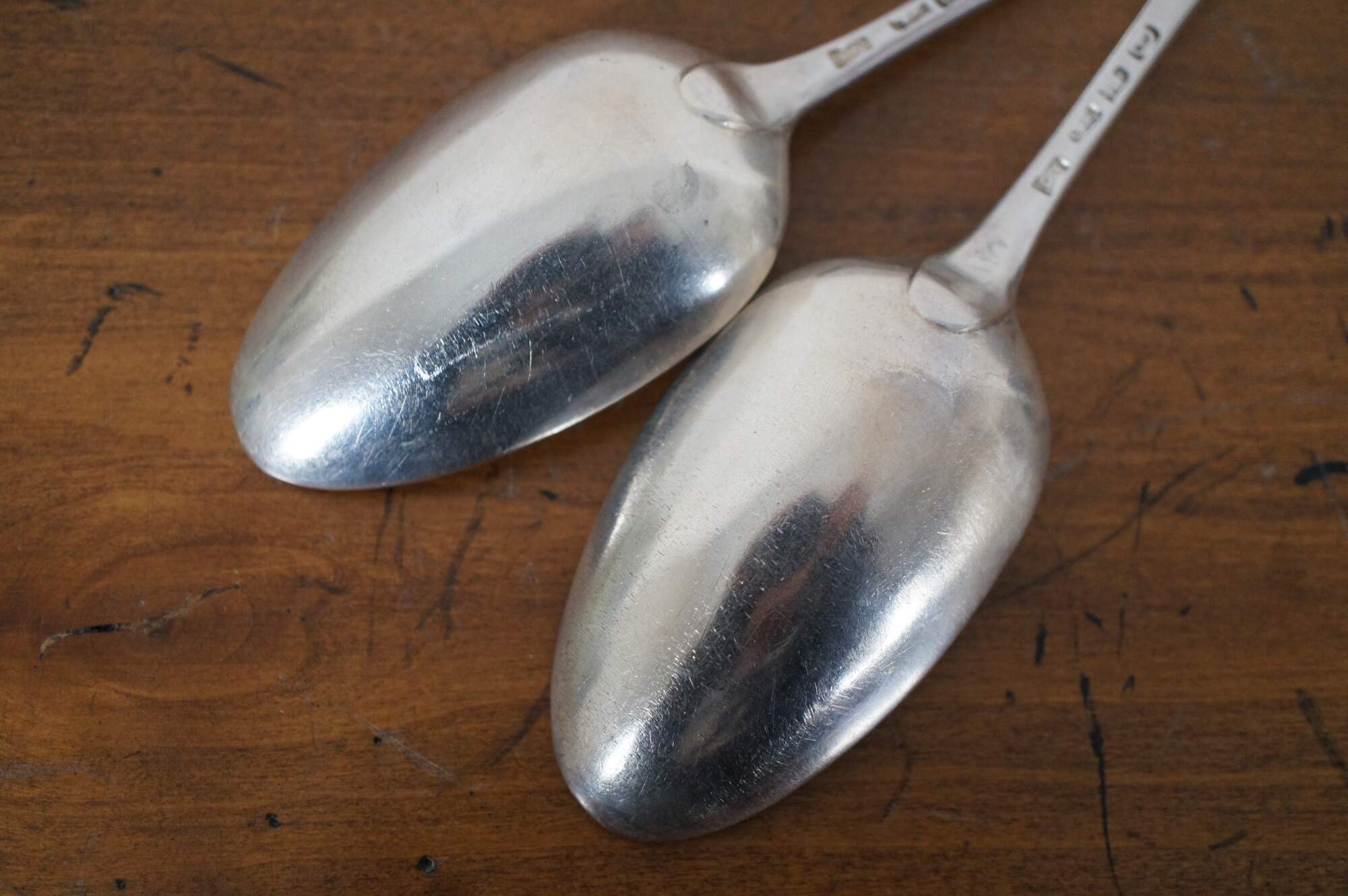 Pair of large heavy antique late 18th century Georgian sterling silver serving spoons with tipped handles, monogrammed with the initials TA. Made in 1780 by George Smith III of London England.
