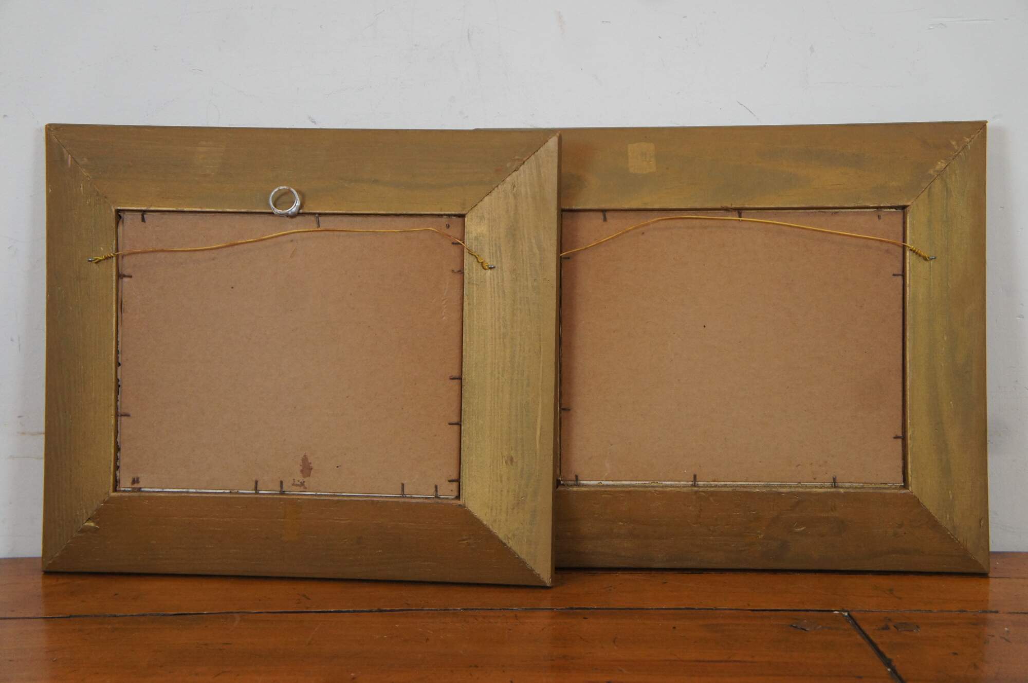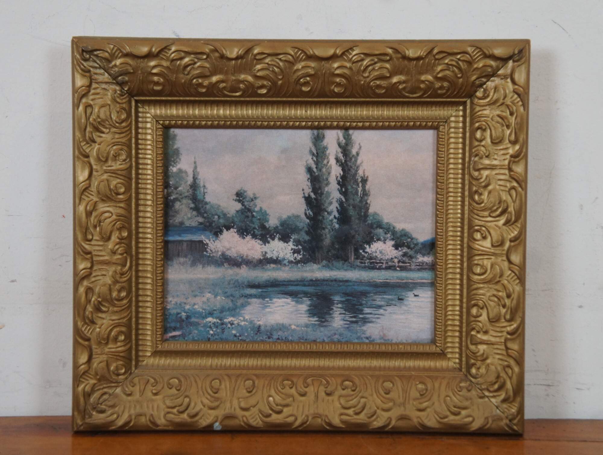 Pair of mid 20th century framed prints on board, enhanced with a textured varnish to mimic brush strokes. Barn landscape - Paul Detlefsen’s “Spring Morn.” Lake and pines landscape - Robert Wood’s “Spring Eternal.” Includes ornate antique gold painted frames.