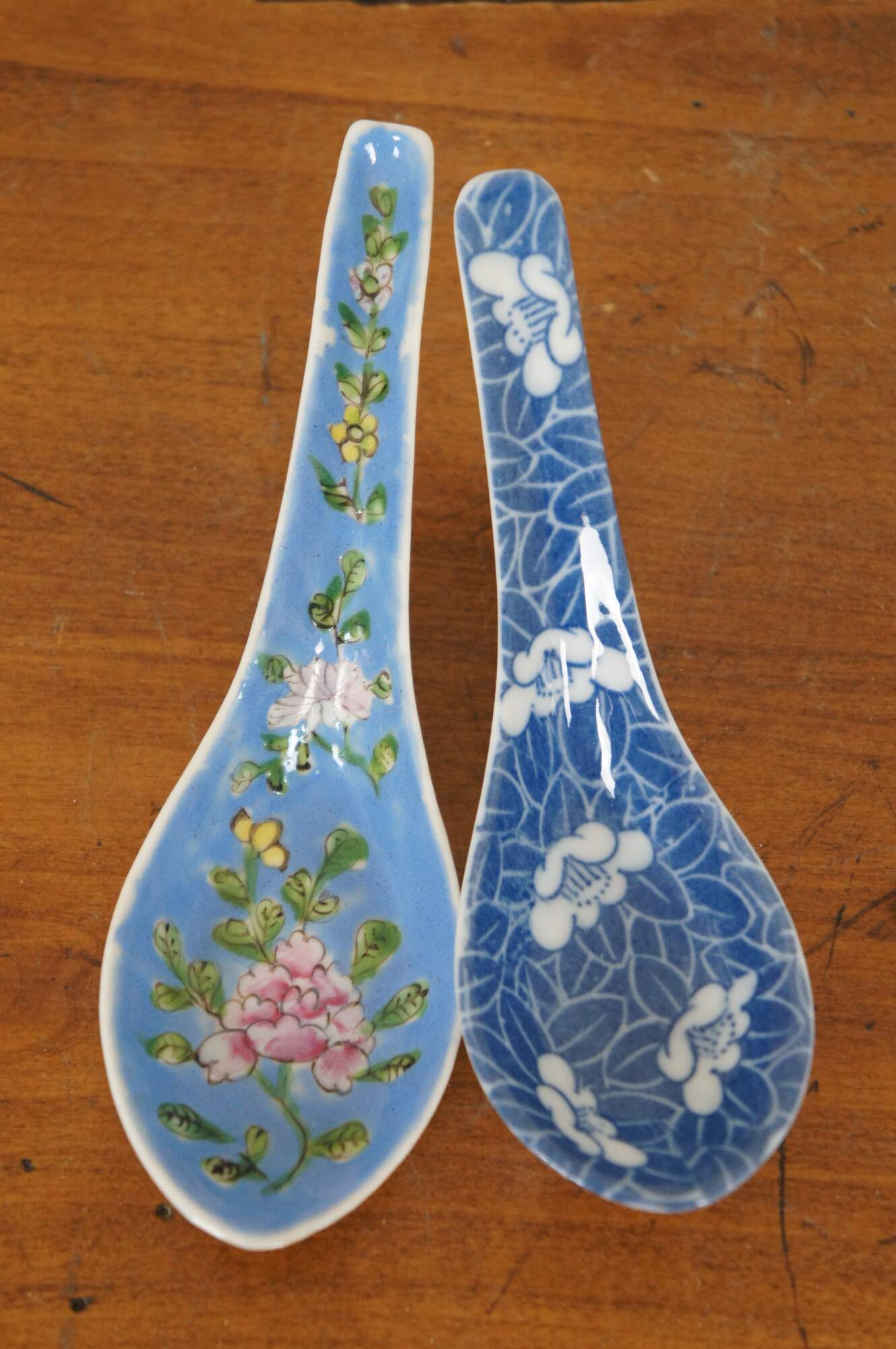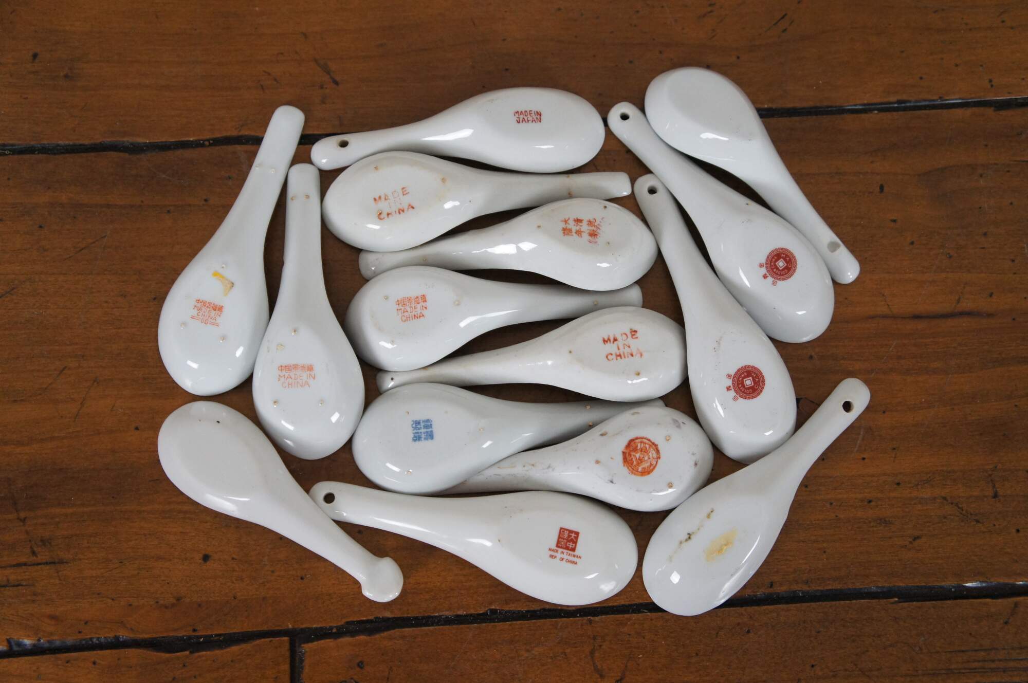 Lot of fifteen assorted Chinese and Japanese porcelain soup spoons in a wide variety of patterns and colors.