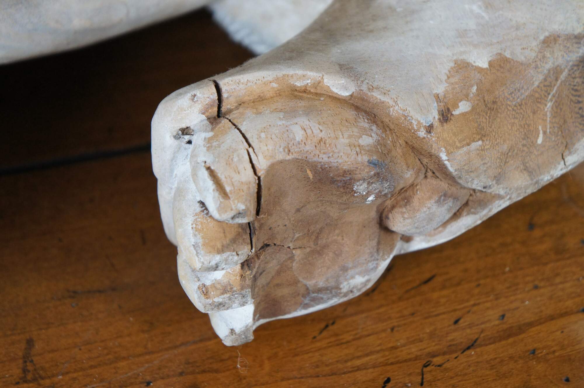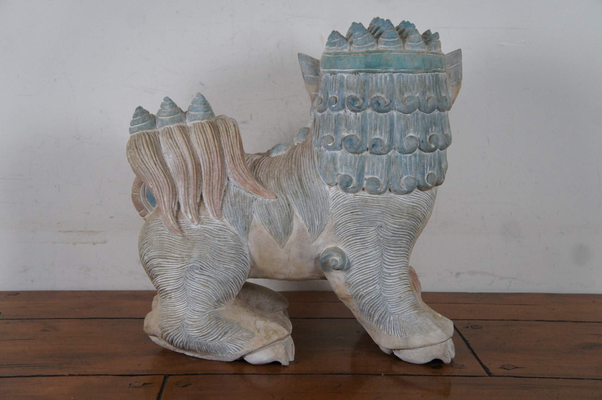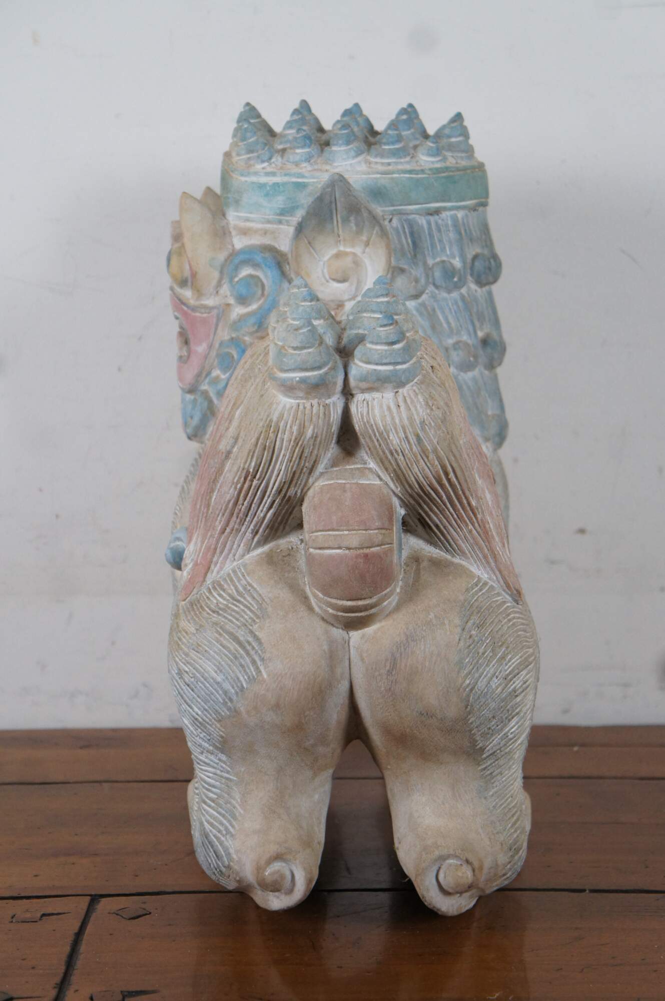 Vintage Asian carved wood sculpture of a male guardian lion / foo dog with rope ball beneath his paw and multicolored painted features. Made from Teak.
