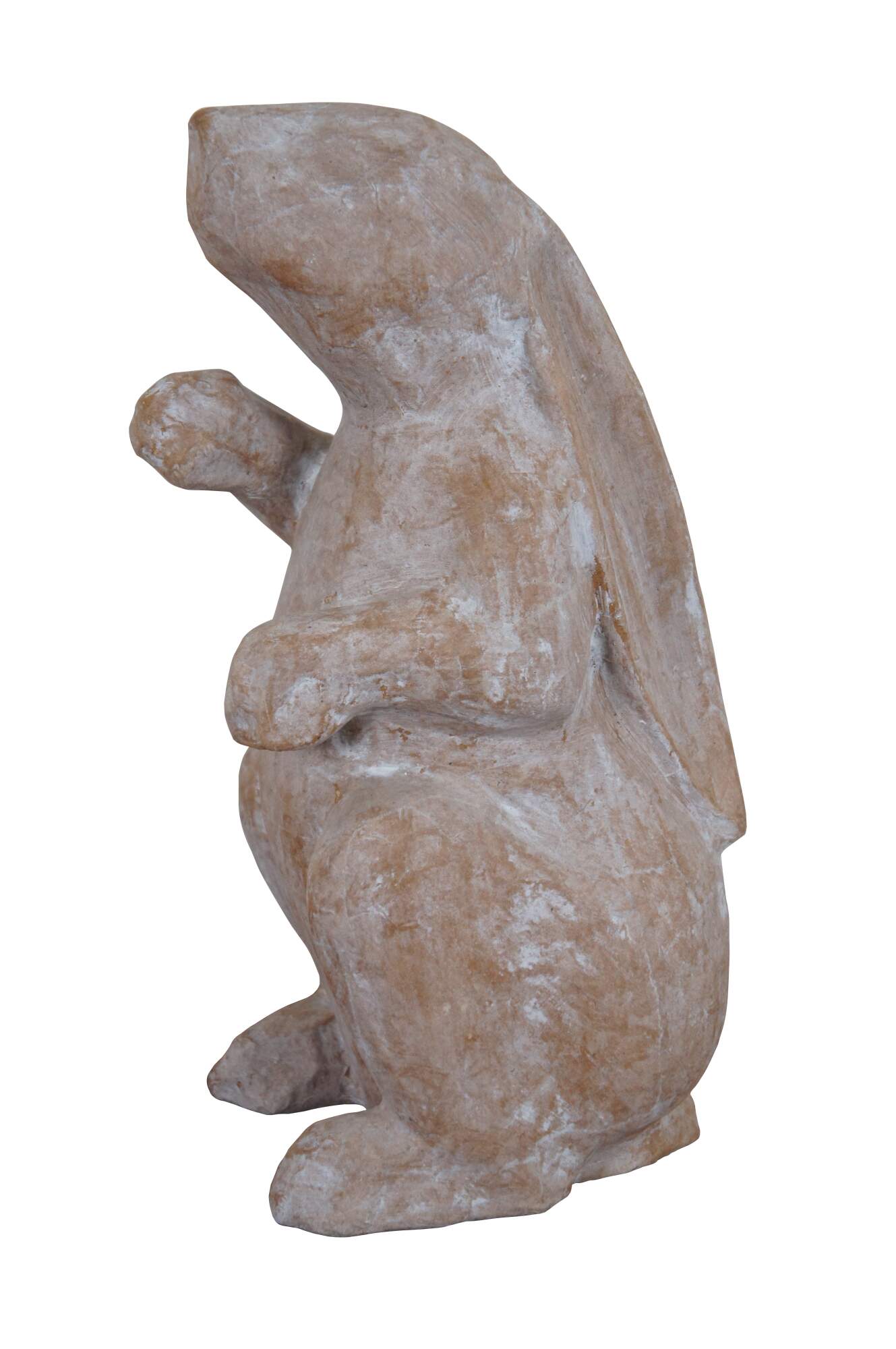 Pair of vintage paper mache rabbit sculptures, one laying and one standing, in light brown with brushed white distressing.