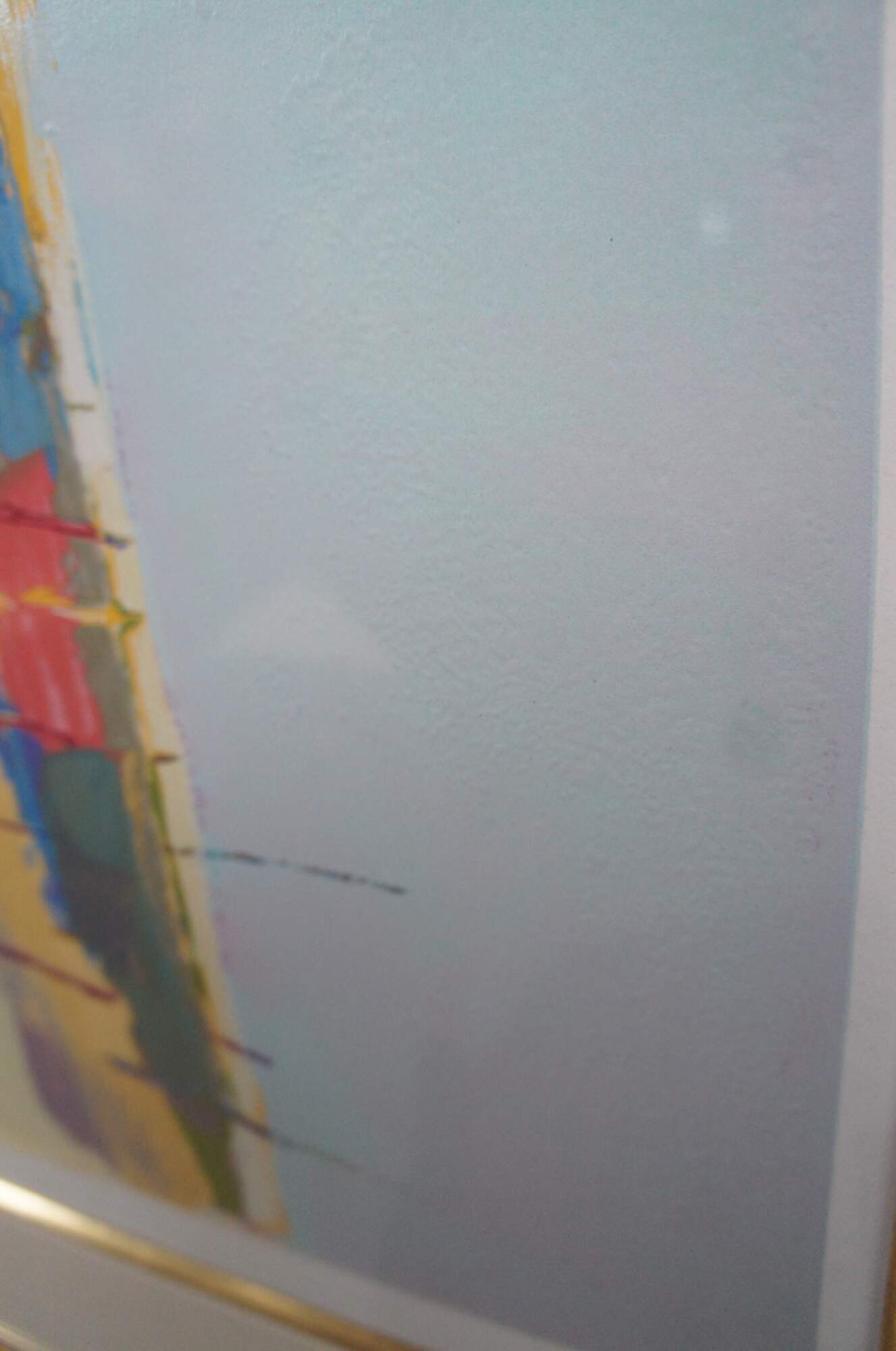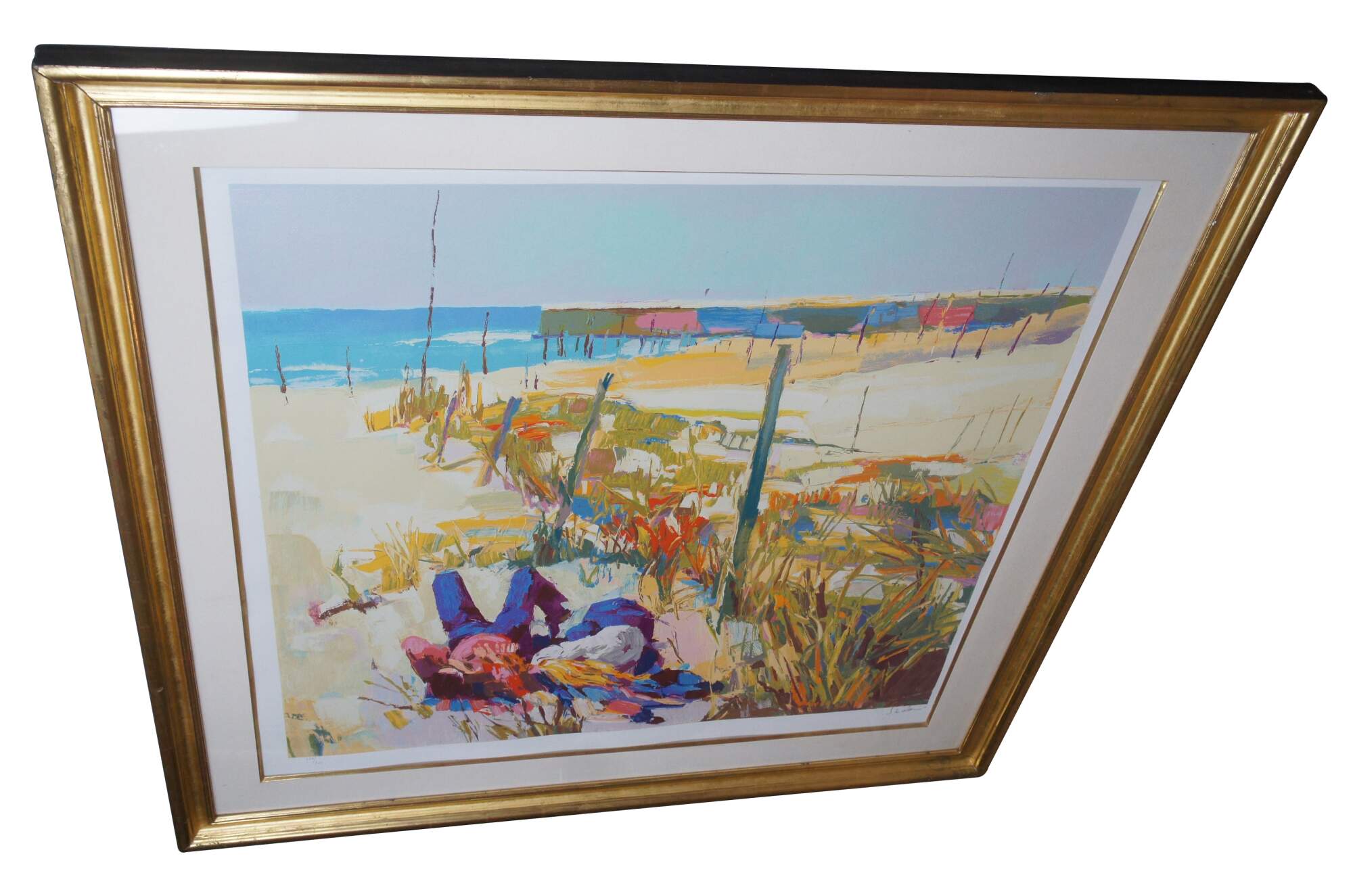 Vintage 1970s limited edition serigraph print by Nicola Simbari, showing a figure of a couple laying at the beach with boats and water in the background; pencil signed and numbered 126/300. “Nicola Simbari is a painter of semi-abstract impressionist works. He is a colorist who favors brilliant tones, richly layered with a palette knife. Simbari paints to convey light and energy and provide new definition through intensity of vision and technique.
