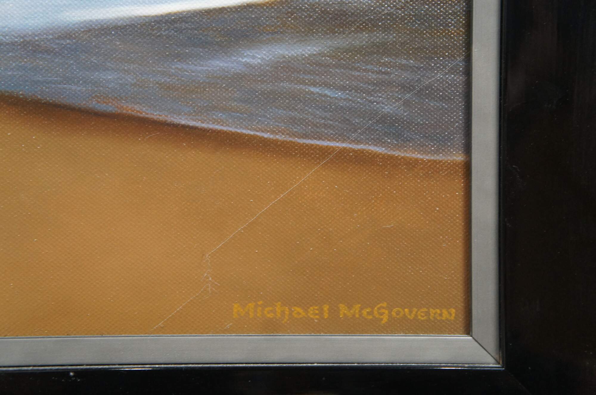 Vintage Michael McGovern """"Foggy Morning"""" nautical seascape oil painting featuring sailboats / boats docked at harbor. Circa 2000.