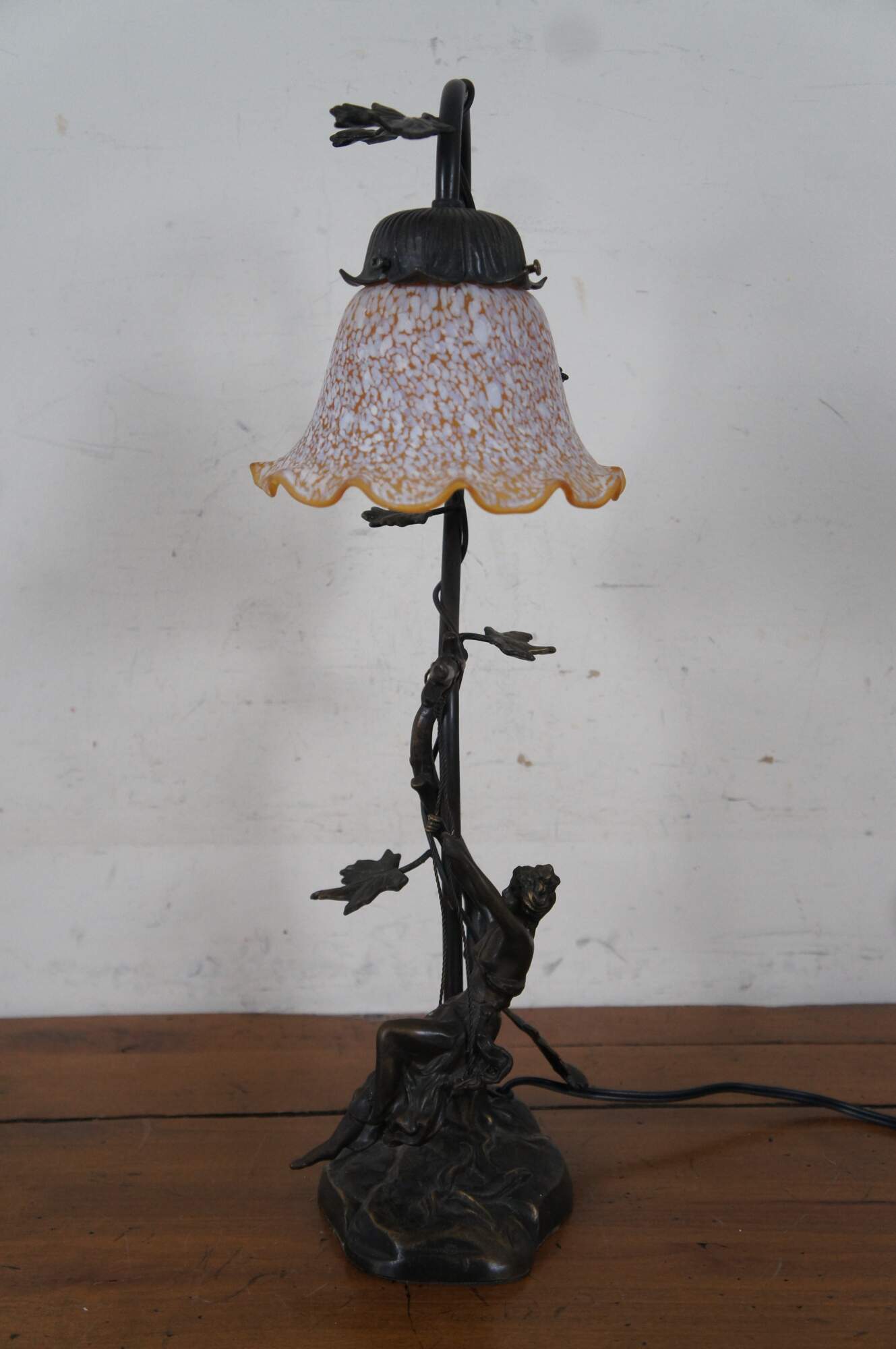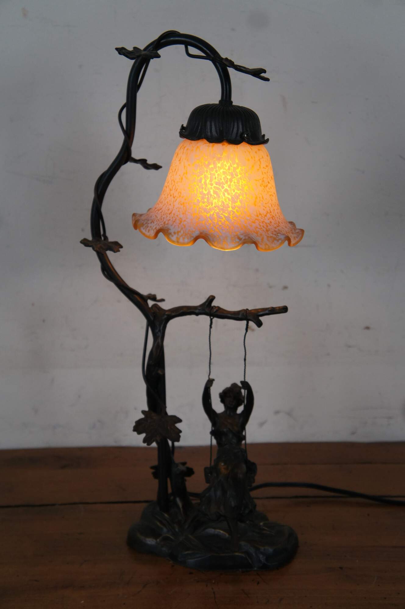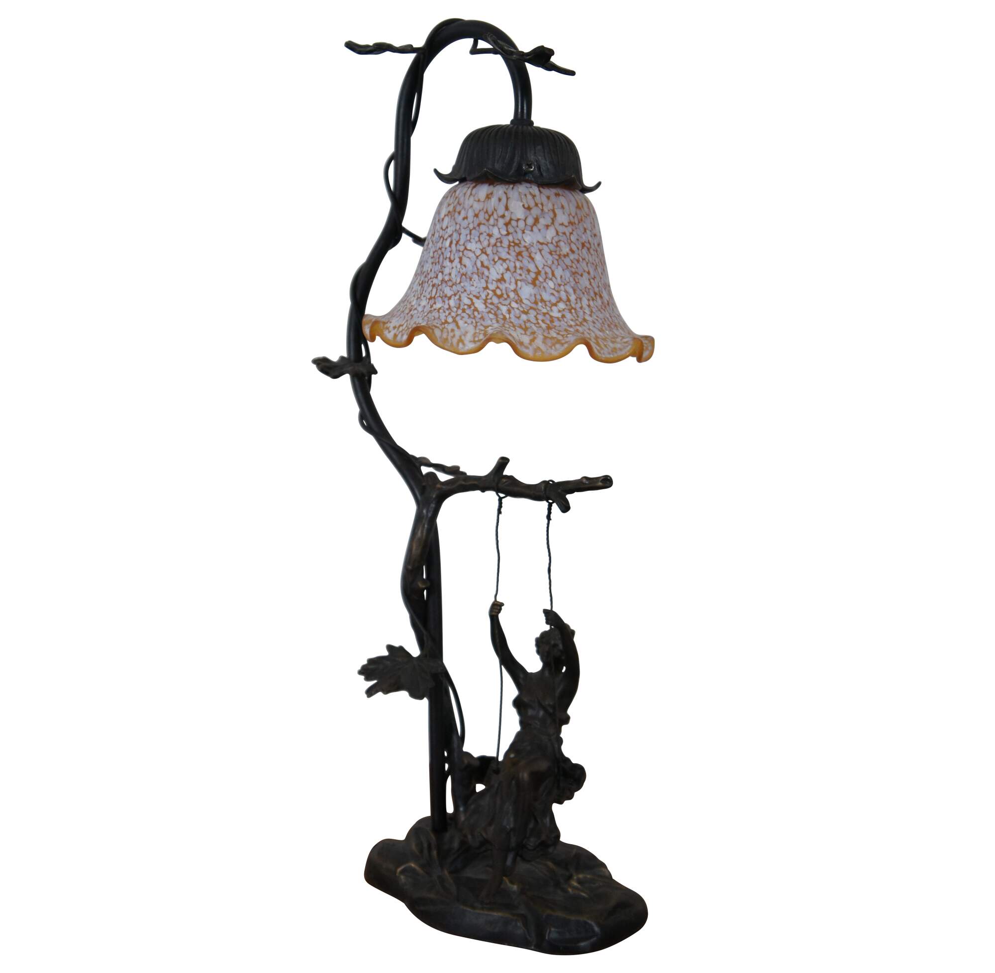 Vintage art nouveau style bronze table lamp after Mathurin Moreau in the shape of a branch entwined with ivy leaves, from which a female figure swings; the top of the branch curves down, finishing in an orange and white tulip shaped shade. Marked M. Moreau at rear of base.