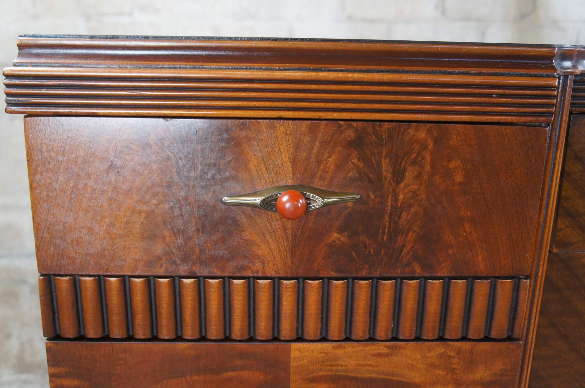 An amazing Art Deco buffet, circa 1930s. Made from walnut with an intriguing "V" grain, crotch veneer and bakelite hardware. The buffet has ribbed accents with two cabinets and four dovetailed drawers.