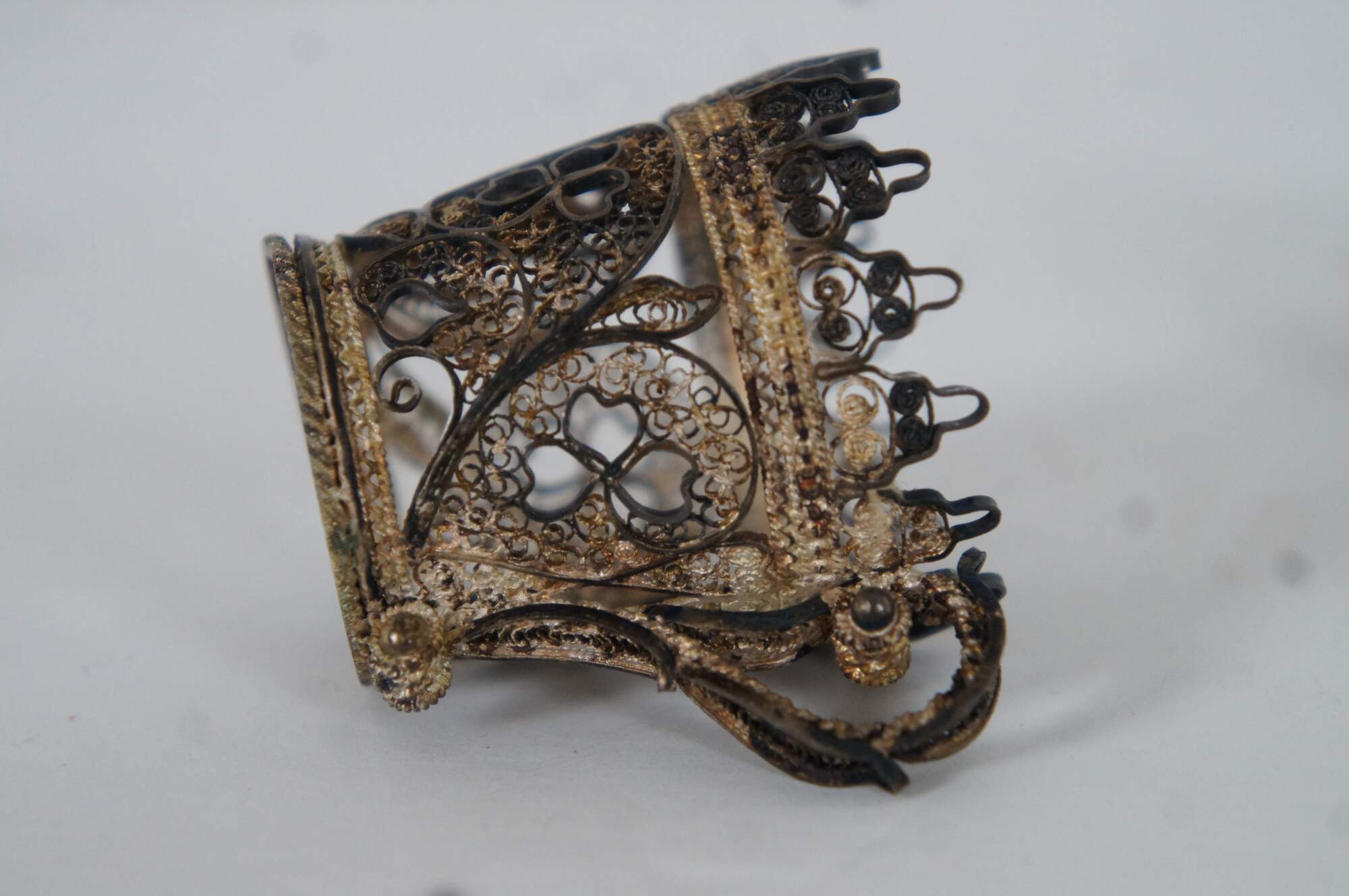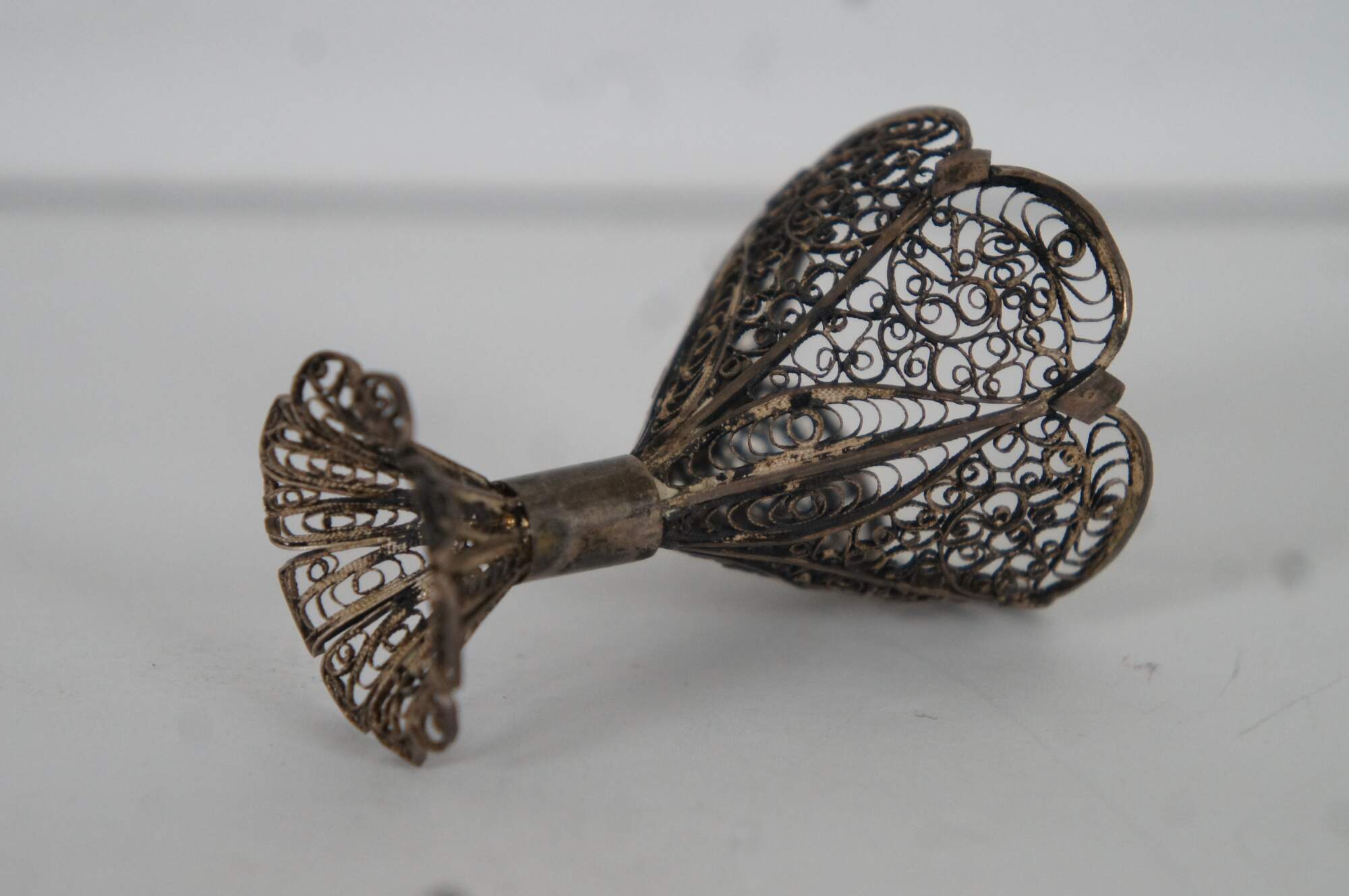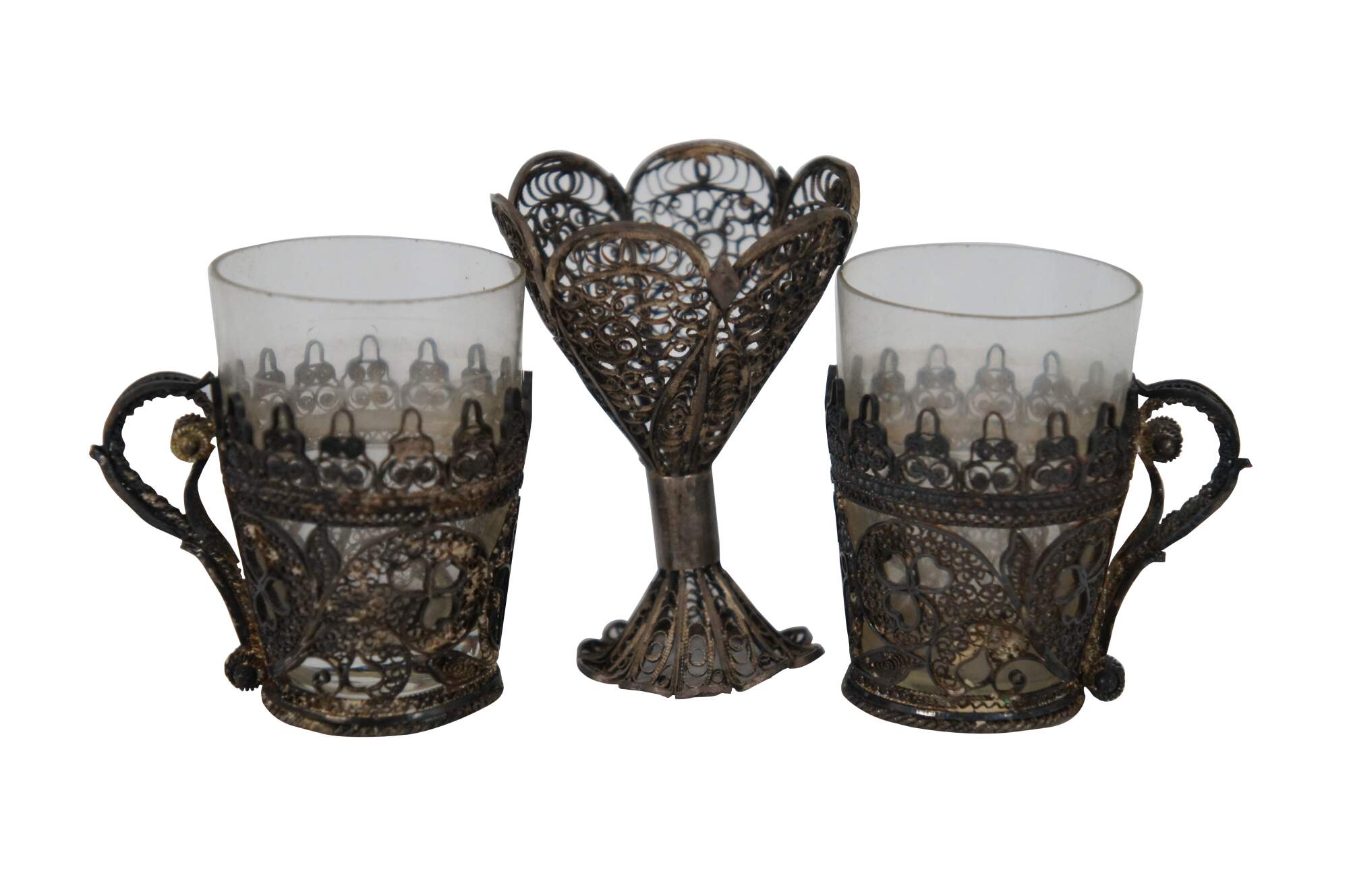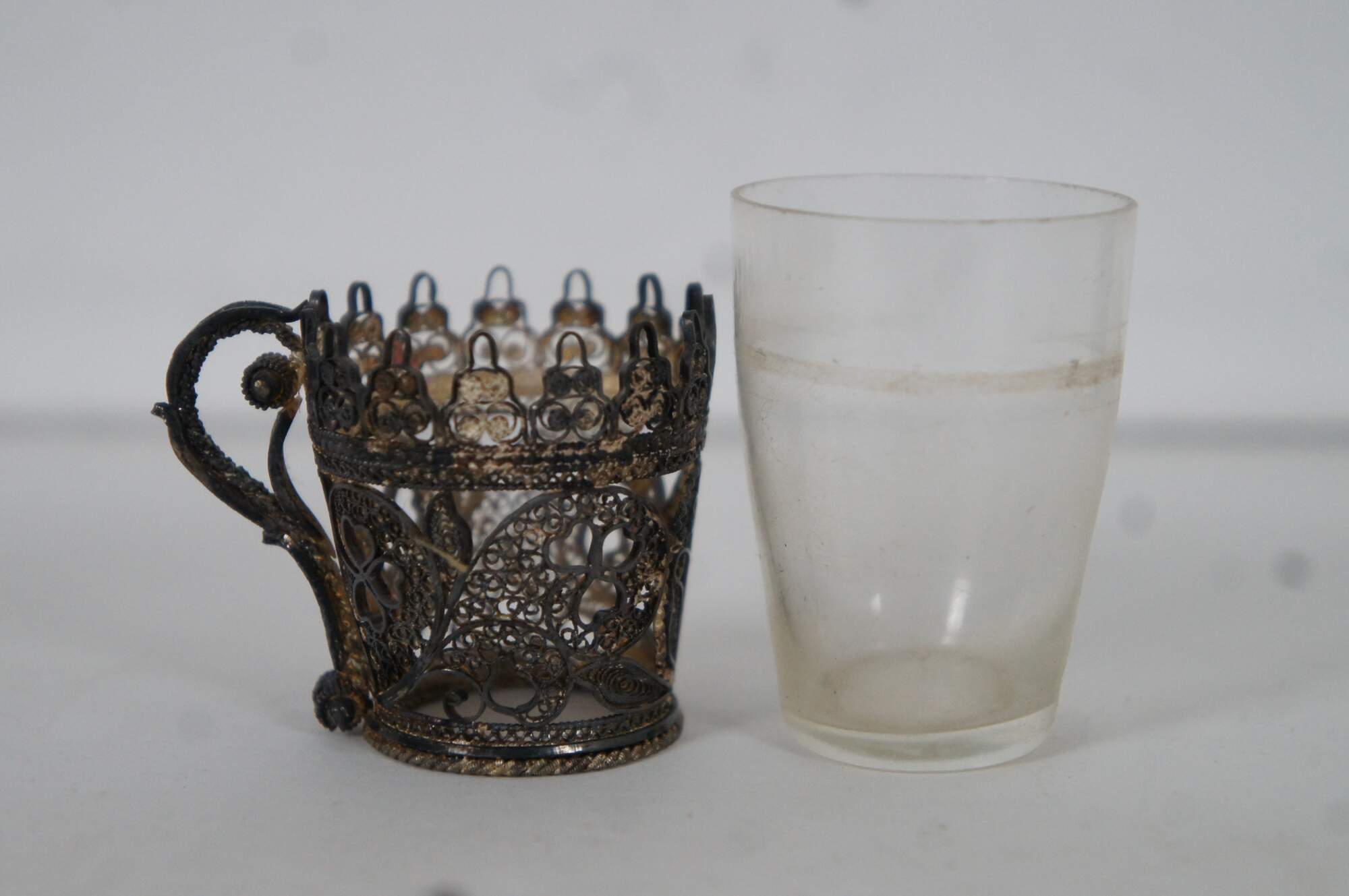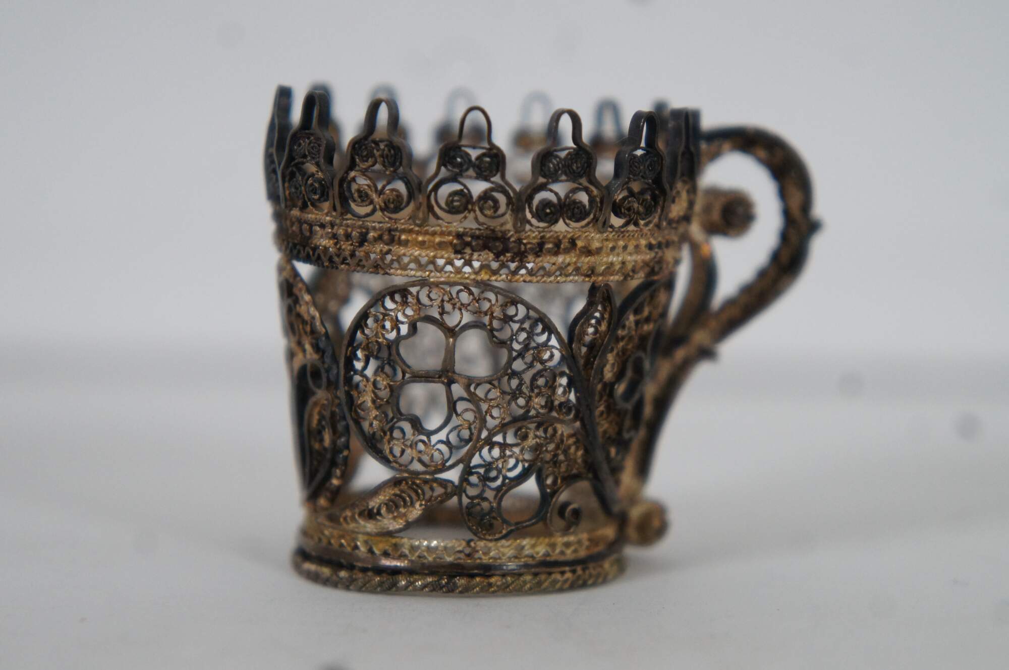 Lot of six antique metal filigree shot glass / cordial cup overlay sleeves, five mug shaped (includes two glass inserts) and one egg cup. All are intricately decorated with spirals, scallops, and three leaf clovers / shamrocks.