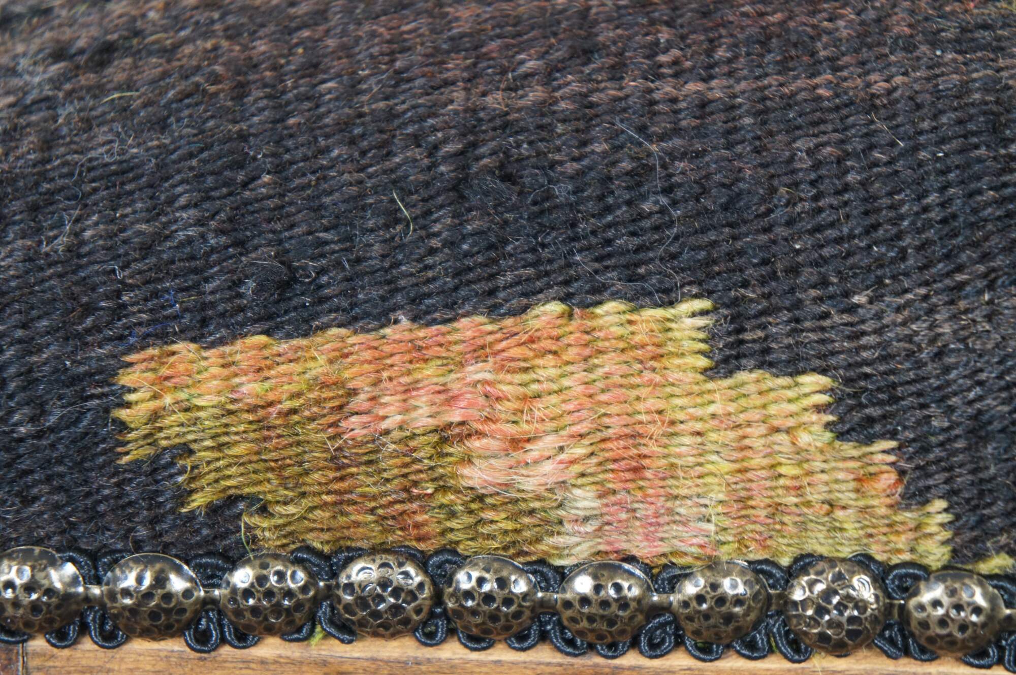 Vintage rectangular wooden footstool / ottoman featuring a padded needlepoint top decorated with leaves and flowers in green, blue and orange with nailhead trim.