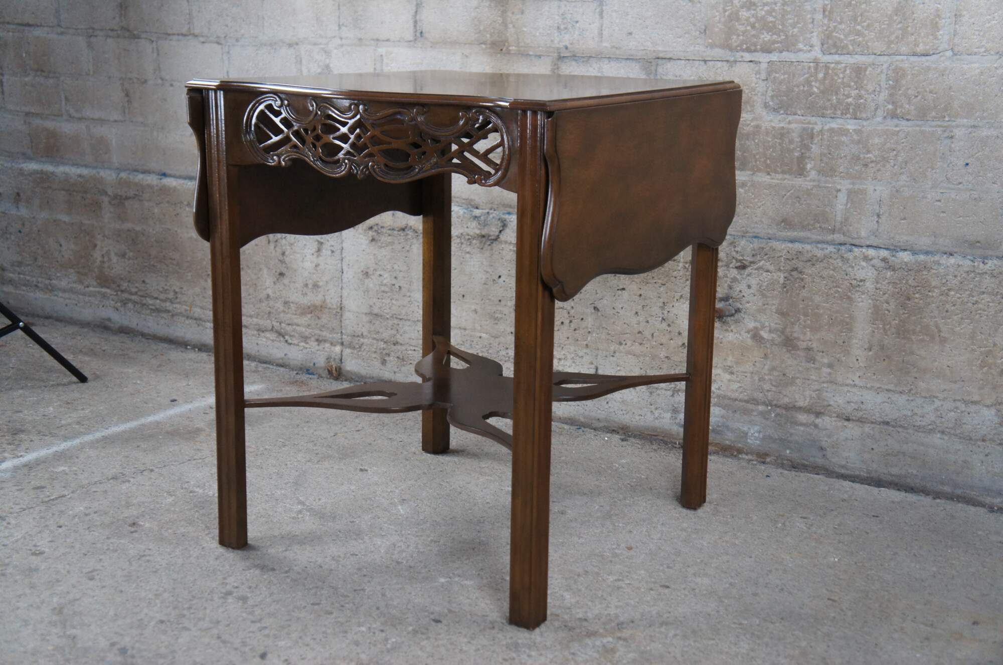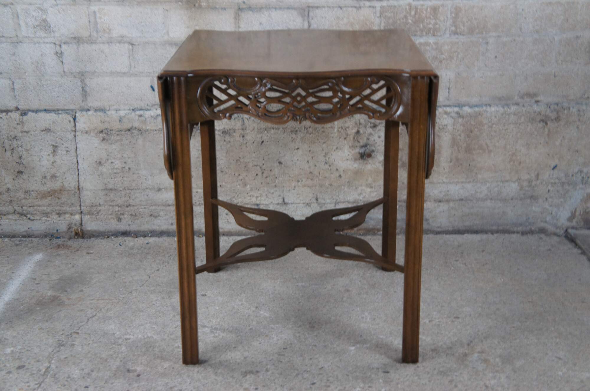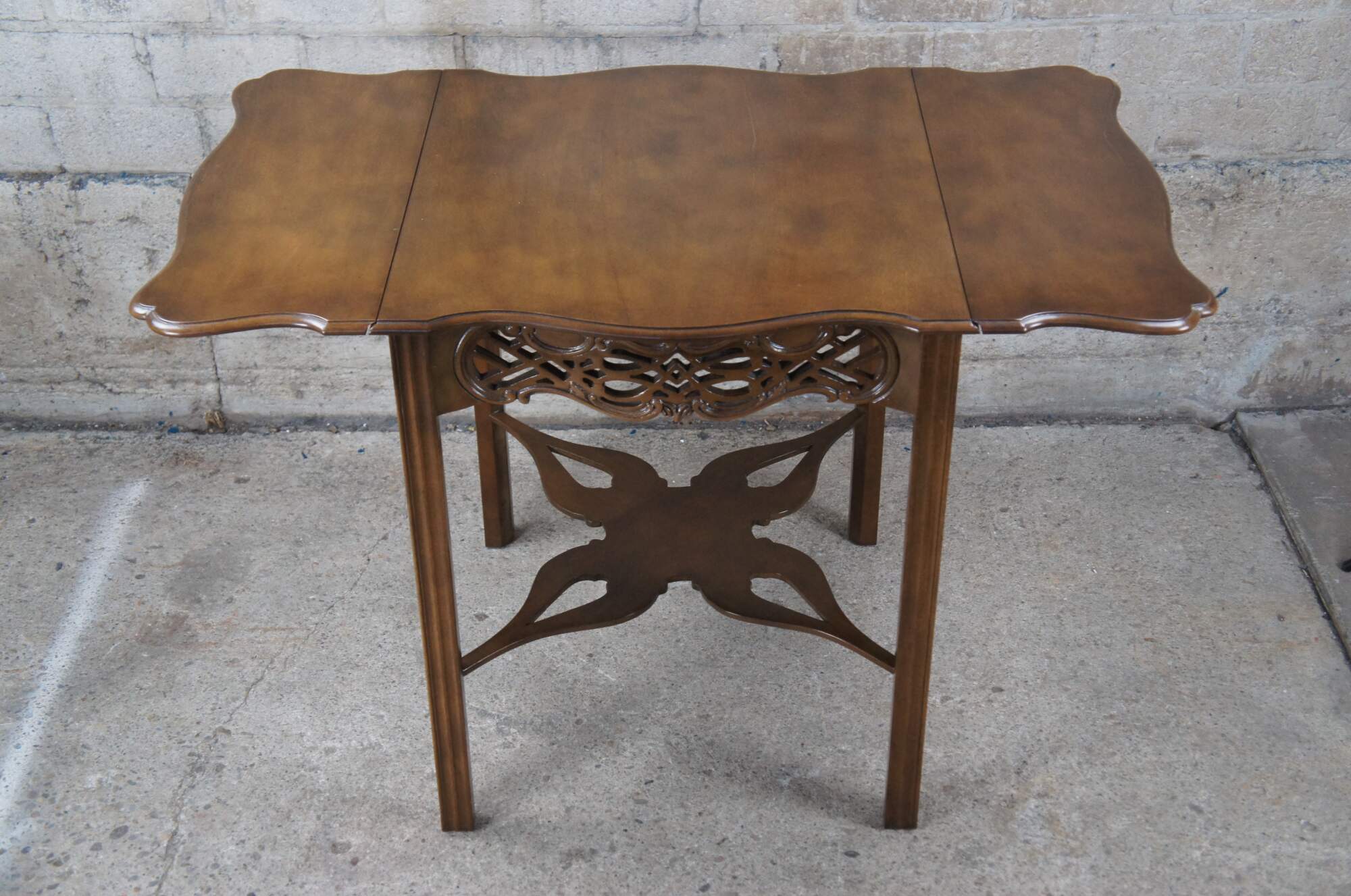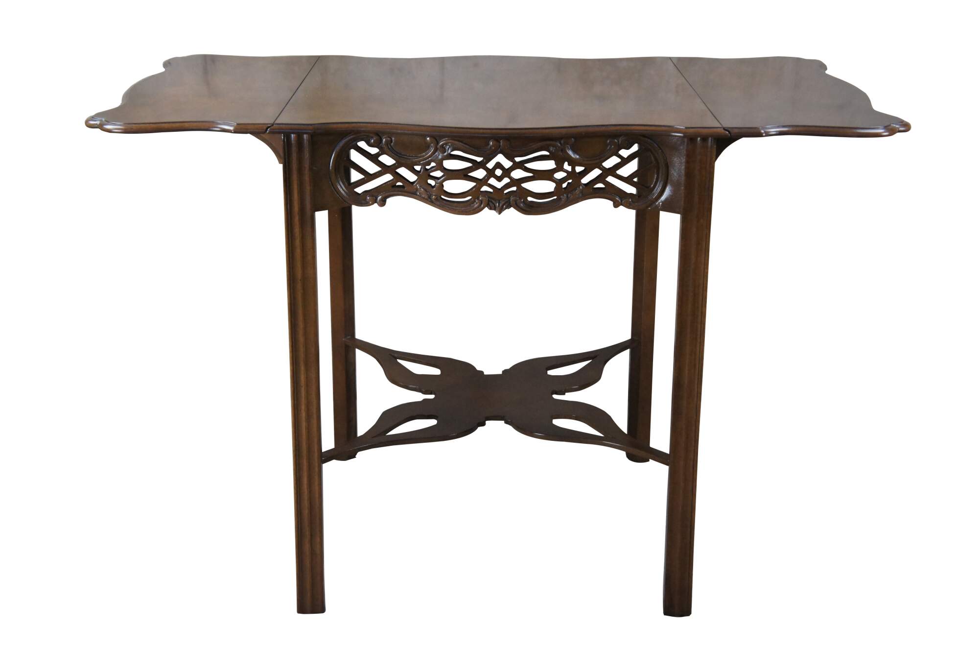 An impressive Baker Furniture Chippendale style mahogany pembroke table, circa 1970s. Featuring drop-leaf sides and a serpentine top with intricately carved open fretwork frieze. Supported by straight chamfered legs and joined by butterfly stretchers. Baker produced a very limited number of these tables as part of their historic Charlston collection. Supporting makers mark and limited edition badging underneath.