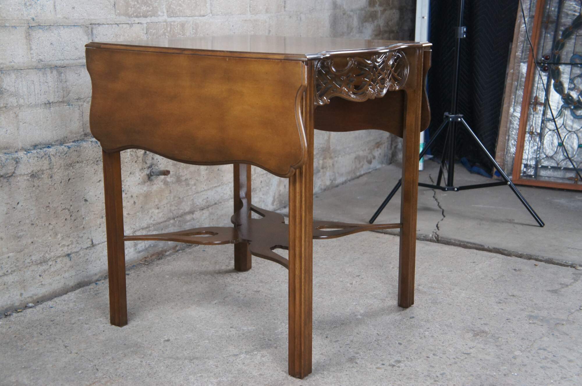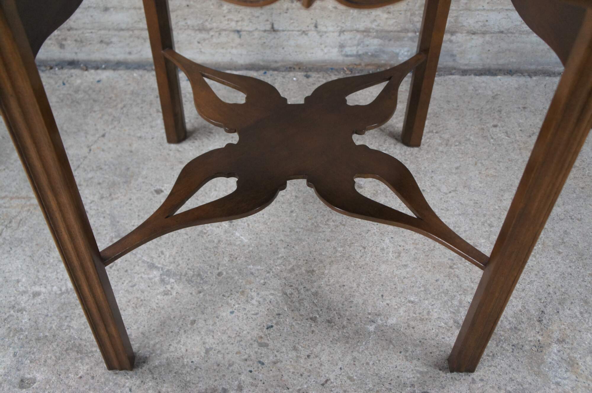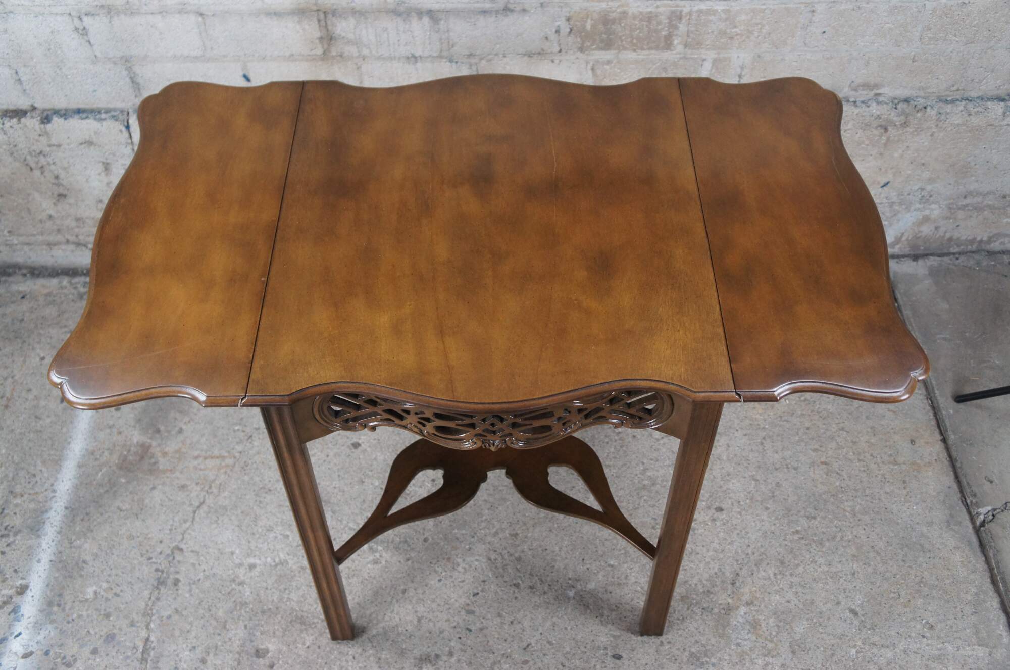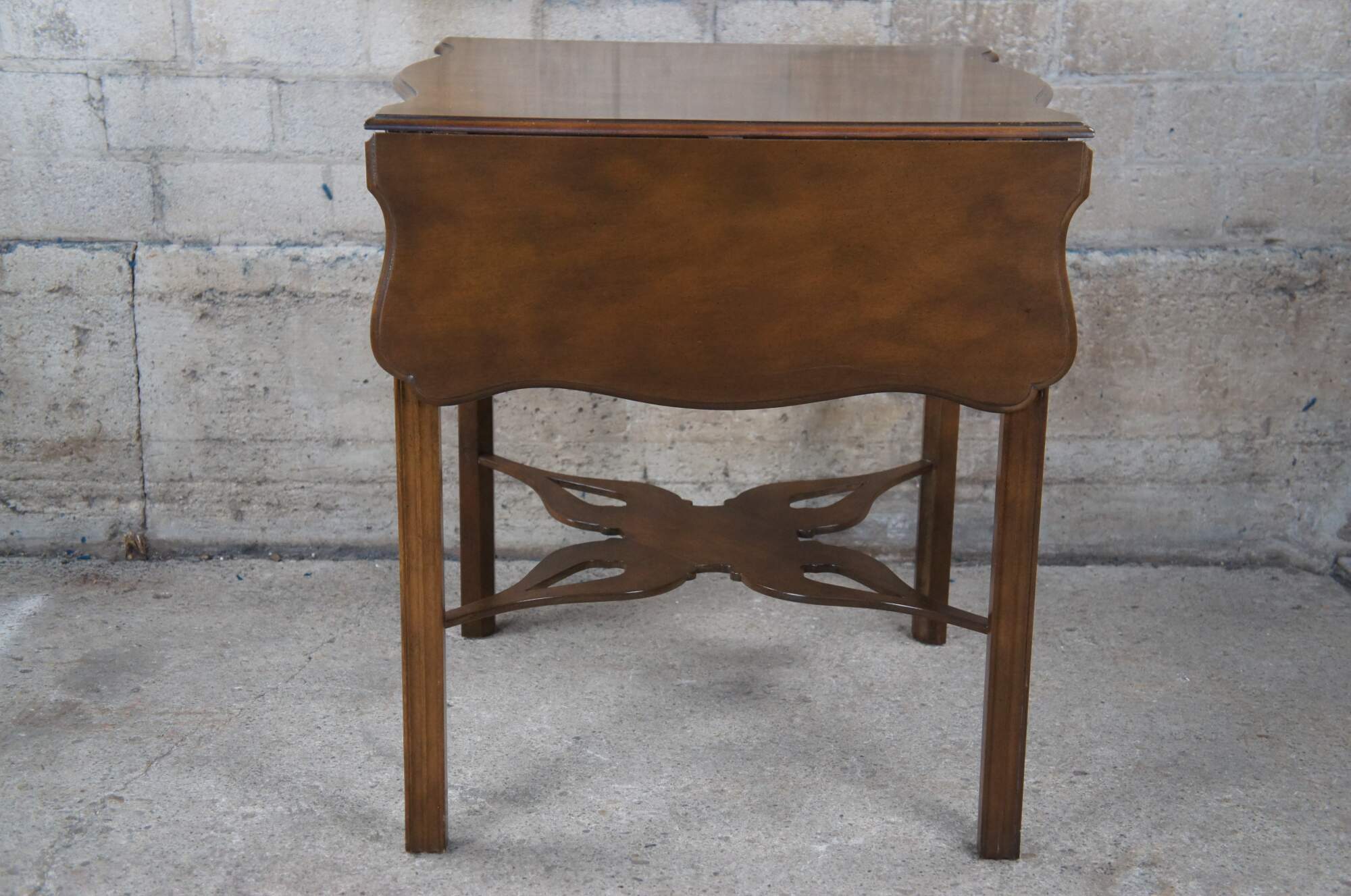 An impressive Baker Furniture Chippendale style mahogany pembroke table, circa 1970s. Featuring drop-leaf sides and a serpentine top with intricately carved open fretwork frieze. Supported by straight chamfered legs and joined by butterfly stretchers. Baker produced a very limited number of these tables as part of their historic Charlston collection. Supporting makers mark and limited edition badging underneath.