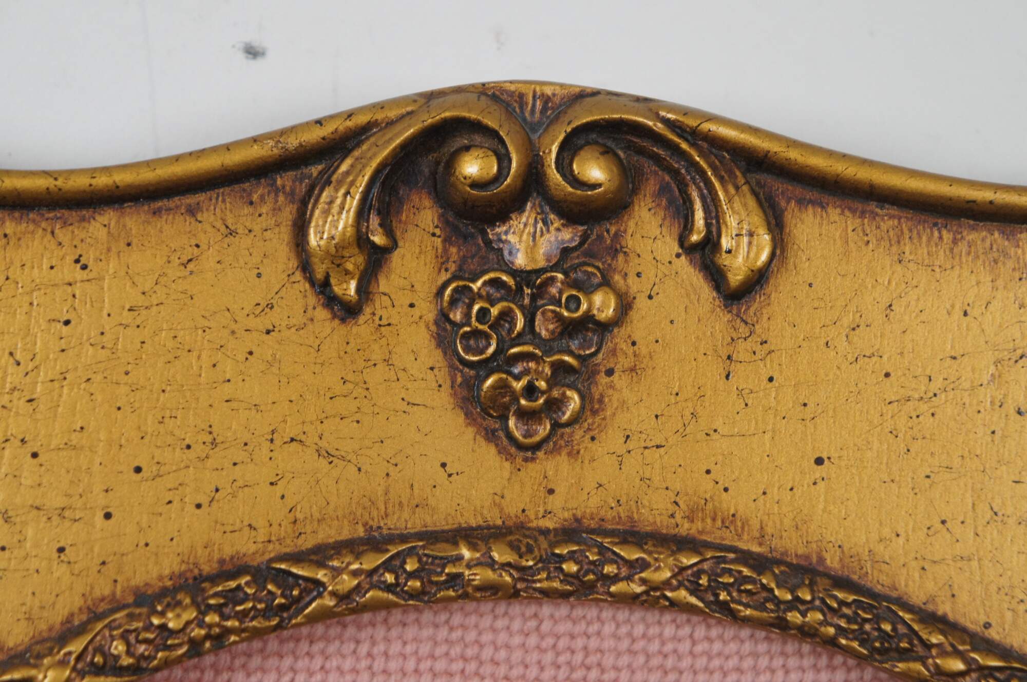 Vintage embroidered scene / tableau showing a young girl and older man in Regency era attire. After work by Jules Alexis Muenier, titled The Piano Lesson. Framed in a scalloped giltwood frame with ornate details.