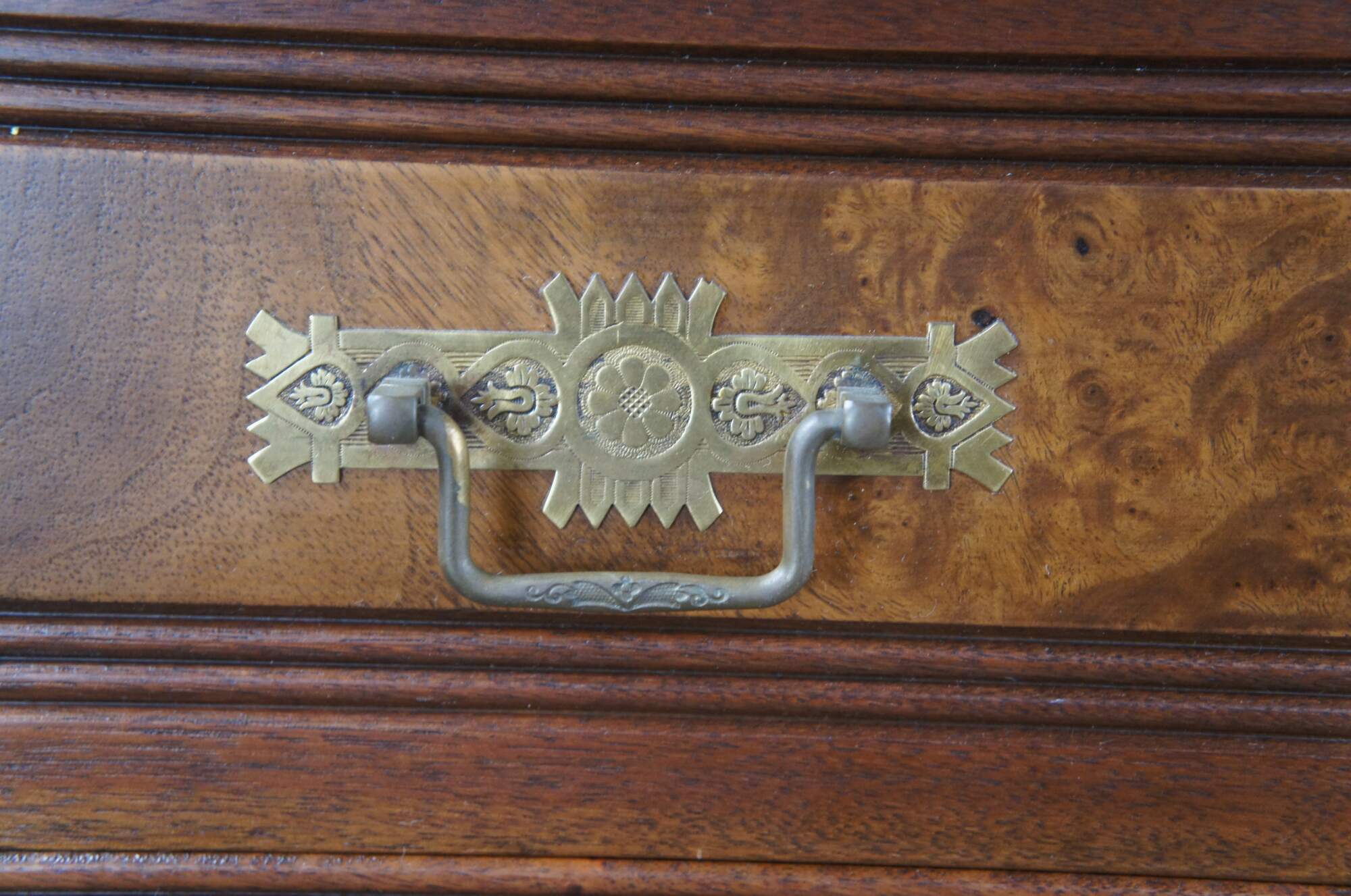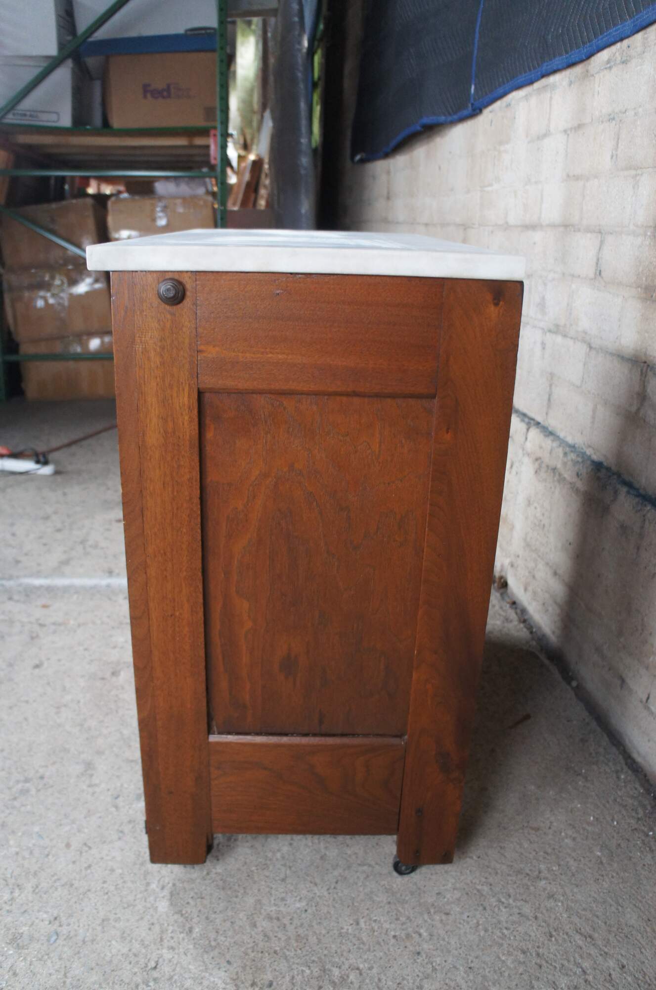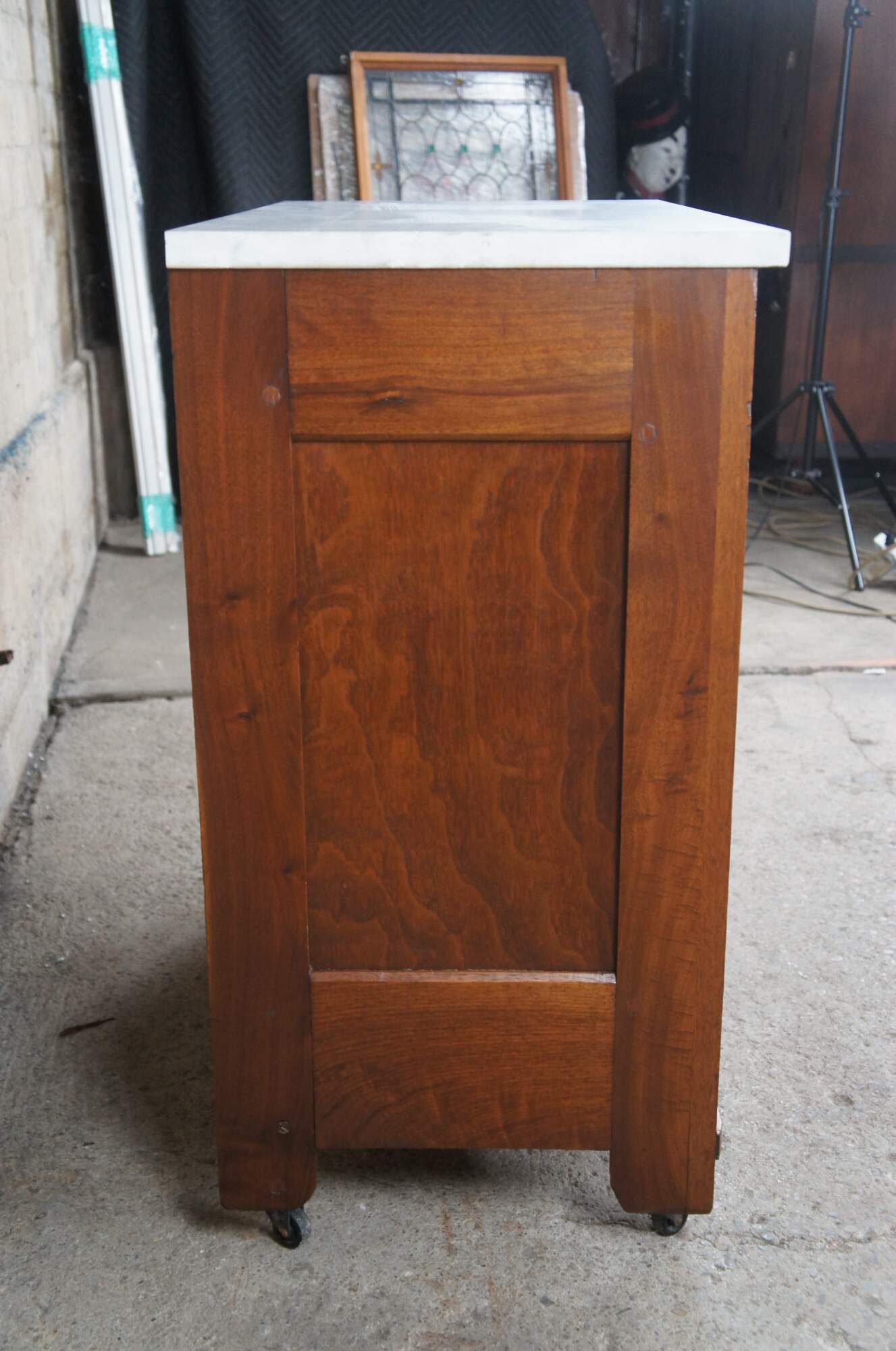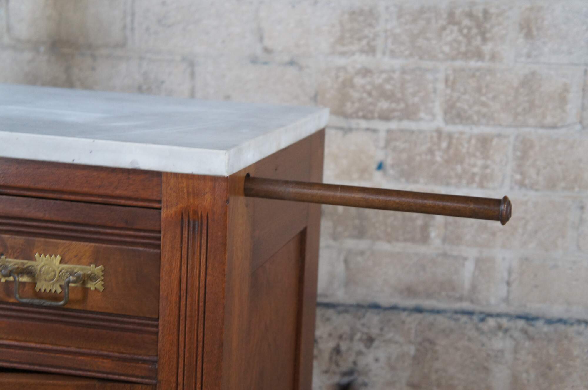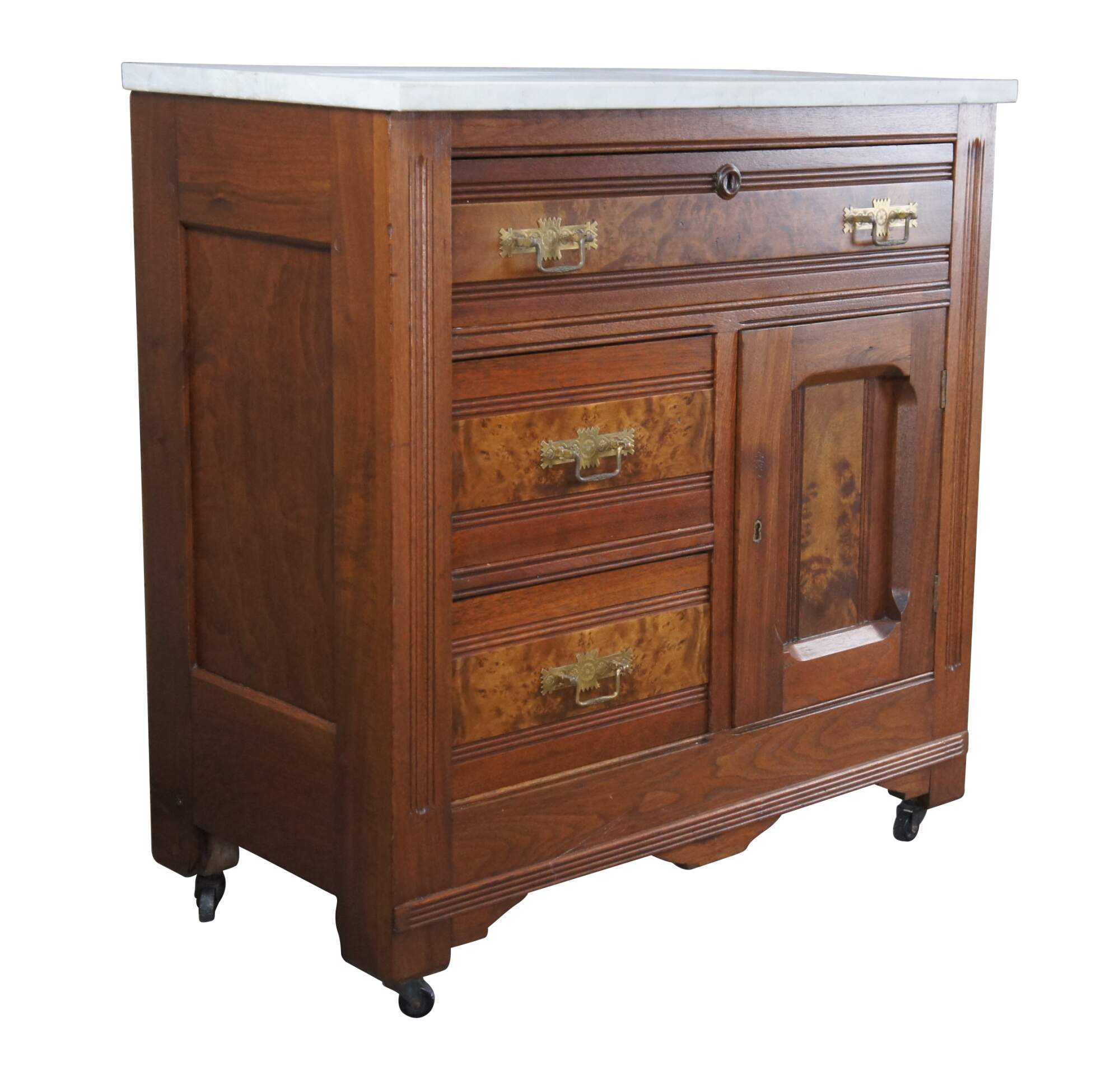 A lovely Victorian era washstand, circa 1880s. Made from walnut with burled and fluted panels. Features 3 drawers with Knapp Joint Dovetailing and a side cabinet for storage. Includes a while marble top, ornate brass drawer pulls, metal casters for ease of movement and a unique pullout bar for towels or rags.
