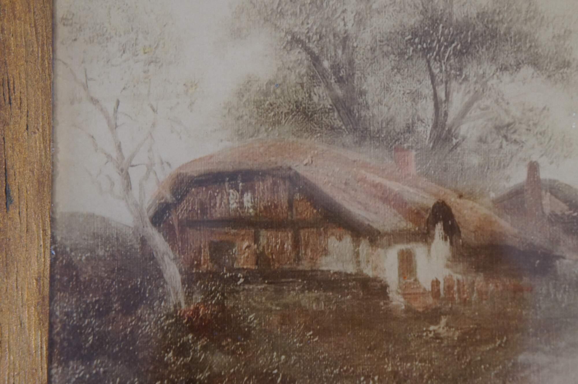 Antique landscape print showing a country road with Tudor cottage, horse cart, and figures in red. Print is mounted under a pane of glass and paired with a layered, carved giltwood frame.