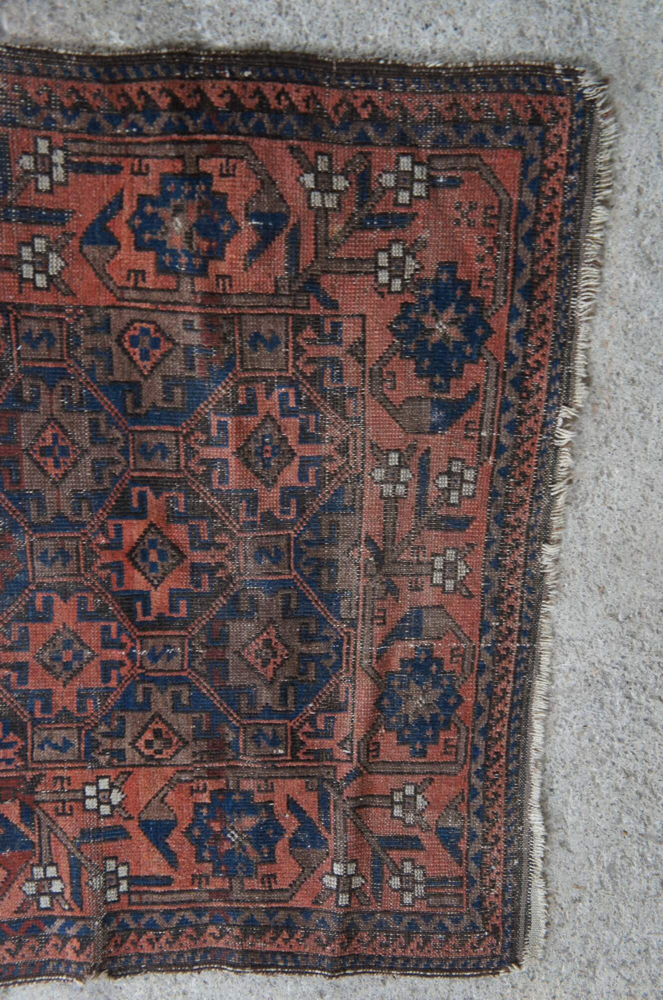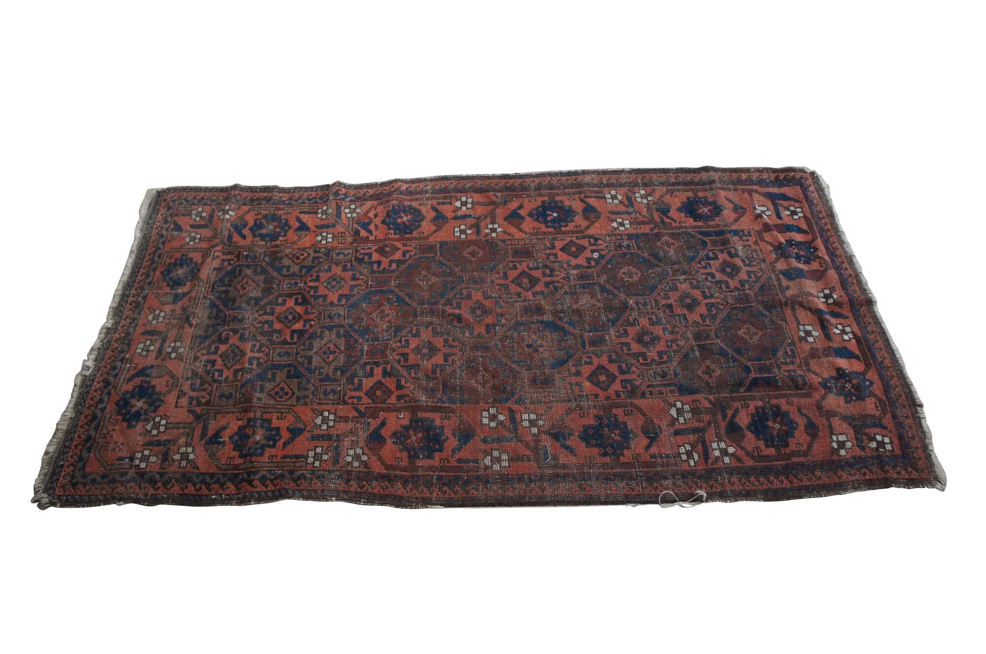 Red & Blue hand Woven wool prayer rug. Features floral accents and geometric medallions. 3 x 5