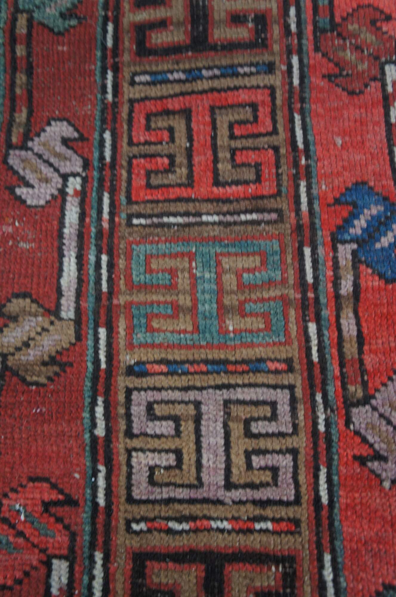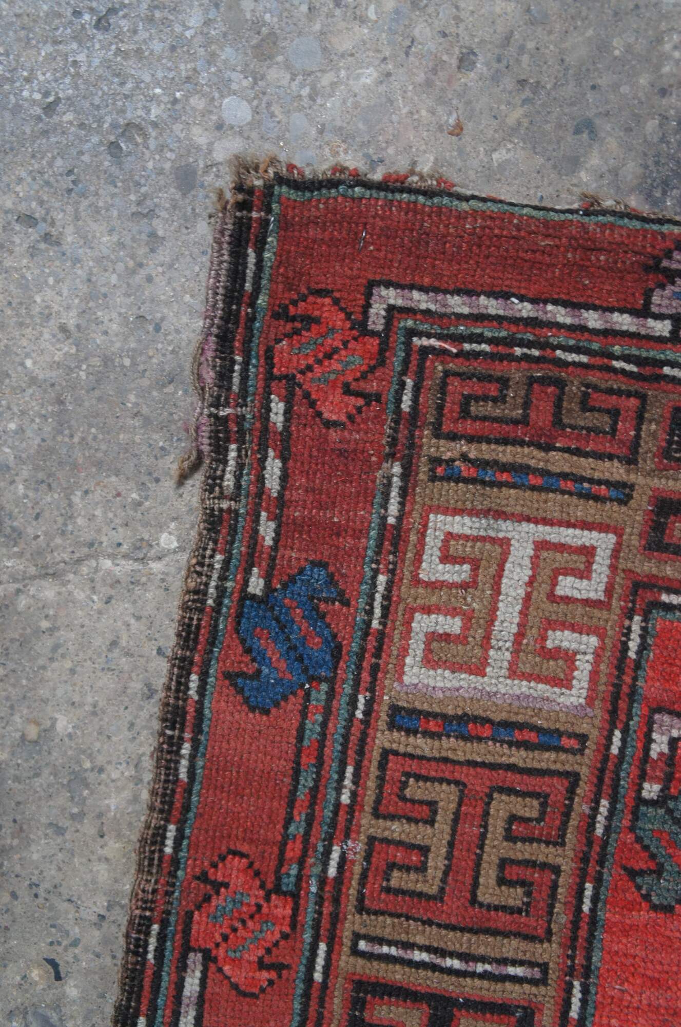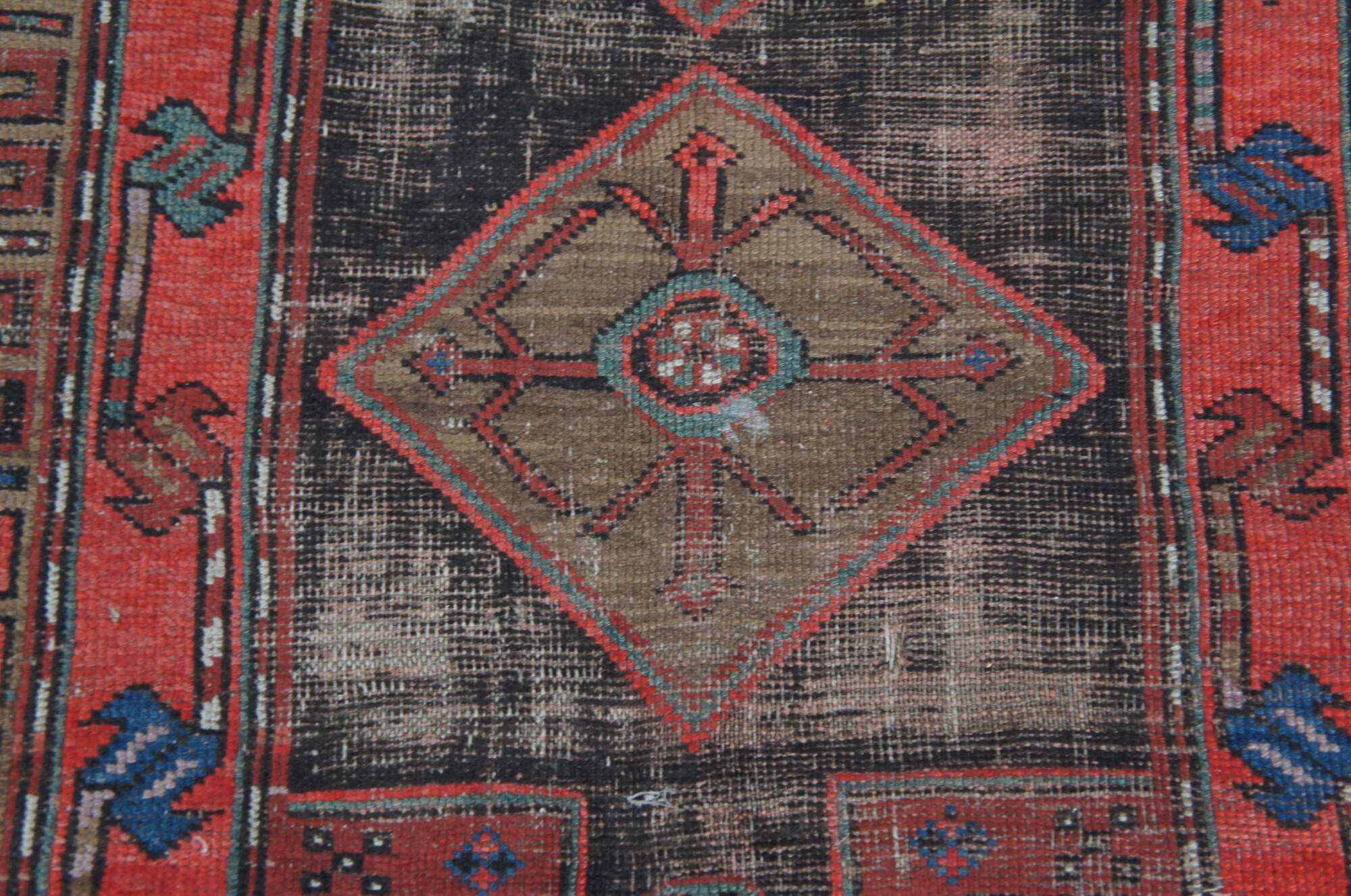 Red & Blue hand Woven wool prayer rug. Features a diamond geometric field with framed in alternating color # signs. 3'3" x 4'6