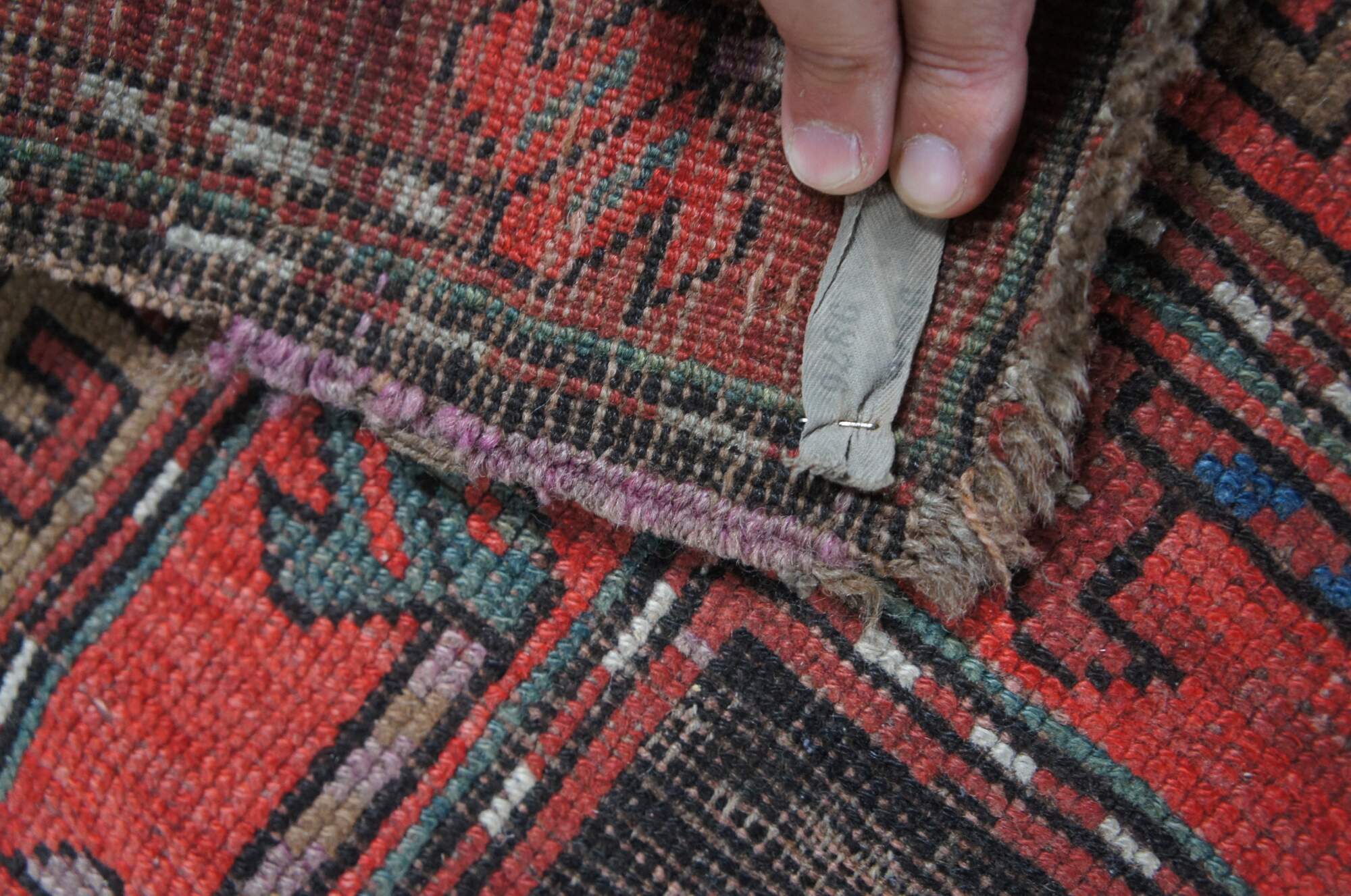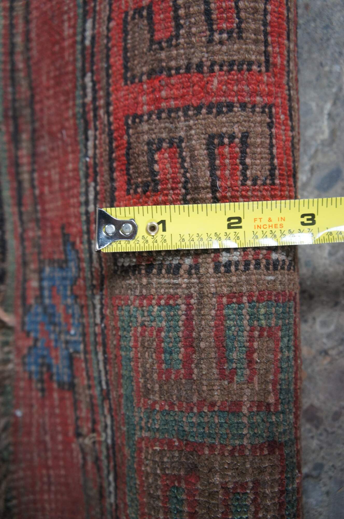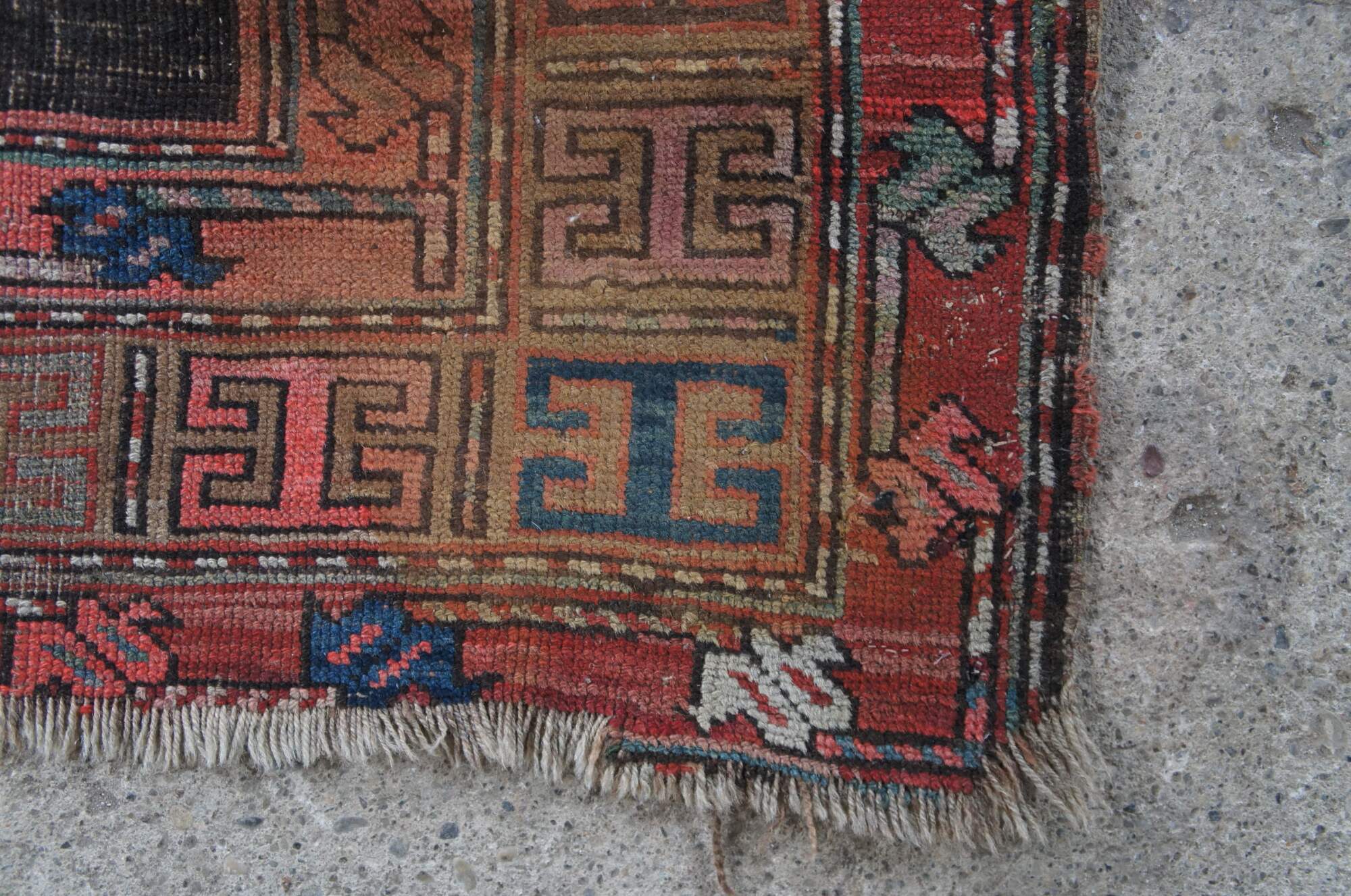 Red & Blue hand Woven wool prayer rug. Features a diamond geometric field with framed in alternating color # signs. 3'3" x 4'6