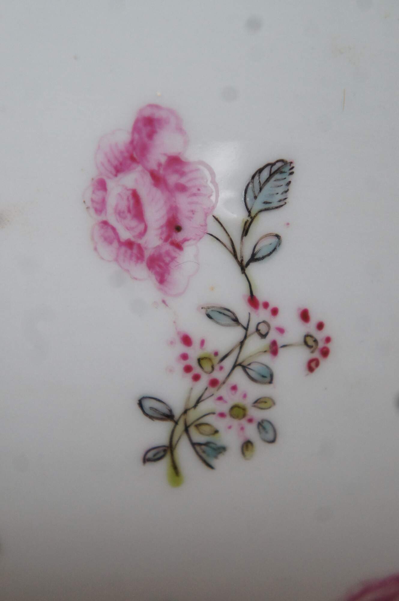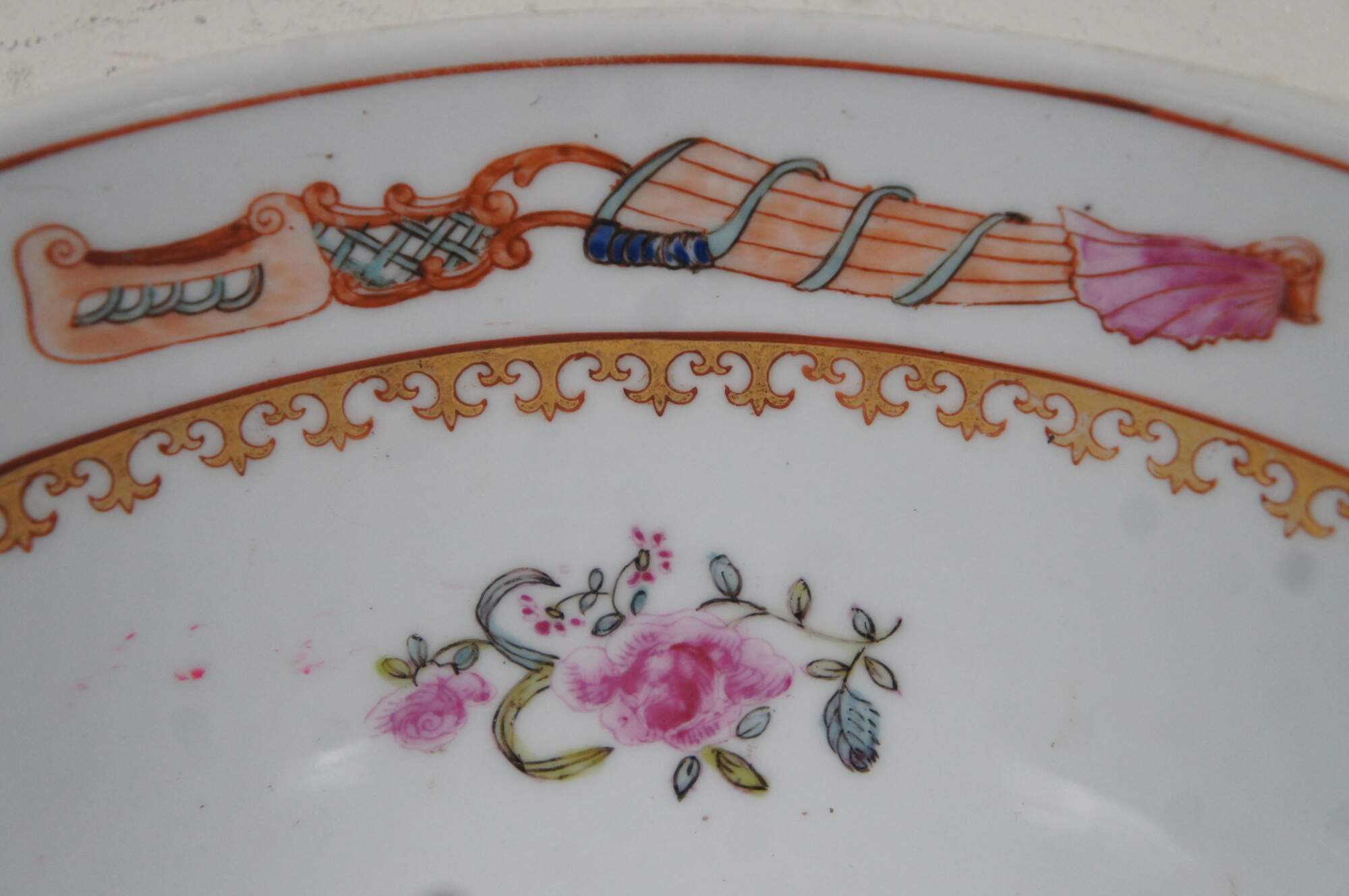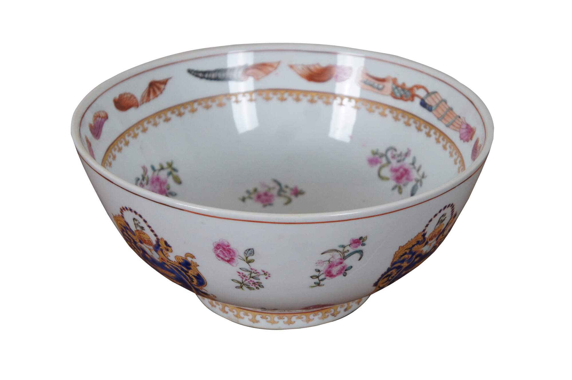 A large and impressive antique Chinese Export porcelain punch bowl featuring a gold and blue armorial coat of arms style crest with fish and dog figures, accented with pink roses, blue stars and an interior border of sea shells.