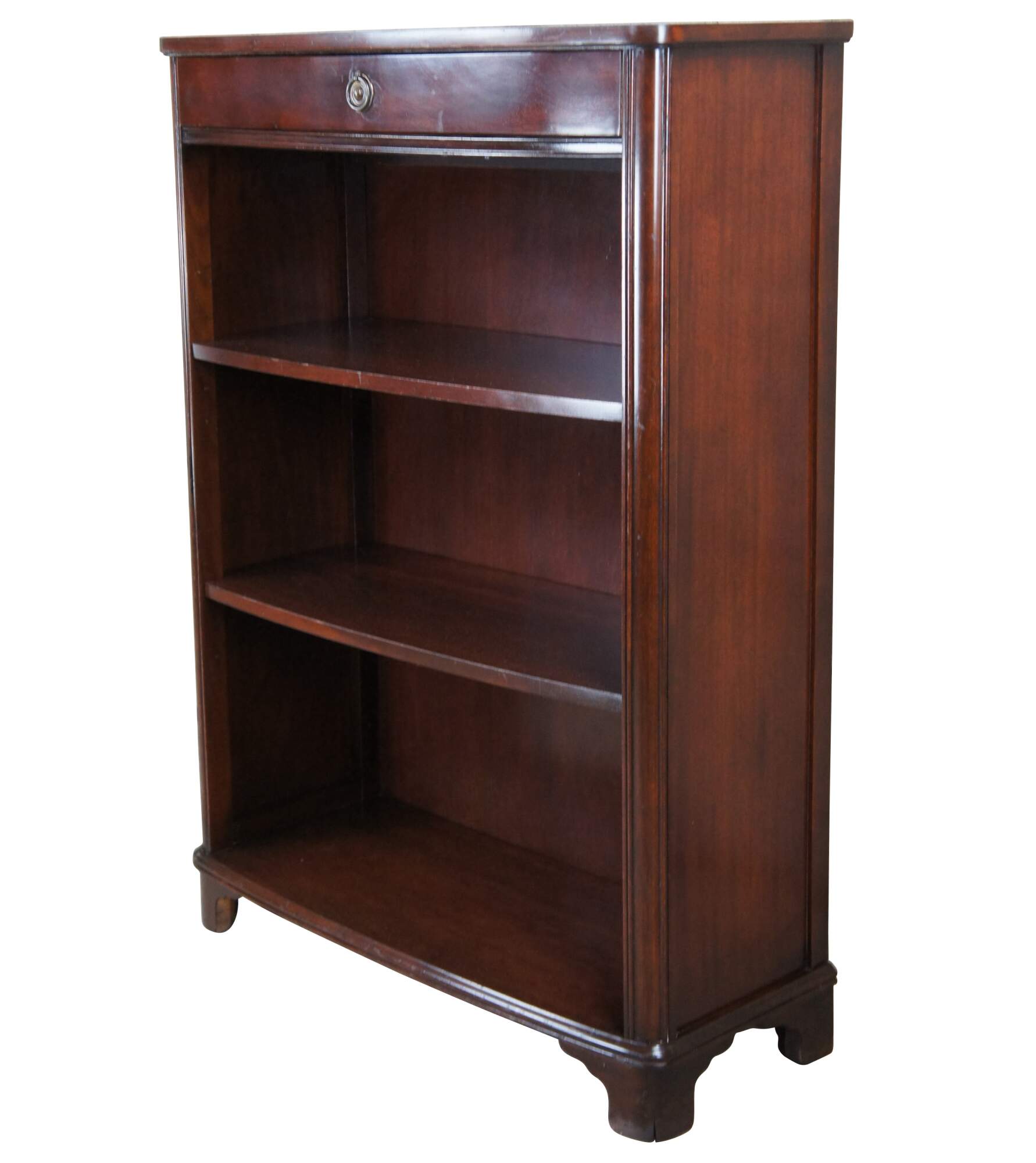 Sligh-Lowry petite mahogany bookcase or console, circa 1960s. Features a petite rectangular form with two adjustable shelves and an upper dovetailed drawer with a brass sheraton style pull. Great for use in an entryway, living room or library.