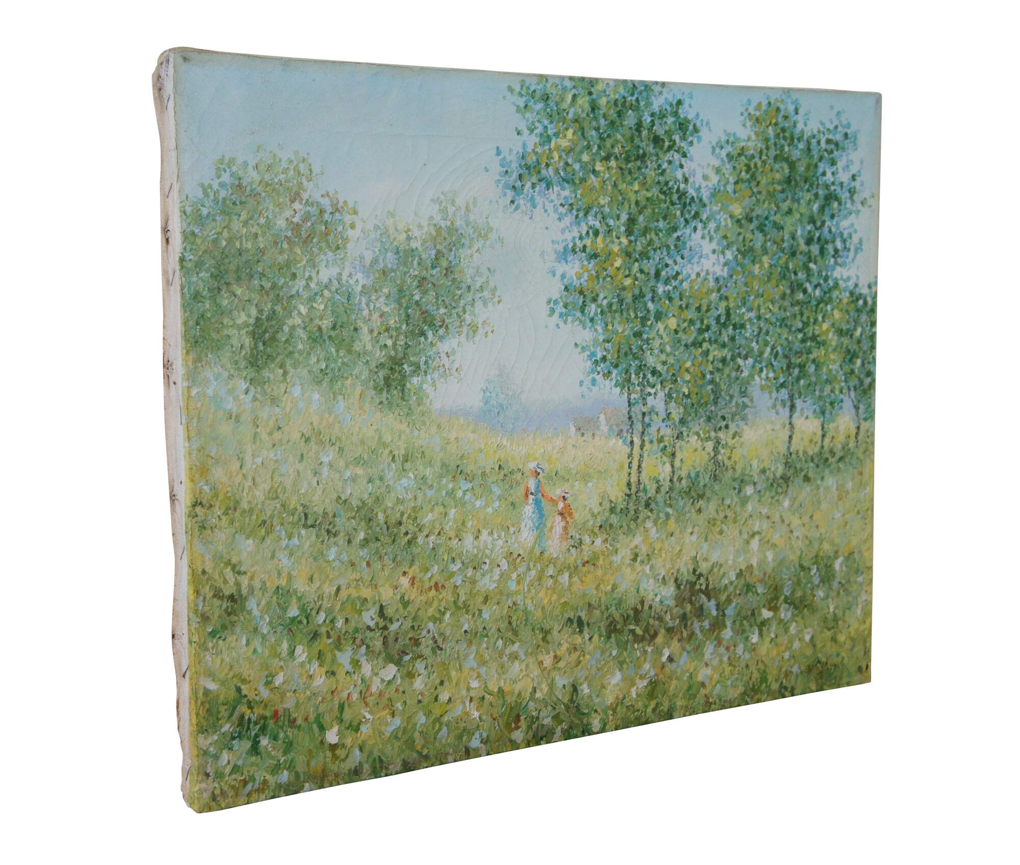 Vintage original Impressionist landscape oil painting on canvas showing a green field with trees and a pair of figures walking toward a cottage. Signed lower right, V. Noorole (Nookole / Noopole?).